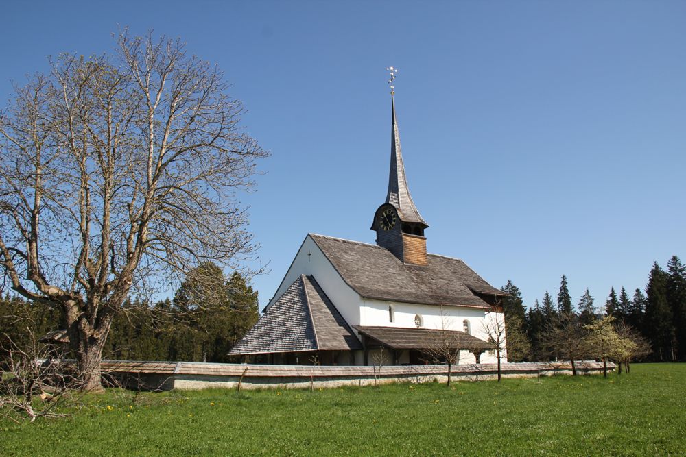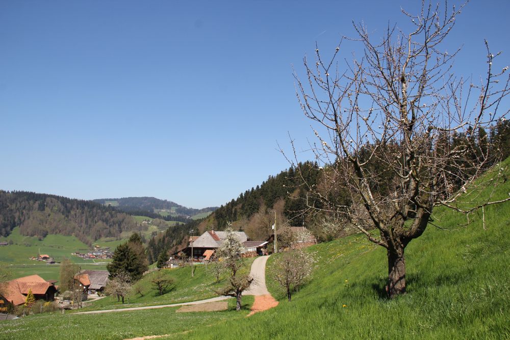 Der Einstieg in den Wanderweg ist in der Nähe der Kirche. Auf einem Graspfad geht es gleich hinauf am Waldrand und über Wiesen nach Würzbrunnen 958m, wo das Kirchlein Würzbrunnen steht, eine beliebte Hochzeitskirche (kommt in Gotthelf Filmen vor) die über 1000 Jahre alt ist.