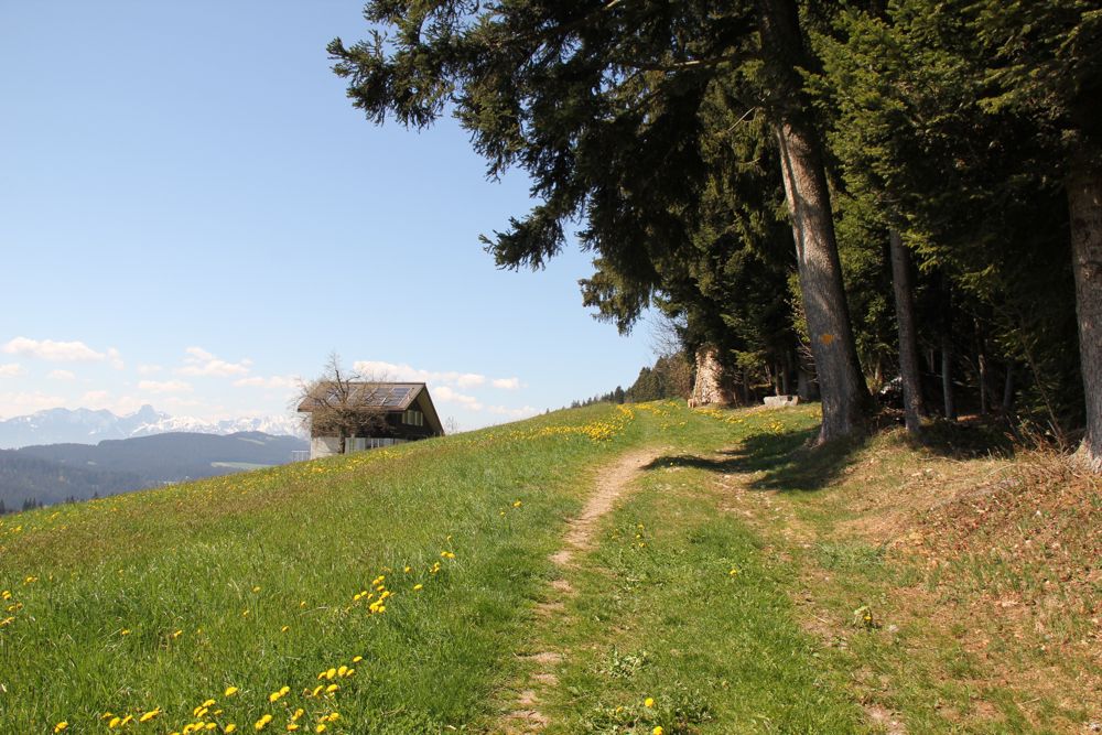 Nach dem Restaurant geht es rechts in den Wald, wo der Pfad hinunter in ein Bachtobel führt und auf der anderen Seite hinauf nach Looch ( einige Häuser an der Fahrstrasse) Nach einer Linkskurve beim Paradisli steige ich links auf einem Wiesenpfad gerade hinauf zum Waldrand(Lipelee). Ich gehe dem Waldrand entlang mit grossartiger Sicht auf die Berge ( Schrattenfluh, Hohgant ). Auf einem Bänklein mache ich Pause, um zu essen und das Panorama zu geniessen, das heute nicht sehr deutlich ist) .