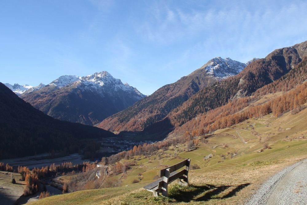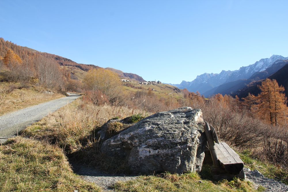 Ich ruhe mich auf einer Bank aus und halte meine Mittagsrast. Von hier aus habe ich eine prächtige Sicht auf die andere Talseite mit der grau- weissen Bergkette der sog. Engadiner Dolomiten und den Weiler Bos-cha.