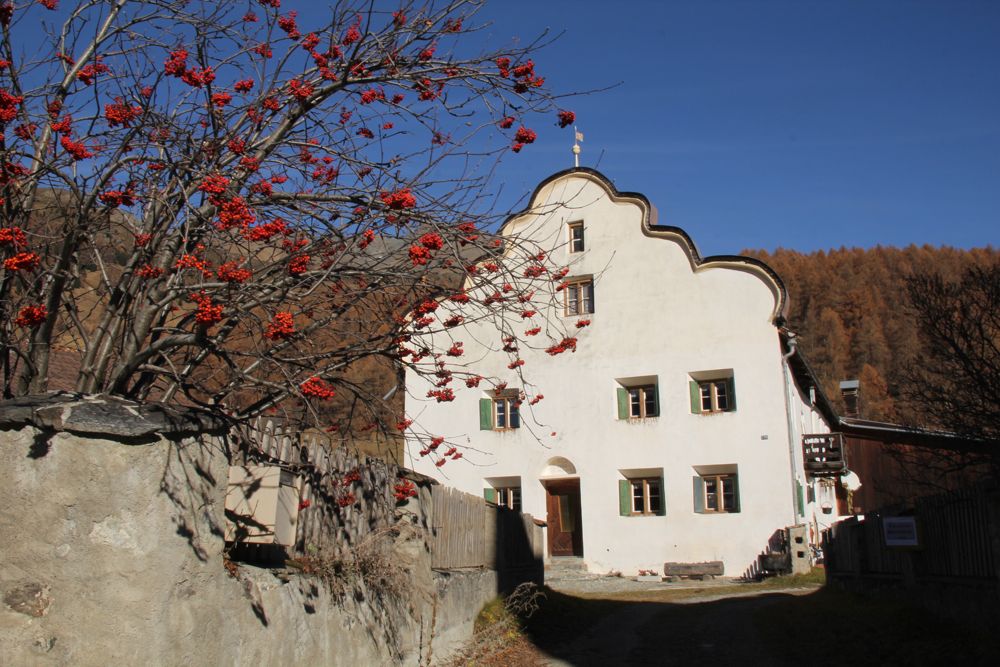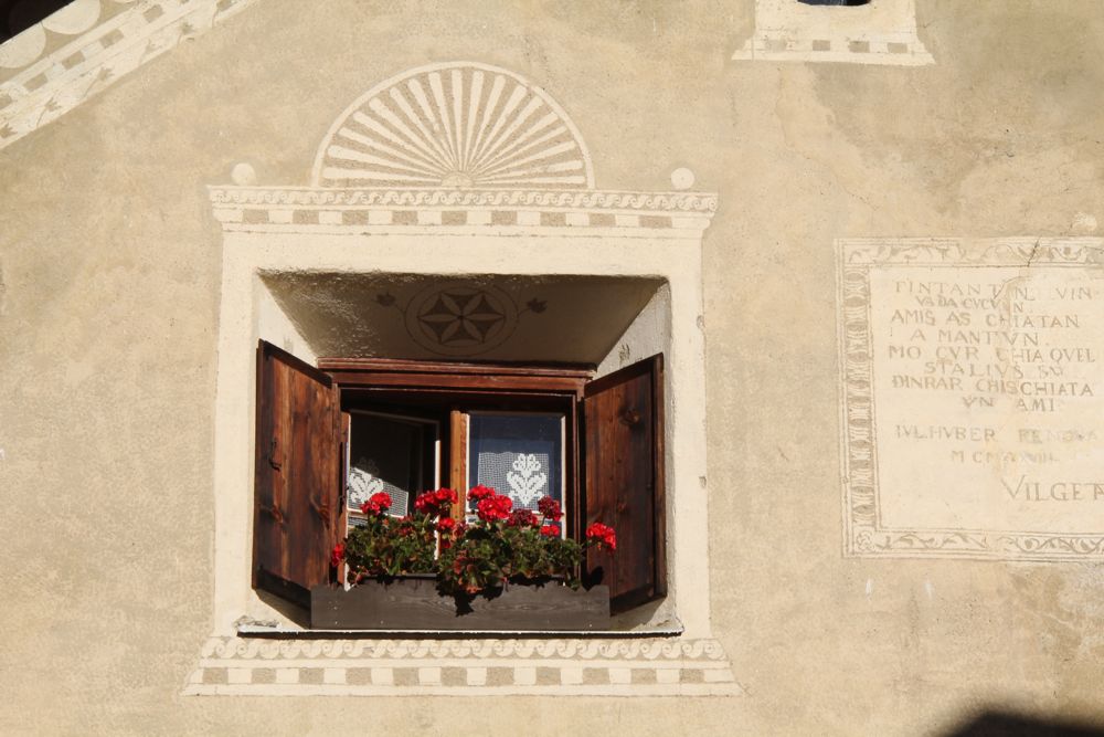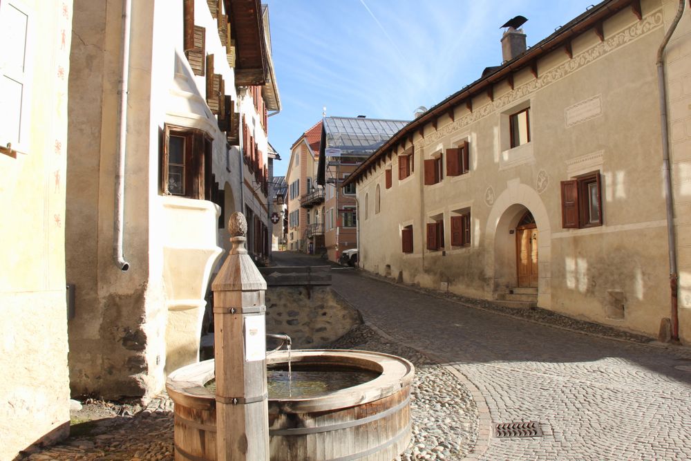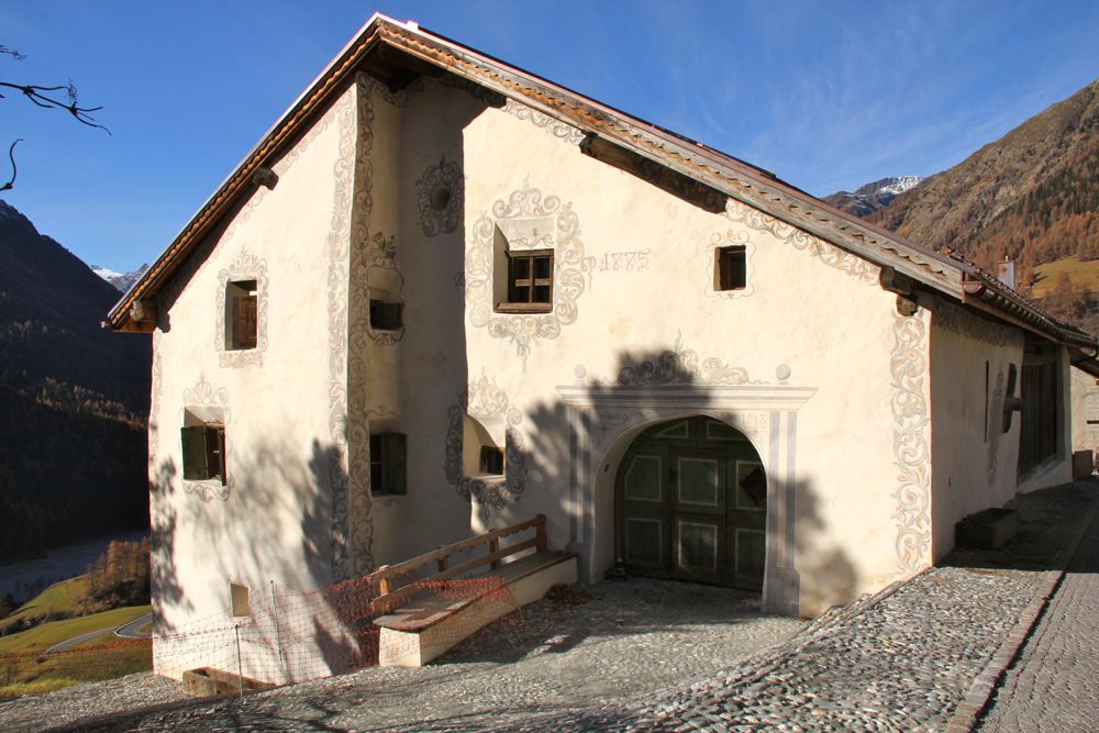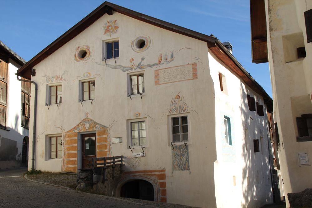 Ich beginne die Wanderung in Lavin um 10.00 h und muss lange auf einer Fahrstrasse (Naturbelag) gehen. Eg geht leicht bergauf. In der Ferne sehe ich bereits das erste Ziel, das Dorf Guarda. Bis ich aber dort bin, geht es noch eine Weile, denn ich muss über Resgia in den Taleinschnitt des Baches La Clozza wandern. Vor Guarda 1654m 10.53 h gibt es einen geteerten Fussgängerweg, der parallel zur Strasse ins Dorf führt. Hier mache ich etliche Bilder von den stattlichen Engadinerhäusern.