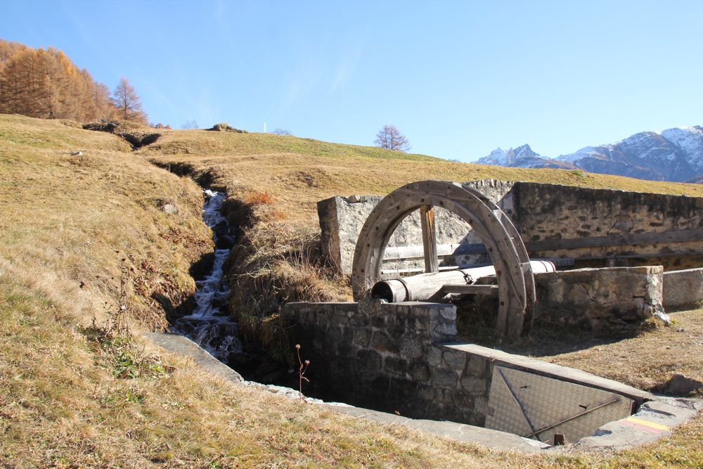 Ich steige dann auf den Weiden Prasarinun wieder hinunter auf die geteerte Fahrstrasse, der ich nun folge. Nach einer Kurve kann ich wieder auf einen Wanderweg wechseln, der mich zur Kreuzung bringt, von wo ich hinuntergekommen wäre. Nun gehe ich von Pra Mulin ( daher sehe ich ein altes Mühlrad!!) auf der Strassse zum Weiler Bos-cha.