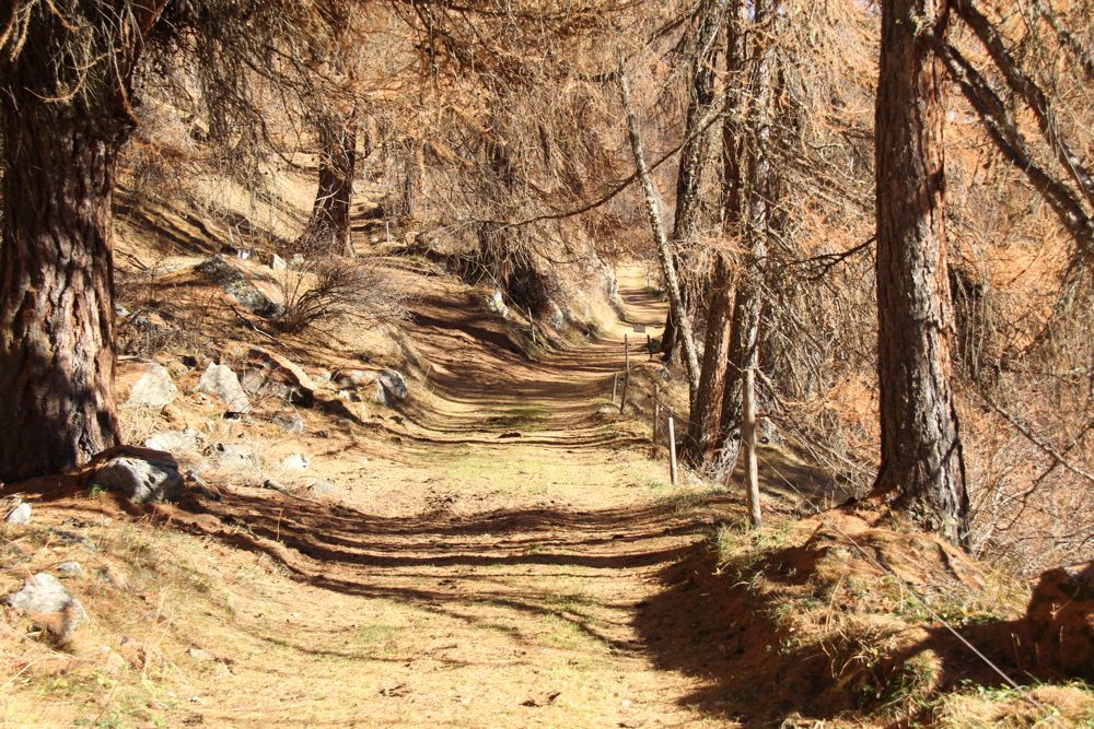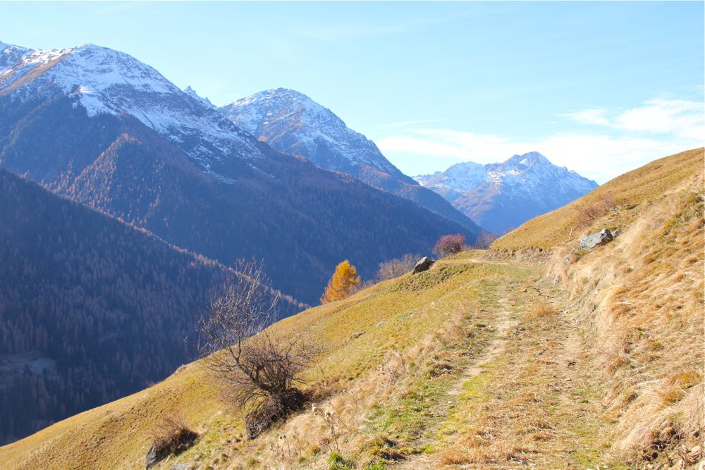 Nach Guarda gehe ich den Hang hinauf und folge den roten Stecken, die mich aber nicht auf den eigentlichen Wanderweg bringen. Dafür hätte ich früher abzweigen sollen und höher hinaufsteigen müssen.