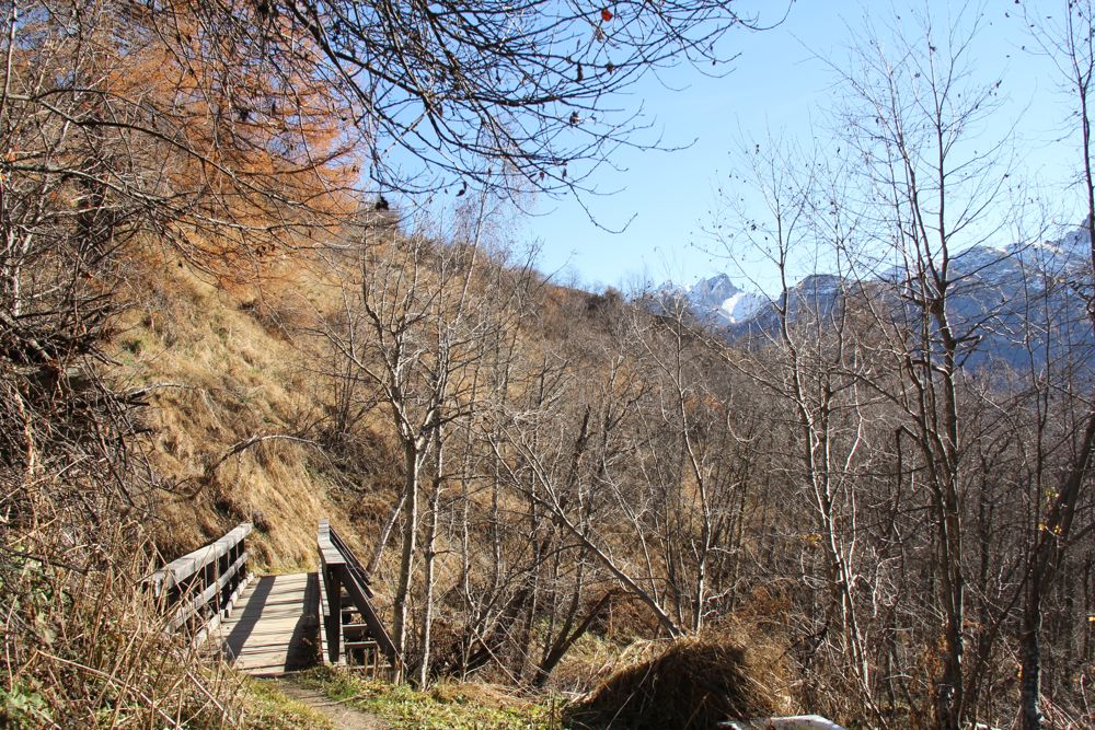 Der Weg führt nun in den tiefen Taleinschnitt des Baches Tsanan hinein und ich muss wieder ein Stück auf der Strasse gehen!. Nach der Brücke biege ich aber auf den Wanderweg ab, der mich oberhalb der Strasse durch den Bergwald gegen Ftan bringt.