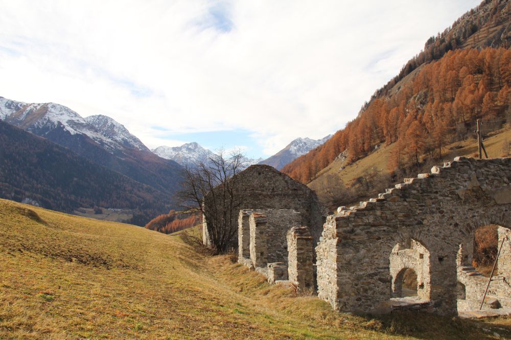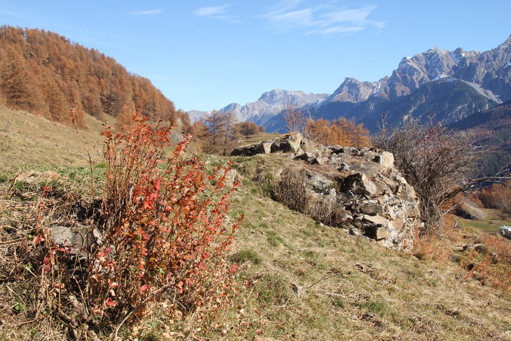 Ich wandere nun auf Weiden hoch über Ardez auf breiten Wegen im Gebiet Strada hinauf zur Ruina Chanoua, einer ehemaligen alten Sust aus dem 9. Jh. Ich gehe also auf der ehemaligen Strasse, Via Imperiale Como- Tirol und auch auf dem heutigen Jakobsweg.