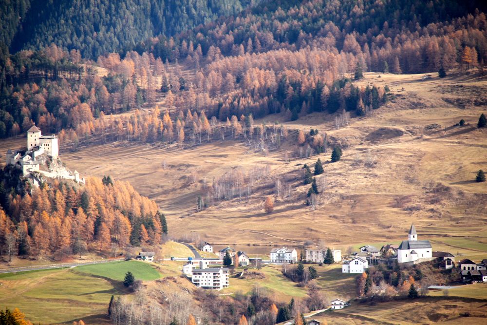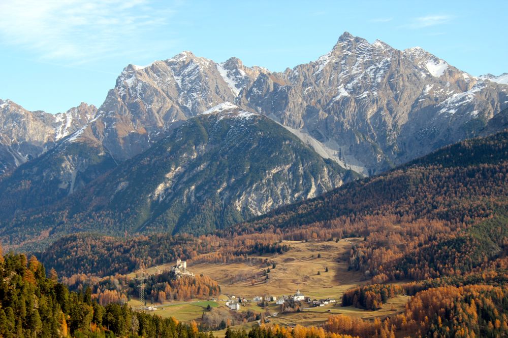 Die ganze Kette der Unterengadiner Dolomiten liegt vor mir und auf der anderen Talseite sehe ich das Schloss Tarasp, wo ich vor nicht langer Zeit war.
