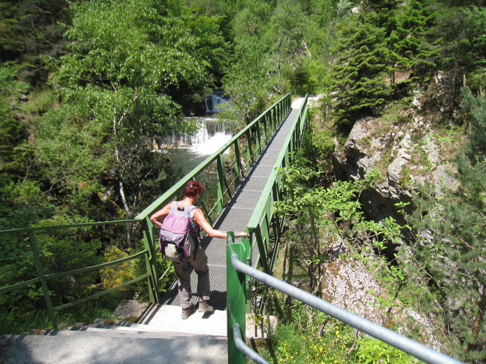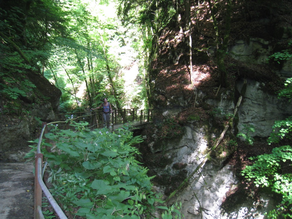 Wir wandern in der kühlen Schlucht über viele Treppen und Brücken und wechseln hin und wieder das Ufer der Areuse. Hier gibt es sehr viele Picknickplätze. Auch wir lassen uns zu gegebener Zeit am Ufer die Areuse nieder, um unseren Mittagshalt zu halten und dem Rauschen des Flusses zu lauschen. Es gibt dann eine Strecke auf Teer, die aber wieder zu einem Wanderweg wird und zur Steinbrücke über die Areuse führt. Der letze Abschnitt nach Noraigue fällt uns an der heissen Sonne etwas schwer.