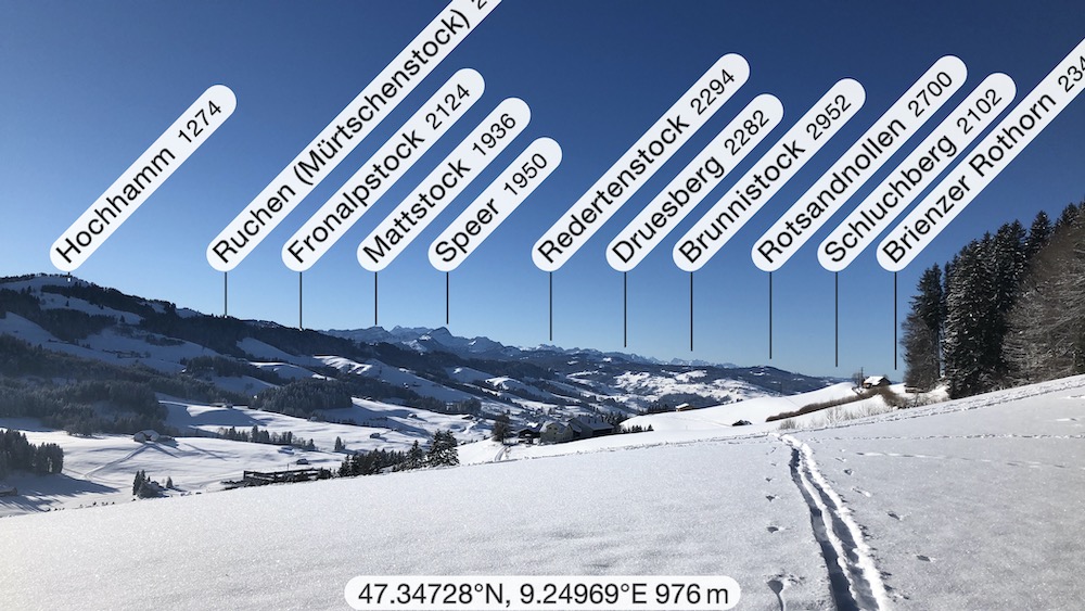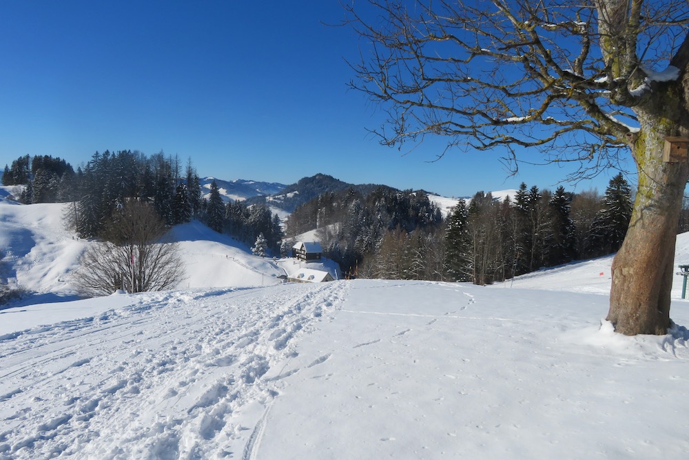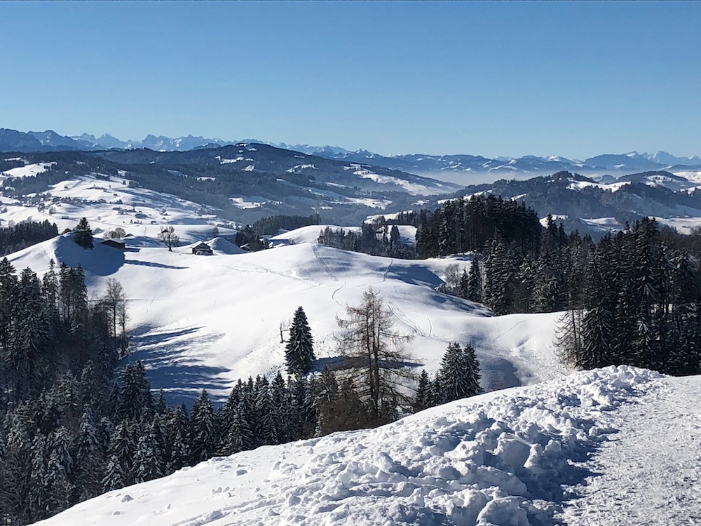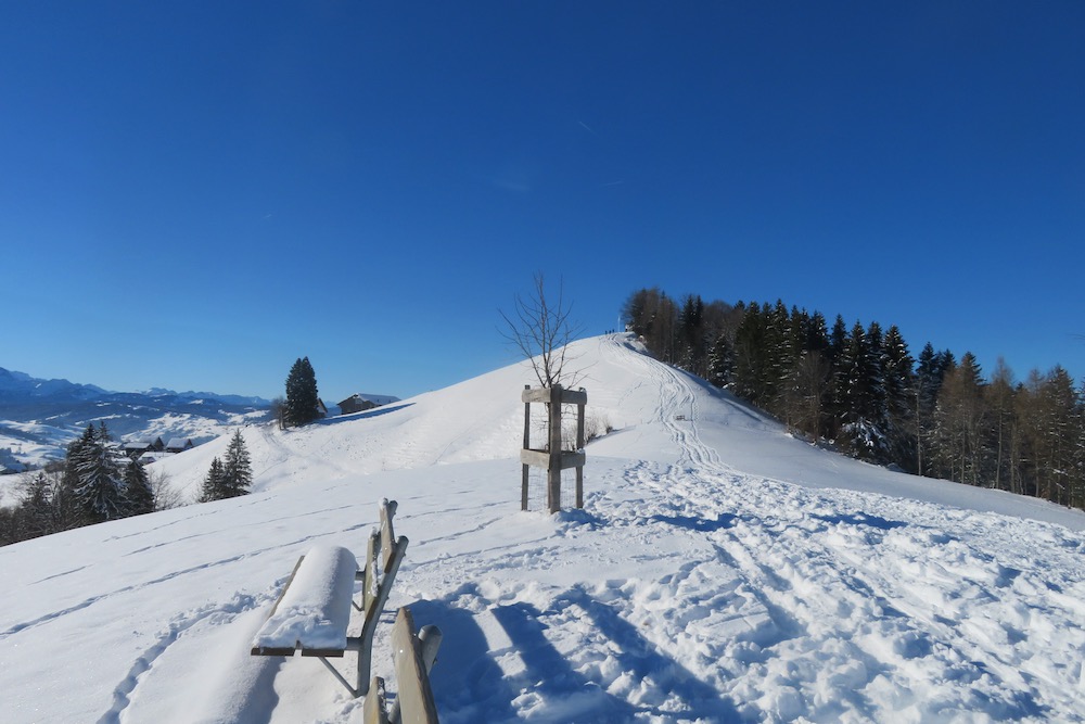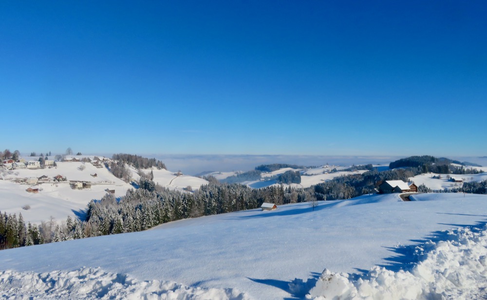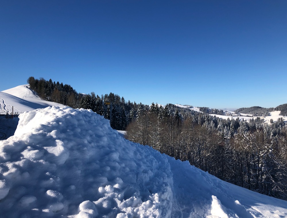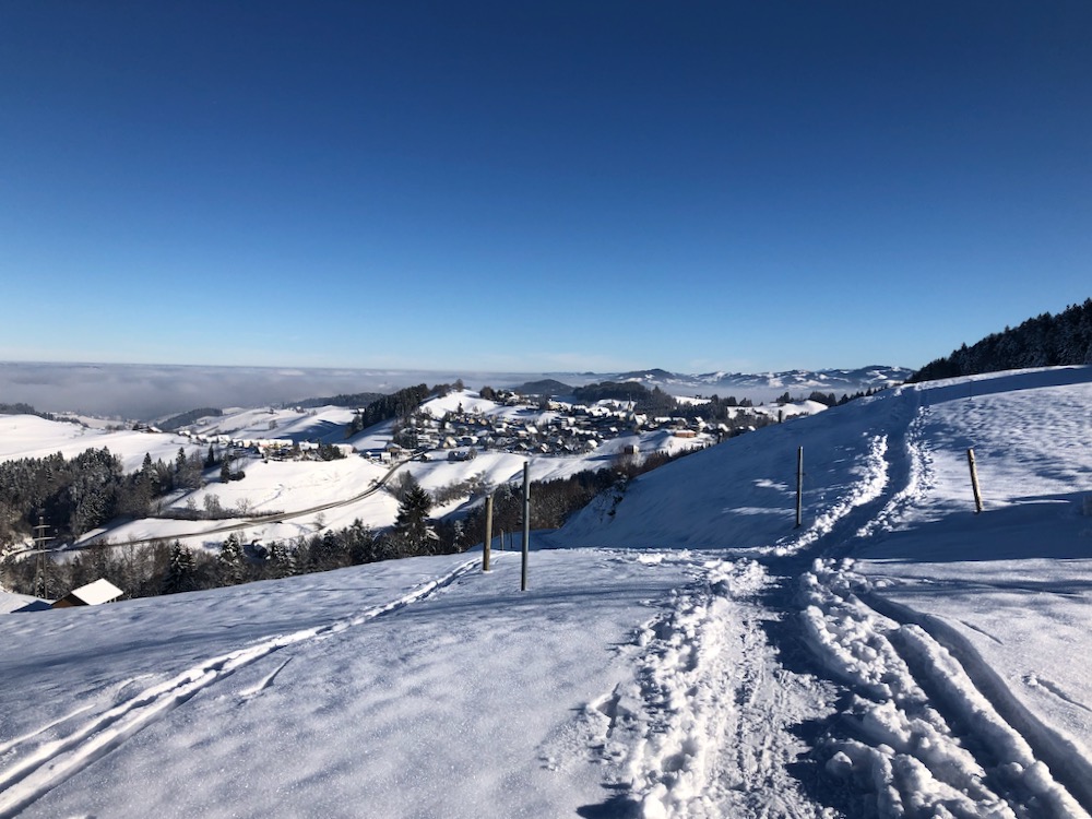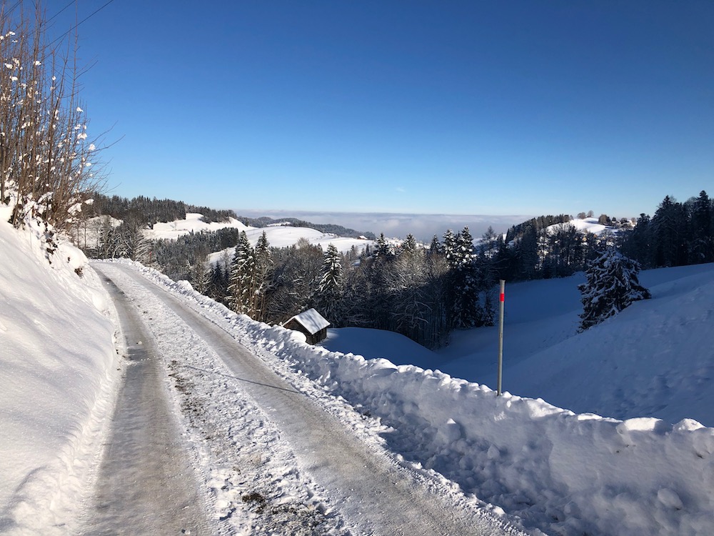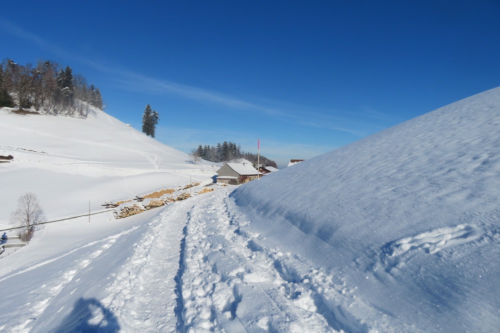 Heute fahre ich das erste Mal in diesem Winter in die Ostschweiz, um zu sehen, wieviel Schnee es dort hat. Ich bin positivüberrascht als ich in Schwellbrunn Halden ankomme. Bald finde ich den Einstieg in den Trail und ich steige auf die Anhöhe bei Högg, von wo es es weiter hinauf in den Wald und hinüber zum P.1003m geht, wo ich die Strasse nach Risi queren muss. Ich folge kurz einem Strässhen, um den hinauf zum Betreuungsheim Risi zu steigen. Weiter geht es hinauf an einem Aussichtspunkt vorbei zum Restaurant Sitz. Ich habe immer eine prächtiges Panorama vor mit. Ich sehe die ganze Säntisklette bis hinüber zum Speer und bis zur Wilkethöhe. Beim Skilift steige ich hinunter nach Landscheidi. Nun wendet sich der Pfad nach rechts und fährt durch den tiiefverschneiten Winterwald hinüber in offenes Gebiet. Ich komme bei Ghör und Nidergaden vorbei. Nun gelange ich auf eine Strasse bei Steirisle. Ich habe bis dahin keinen Ort für eine Halt gefunden. Nun muss ich endlich etwas essen und trinken. Wo der Pfad wieder den Gegenhang hinaufführt, setze ich mich in den Schnee, um auszuruhen. Denn nun habe ich noch einen Aufstieg nach Rötschwil vor mir.