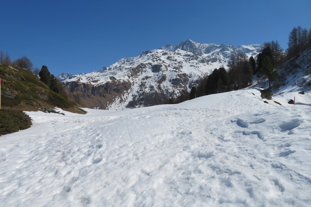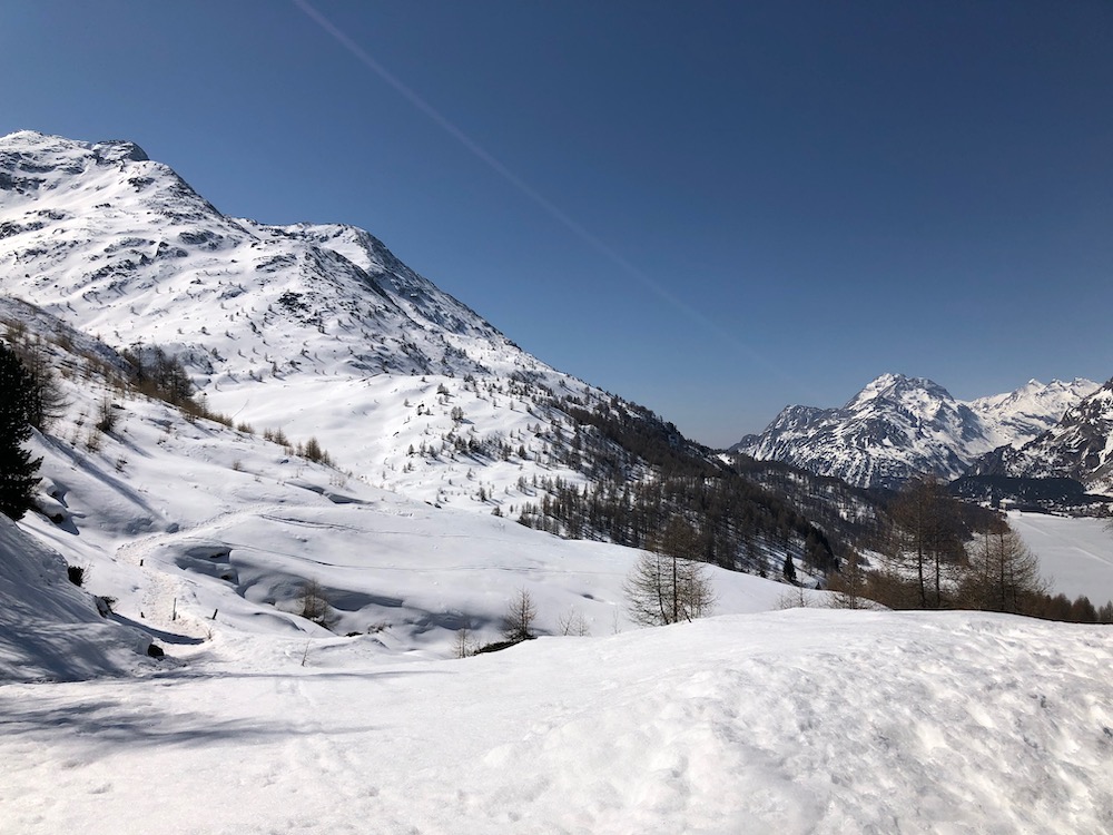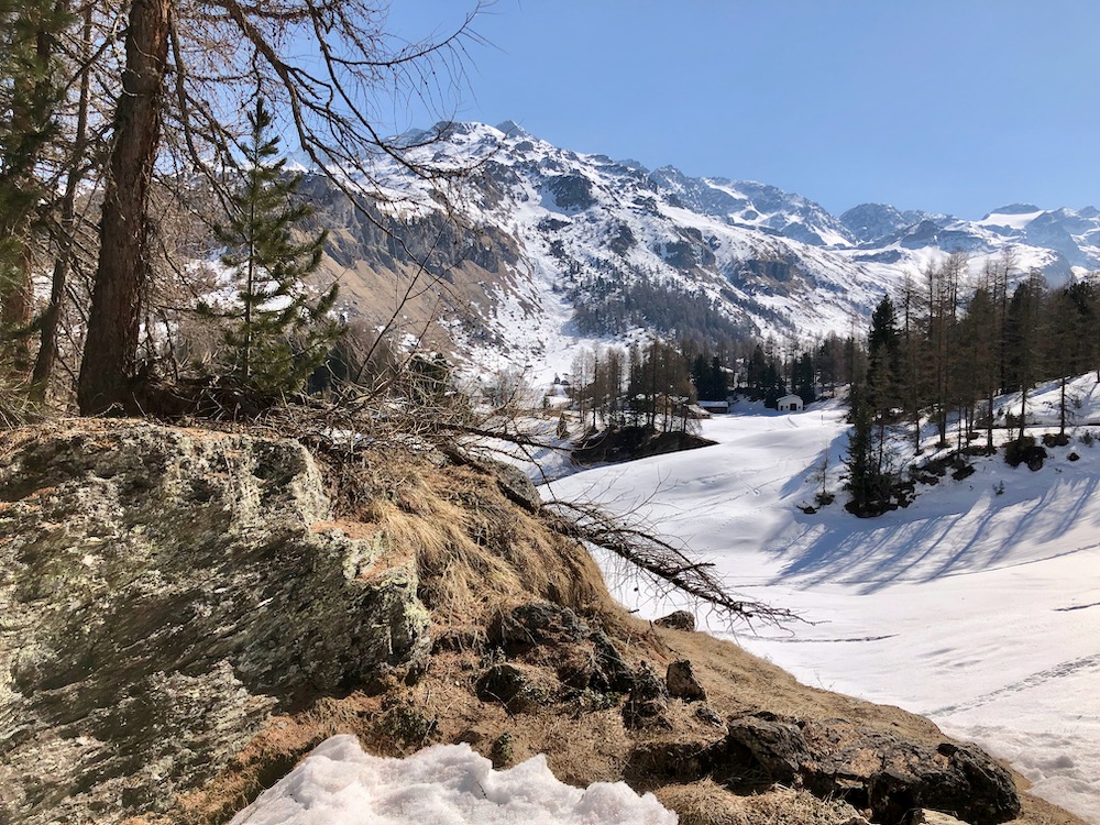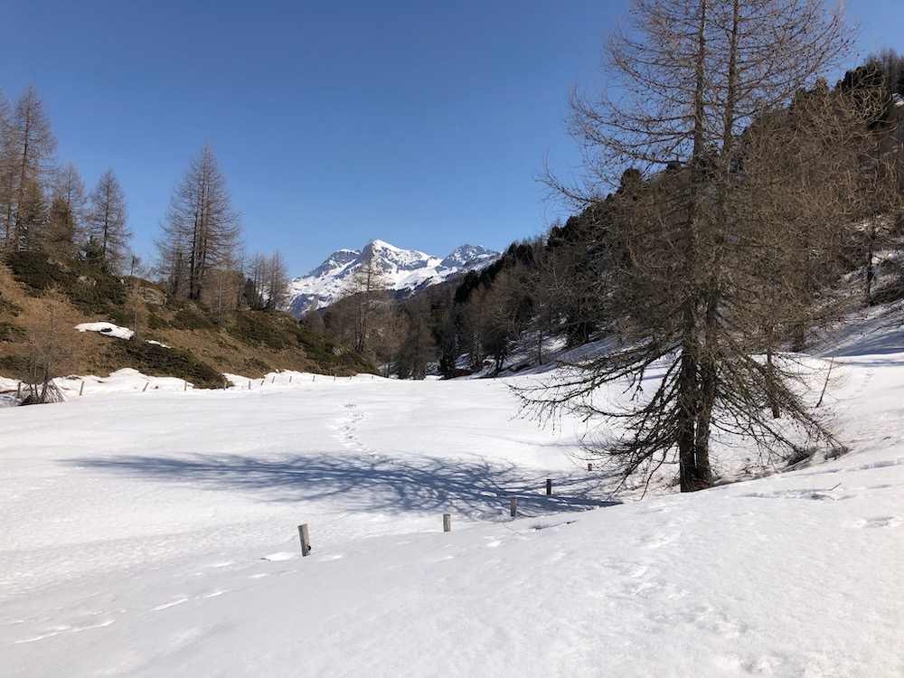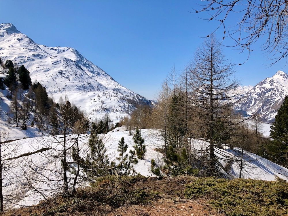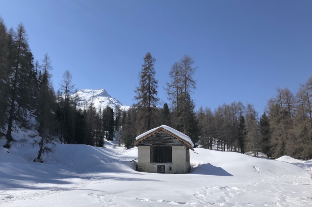 Kurz schaue ich bei der schönen Kapelle vorbei und steige dann hinunter nach Fex Platta, ein Ort, der mit vielen Erinnerungen verknüpft ist. Über den bereits aperen Schlichtweg erreiche ich Sils Maria und auch gleich den Bus nach Pontresina.
