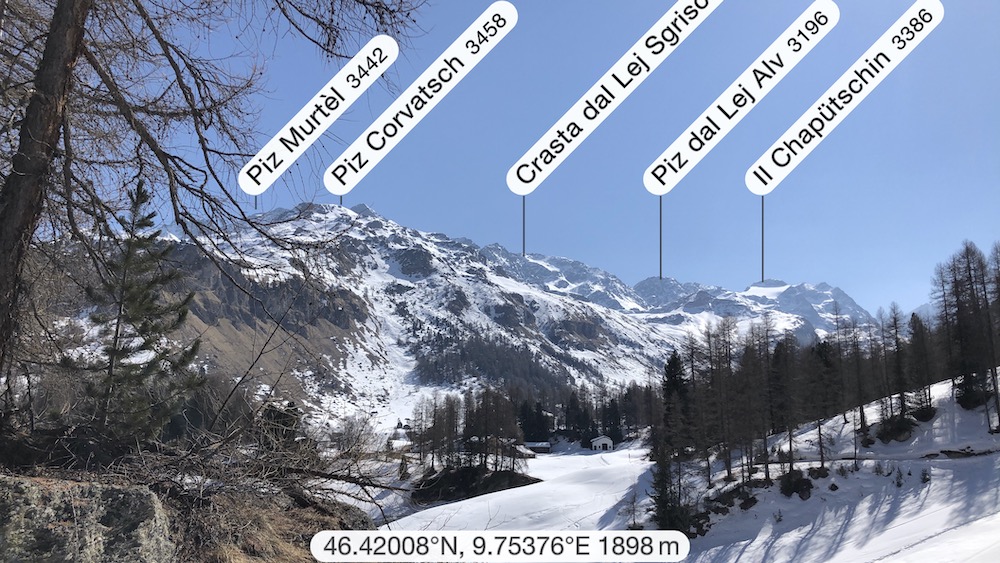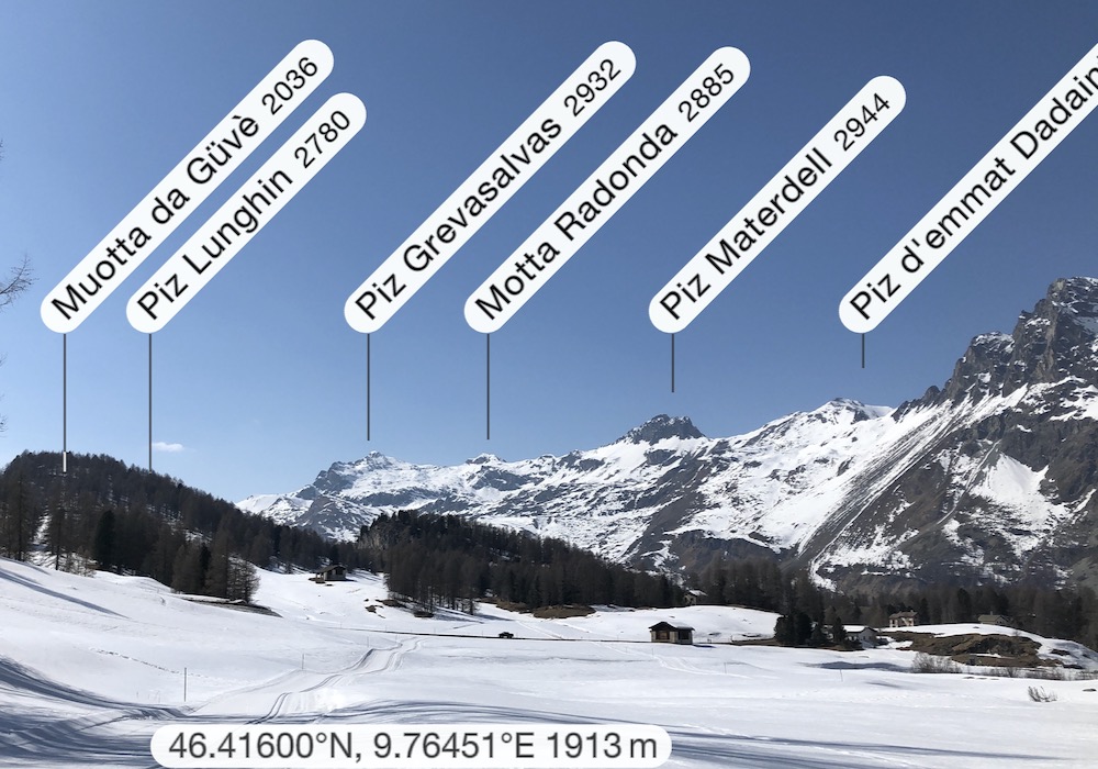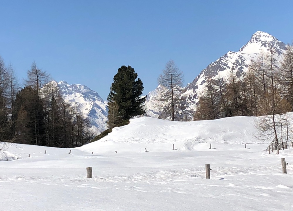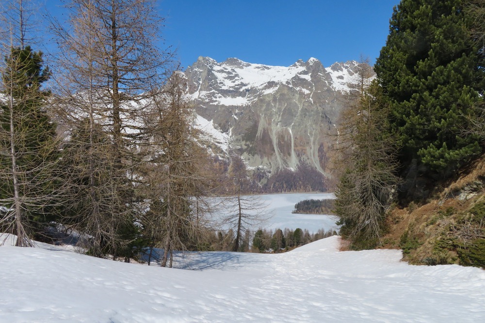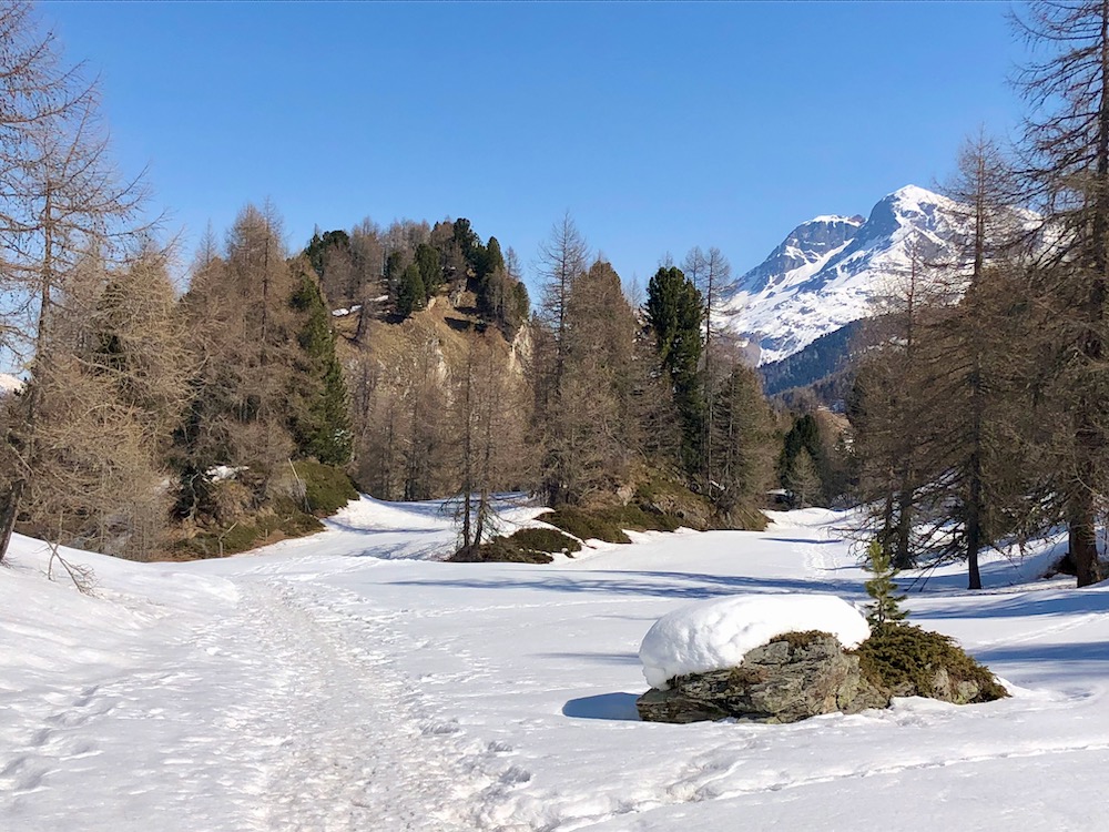 Ich beginne meine Wanderung in Sils Maria. Am Ufer des Silsersees beginnt links der Schneeschuhtrail, dem ich nun folge. Gleich geht es recht steil hinauf. Ich komme dann an einem Aussichtspunkt ins Fextal vorbei. Winter geht durch den Wald und über einige einsam gelegenen Lichtungen. Ich erreiche dann den Aussichtspunkt, den ich bereits kenne. Von hier kann man über den Silsersee und nach Maloja blicken. Nach einer Fotopause folge ich dem Trail hinauf auf eine Anhöhe. Hier stehe ich am Rande des Val Fedox, das beherrscht wird von dem mächtigen Piz da la Margna 3159m. Der Trai lwendet sich nun nach links und bringt mich auf eine weitere Anhöhe, von wo aus der Blick frei wird ins Fextal. Hier steht ein Wanderwegweiser. Links von mir sehe ich den Grat des Motta da Güvè 2035m. Bei einem aperen Felsabsatz muss ich die Schneeschuhe ausziehen. Oben steht eine Holzbank, der ideale Ort für eine lange Mittagspause !ch geniesse die Stille und Einsamkeit dieses Ortes.
