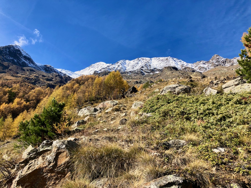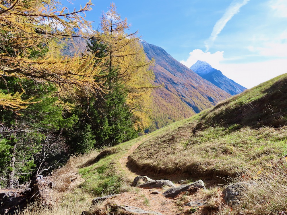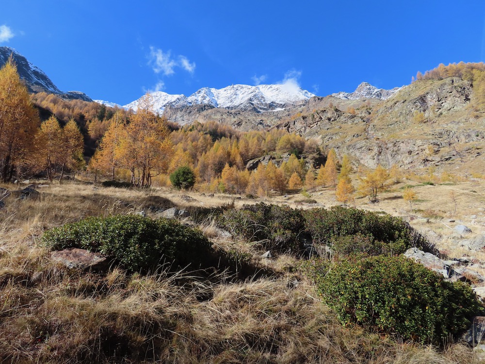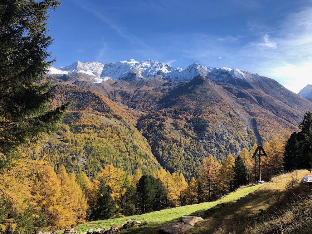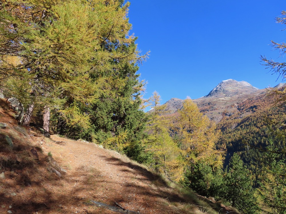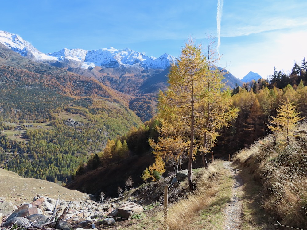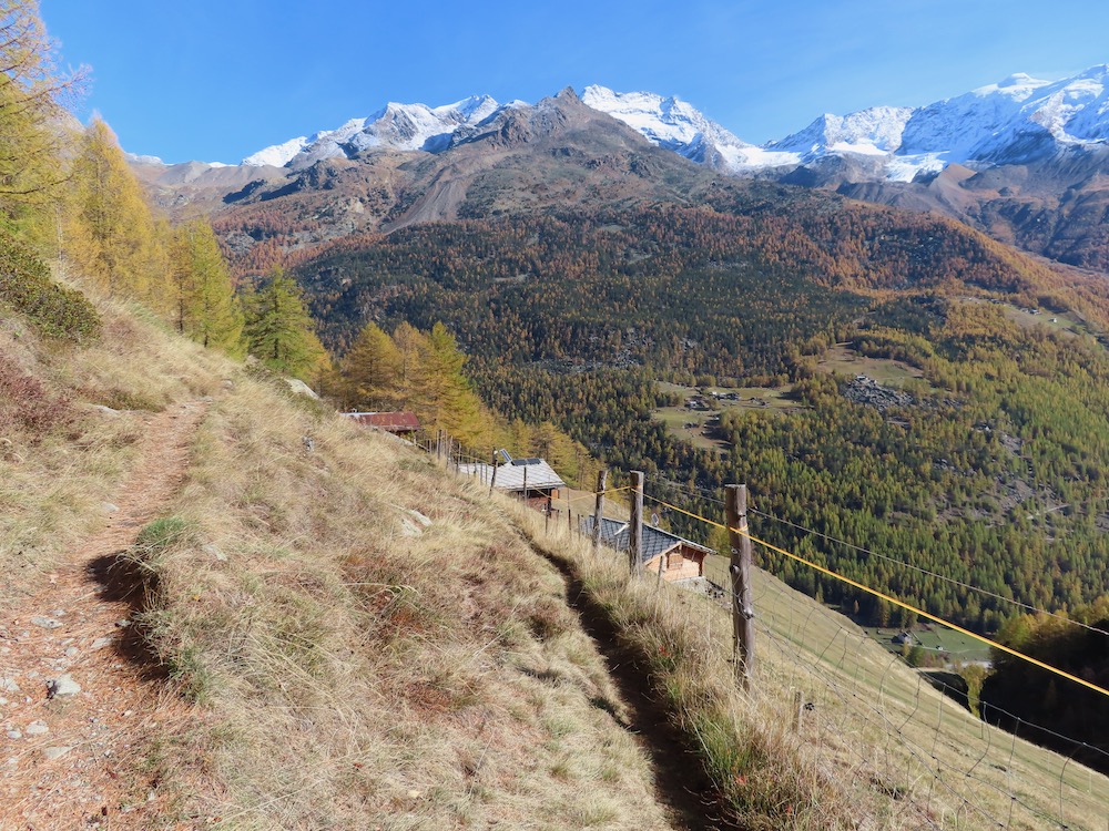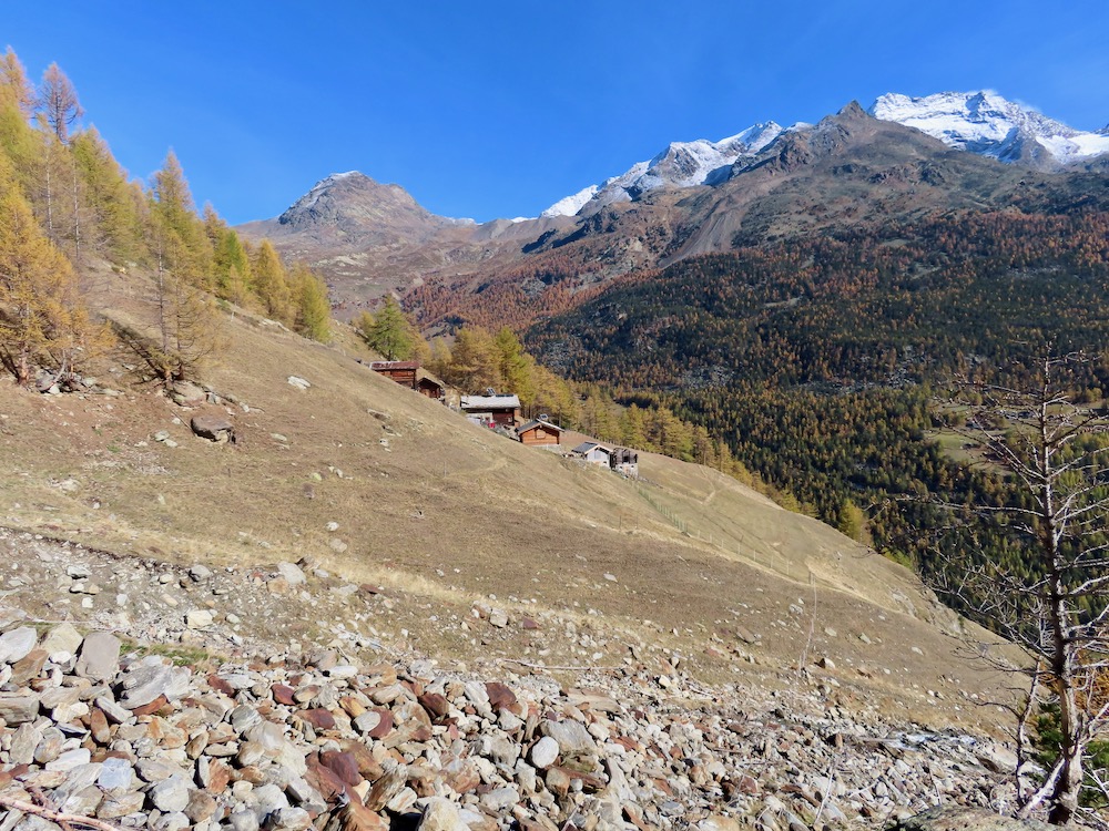Das Wetter im Wallis soll heute schön sein: Ich fahre nach Bidermatten 1542m im Saaserttal, wo ich um 10.45h meine Wanderung beginne , die mich auf der orographisch linken Talseite hinauf bringt zum P. 1920m bringt, wobei ich zuerst auf der Strasse, dann auf einer Naturstrasse und dann auf einem Wanderweg gehen kann. Dieser Aufstieg durch den herbstlichen Lärchenwald ist sehr schön und bietet Ausblicke auf die anderen Talseite, die dominiert ist vom Fletschhorn, Lagginhorn und Weissmies.