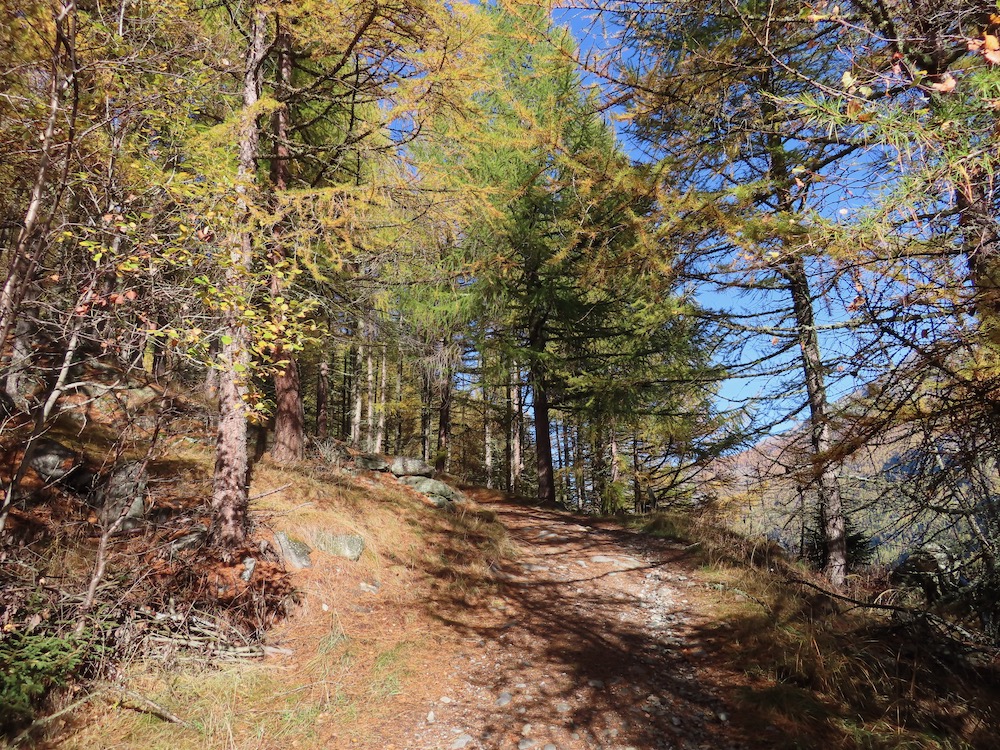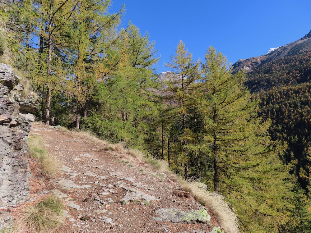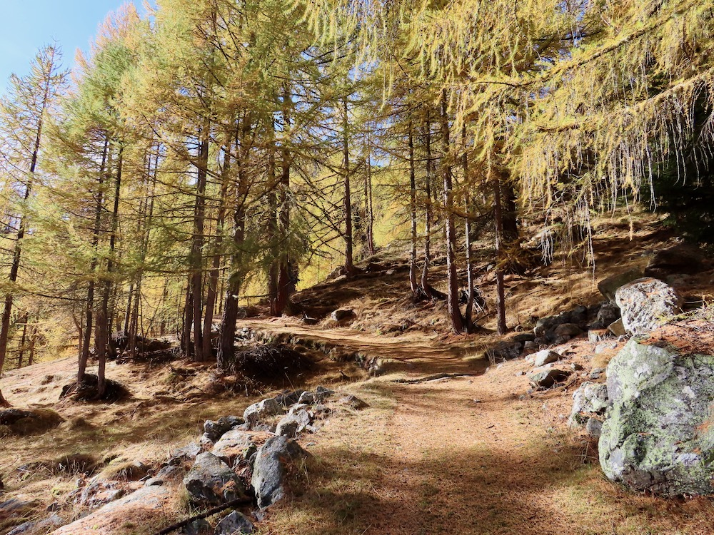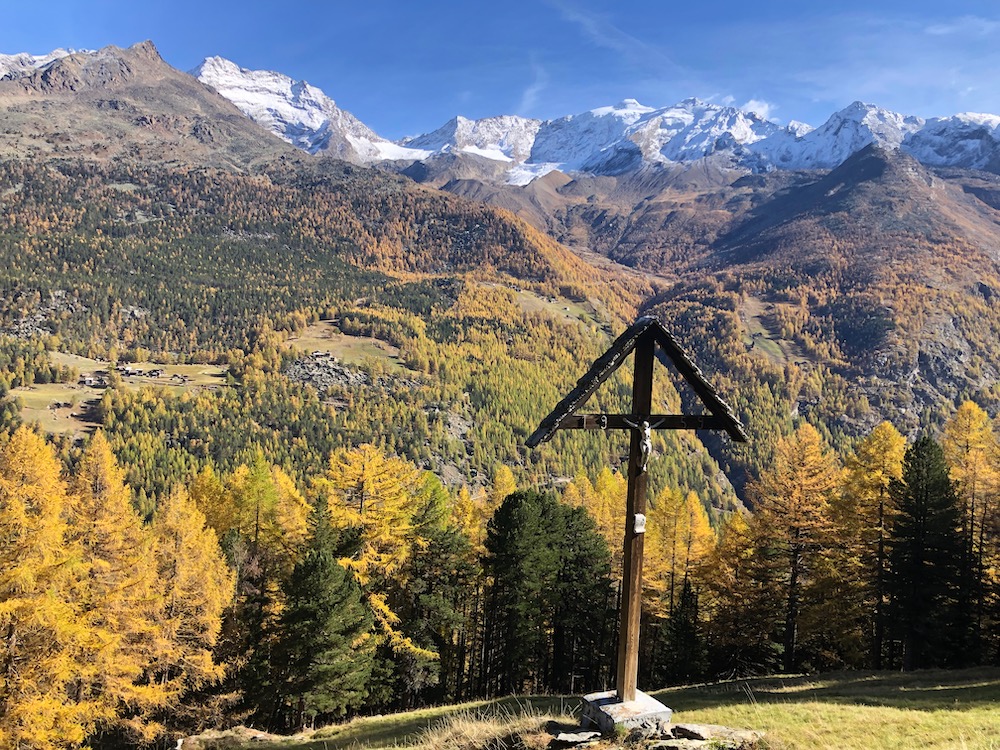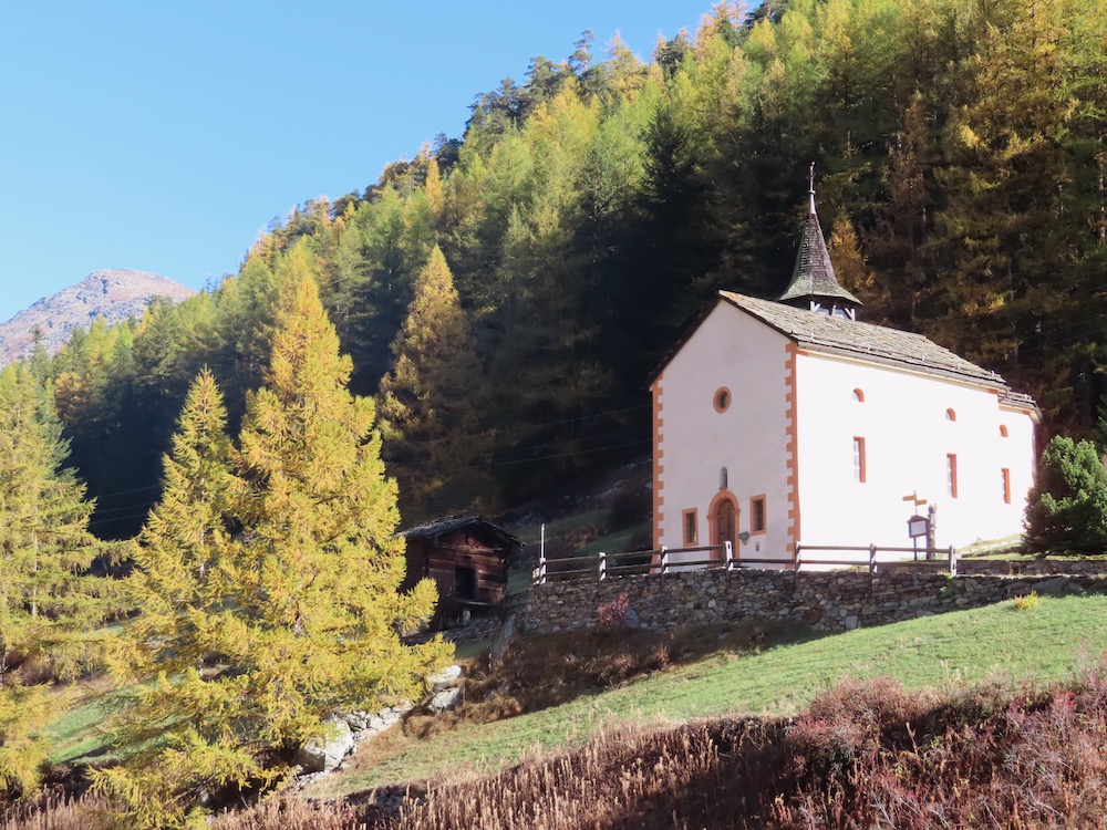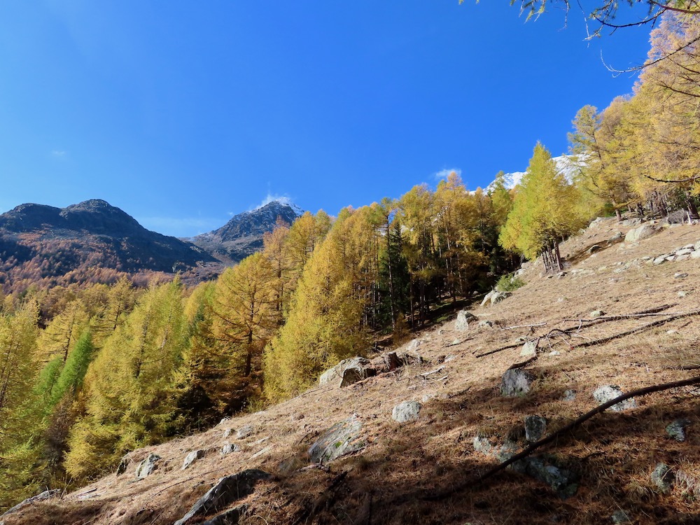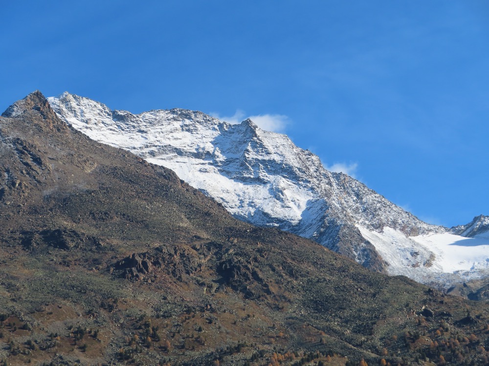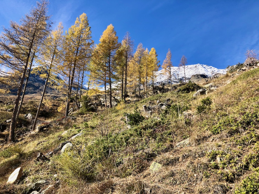 Das Wetter im Wallis soll heute schön sein: Ich fahre nach Bidermatten 1542m im Saaserttal, wo ich um 10.45h meine Wanderung beginne , die mich auf der orographisch linken Talseite hinauf bringt zum P. 1920m bringt, wobei ich zuerst auf der Strasse, dann auf einer Naturstrasse und dann auf einem Wanderweg gehen kann. Dieser Aufstieg durch den herbstlichen Lärchenwald ist sehr schön und bietet Ausblicke auf die anderen Talseite, die dominiert ist vom Fletschhorn, Lagginhorn und Weissmies.