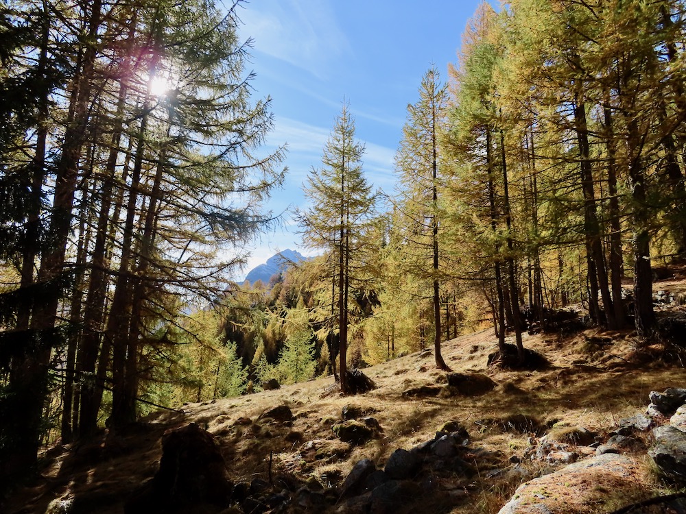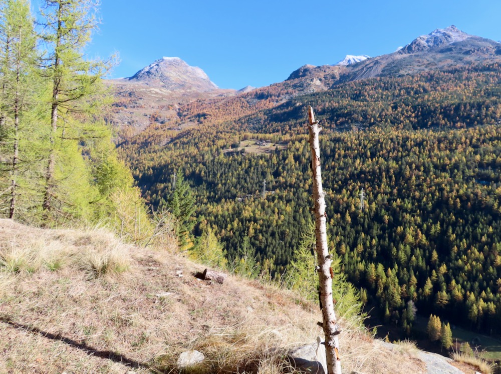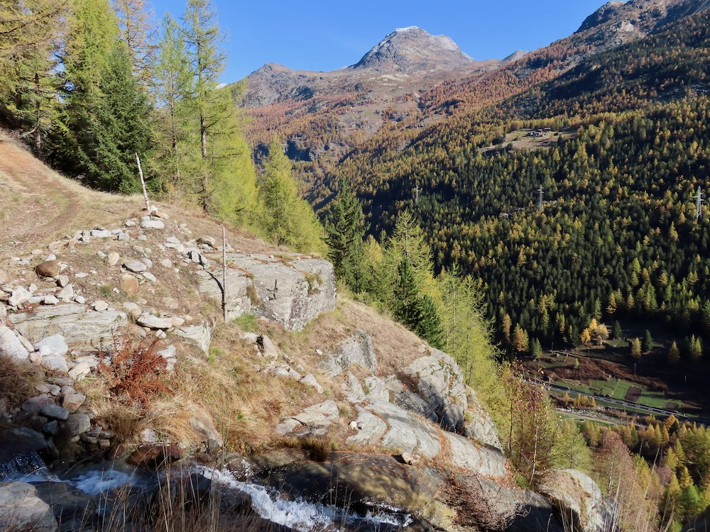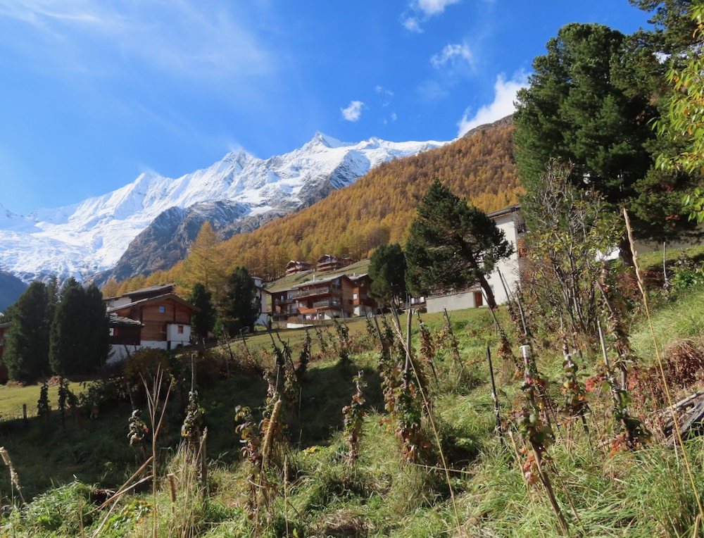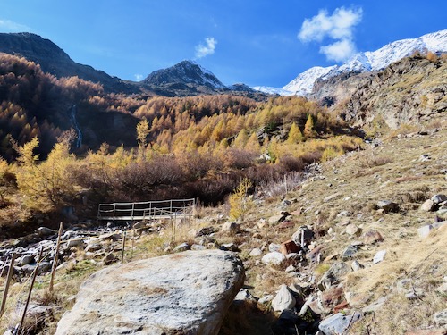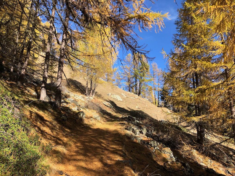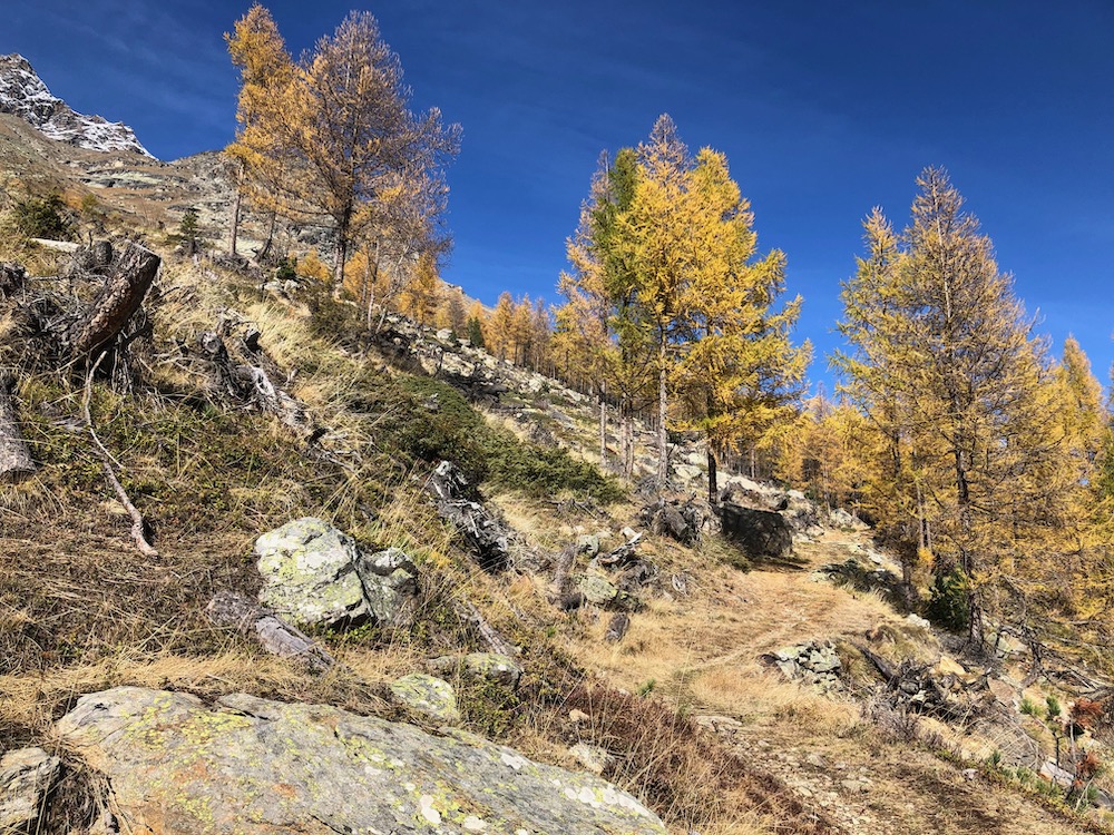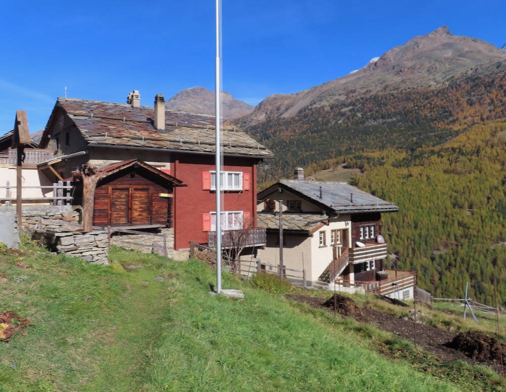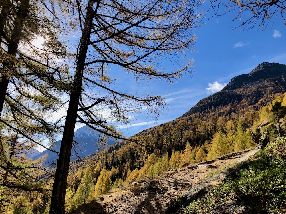 Das Wetter im Wallis soll heute schön sein: Ich fahre nach Bidermatten 1542m im Saaserttal, wo ich um 10.45h meine Wanderung beginne , die mich auf der orographisch linken Talseite hinauf bringt zum P. 1920m bringt, wobei ich zuerst auf der Strasse, dann auf einer Naturstrasse und dann auf einem Wanderweg gehen kann. Dieser Aufstieg durch den herbstlichen Lärchenwald ist sehr schön und bietet Ausblicke auf die anderen Talseite, die dominiert ist vom Fletschhorn, Lagginhorn und Weissmies.