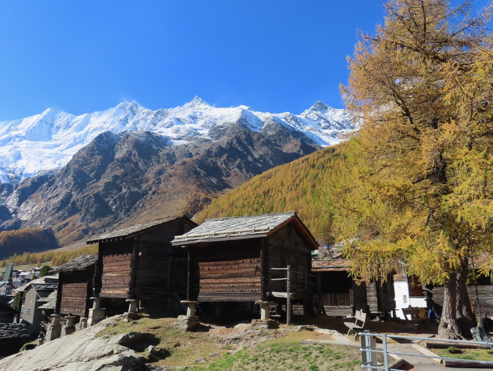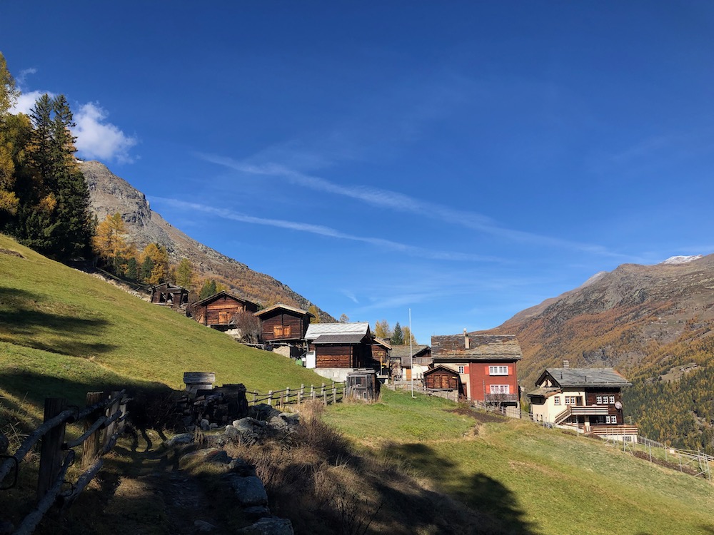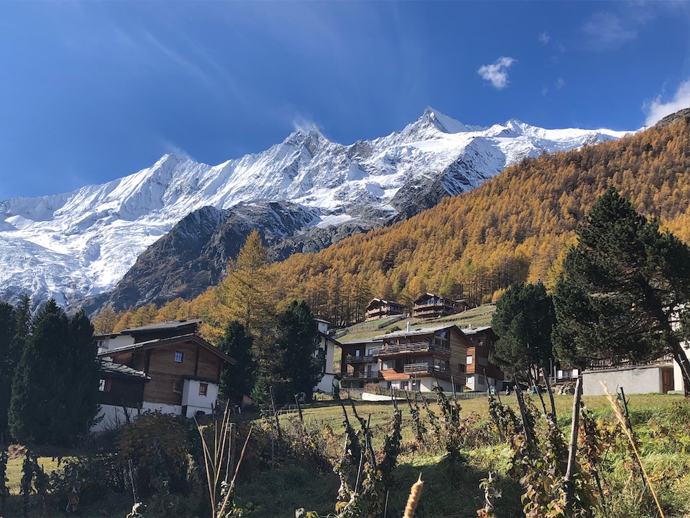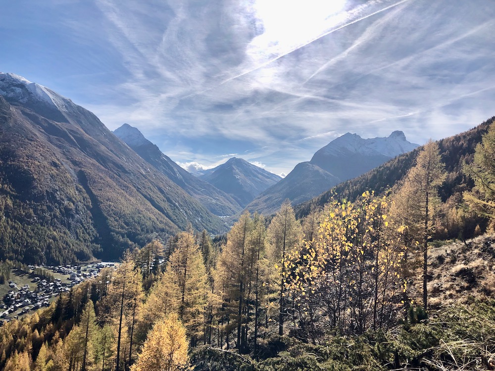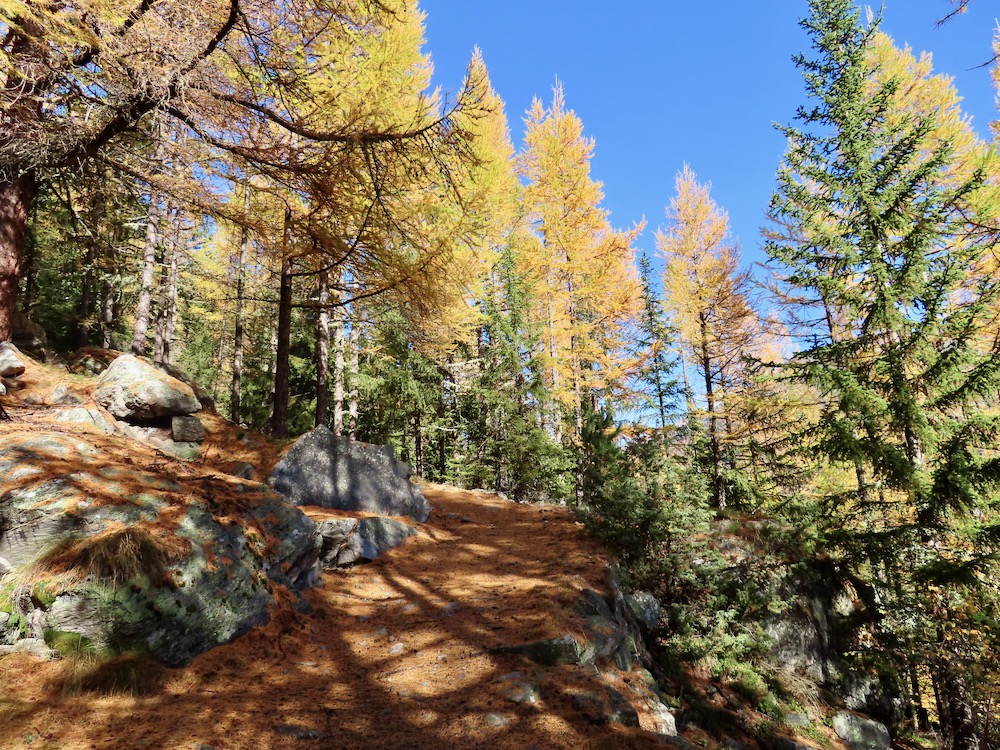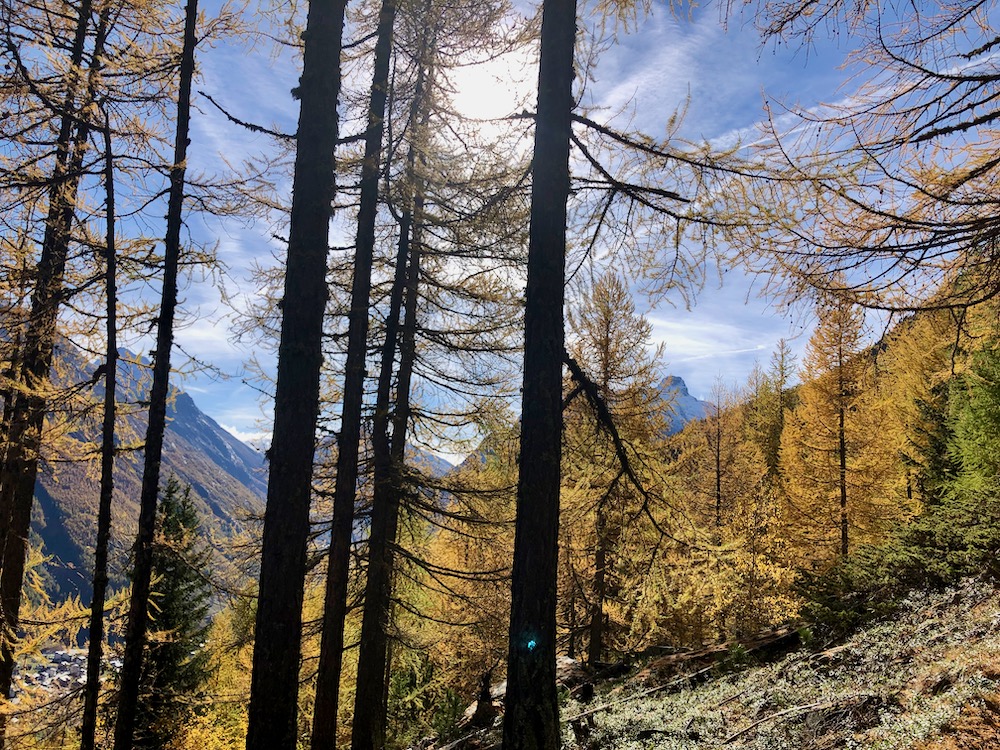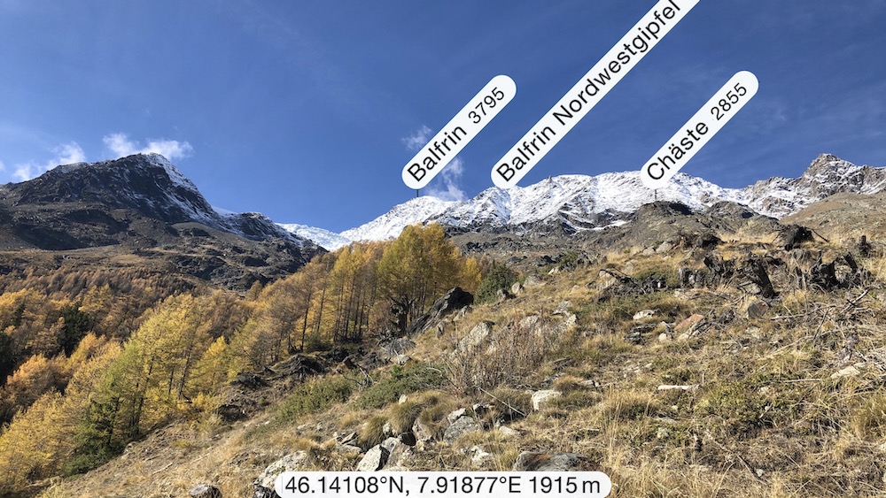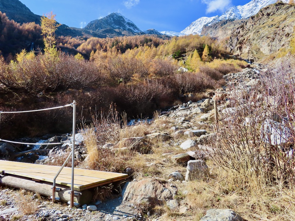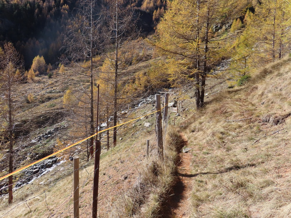 Das Wetter im Wallis soll heute schön sein: Ich fahre nach Bidermatten 1542m im Saaserttal, wo ich um 10.45h meine Wanderung beginne , die mich auf der orographisch linken Talseite hinauf bringt zum P. 1920m bringt, wobei ich zuerst auf der Strasse, dann auf einer Naturstrasse und dann auf einem Wanderweg gehen kann. Dieser Aufstieg durch den herbstlichen Lärchenwald ist sehr schön und bietet Ausblicke auf die anderen Talseite, die dominiert ist vom Fletschhorn, Lagginhorn und Weissmies.