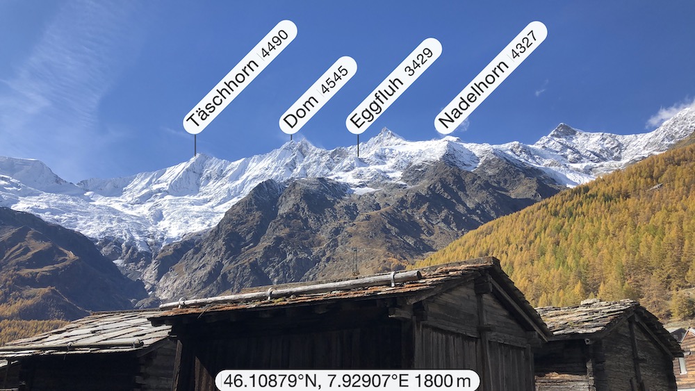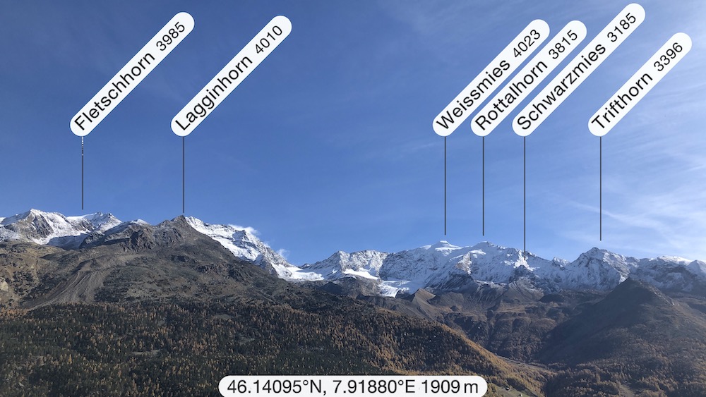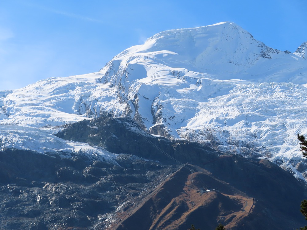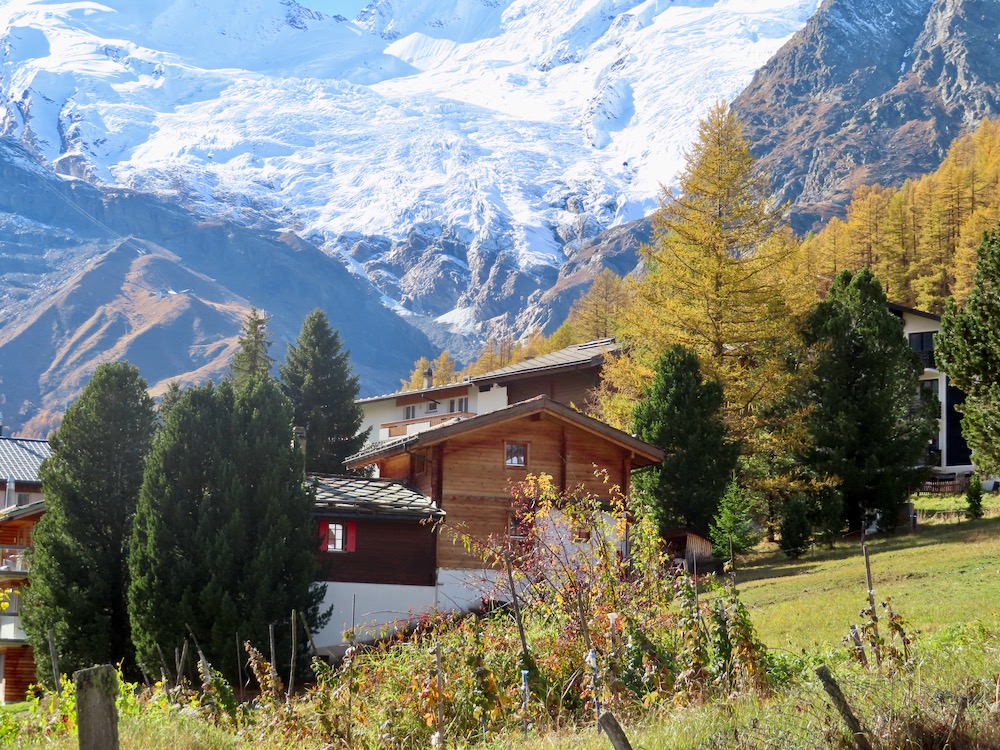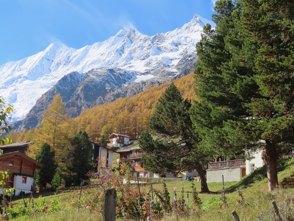 Um ca.12h erreiche ich den höchsten Punkt 1920m der Wanderung und halte da meine Mittagspause. Darnach geht es im steilen Hang hinüber und hinunter zu einem Bach. Ich komme oberhalb einer Alp vorbei und wandere nun auf dem Wanderweg, der mich über drei weitere Bäche bringt. Der Weg verläuft im Üssere Wald. Ich komme an der Lichtung Brand vorbei. Der Pfad senkt sich im Bergwald und führt hinüber zur Lichtung Sengg 1798m und von dort zum Waldhotel Fletschhorn, Nun folge ich der Strasse durch den Egguwaldbis zur grossen Wegverzweigung Üssere Wald. Hier war ich bereits im Sommer wie im Winter. Der letzte Wegabschnitt erfolgt auf Hartbelag. Vor mir ragen über den Häusern von Saas Fee die 4000er in ihrer ganzen Pracht auf. Trotz den vielen Gebäuden gelingen mir noch eine gute Fotos.