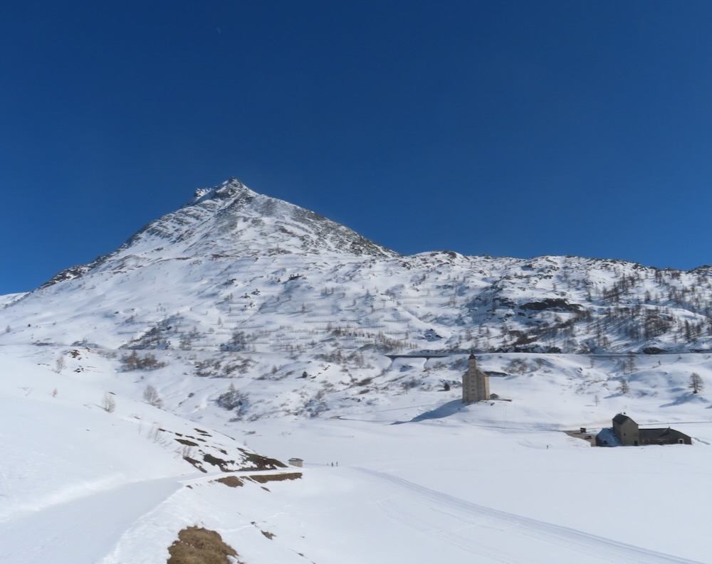Bald sind wir auf dem Winterwanderwg, wo die Schneebedingungen ideal sind. So geniessen wir den Abstieg in der prächtigen, einsamen Winterlandschaft. Unten in der Ebene, mit Sicht auf den alten Spittel und das Barralhaus machen wir eine Pause bei dem einzigen kleinen Gebäude und geniessen den Sonnenschein. Dann machen wir uns auf den Rückweg zur Passhöhe Monte Leone, wo es noch zu einem Kaffee an der Sonne reicht.