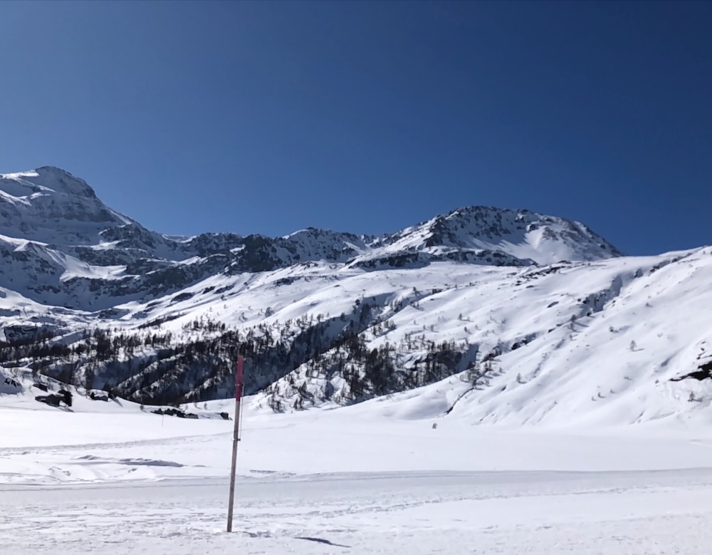 Meteo Schweiz hat einen Frühlingstag versprochen aber hier oben ist richtiges, kaltes Winterwetter. Wir steigen beim Restaurant Simplonblick aus und wandern in Richtung Rest. Monte Leone, wobei wir noch einen Abstecher machen, um einen Platz für die Mittagspause zu suchen, was uns dann auch gelingt. Darnach beginnen wir unsere geplante Winterwanderung hinunter in die Ebene von Gampisch.