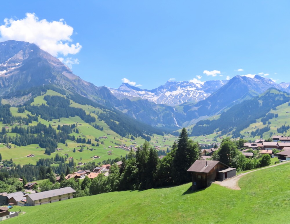 Blick auf Adelboden; li Loner; mi Wildstrubel, re Fitzer
