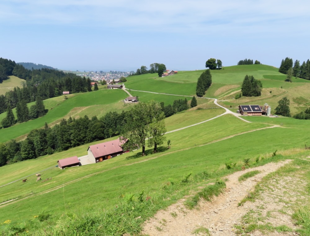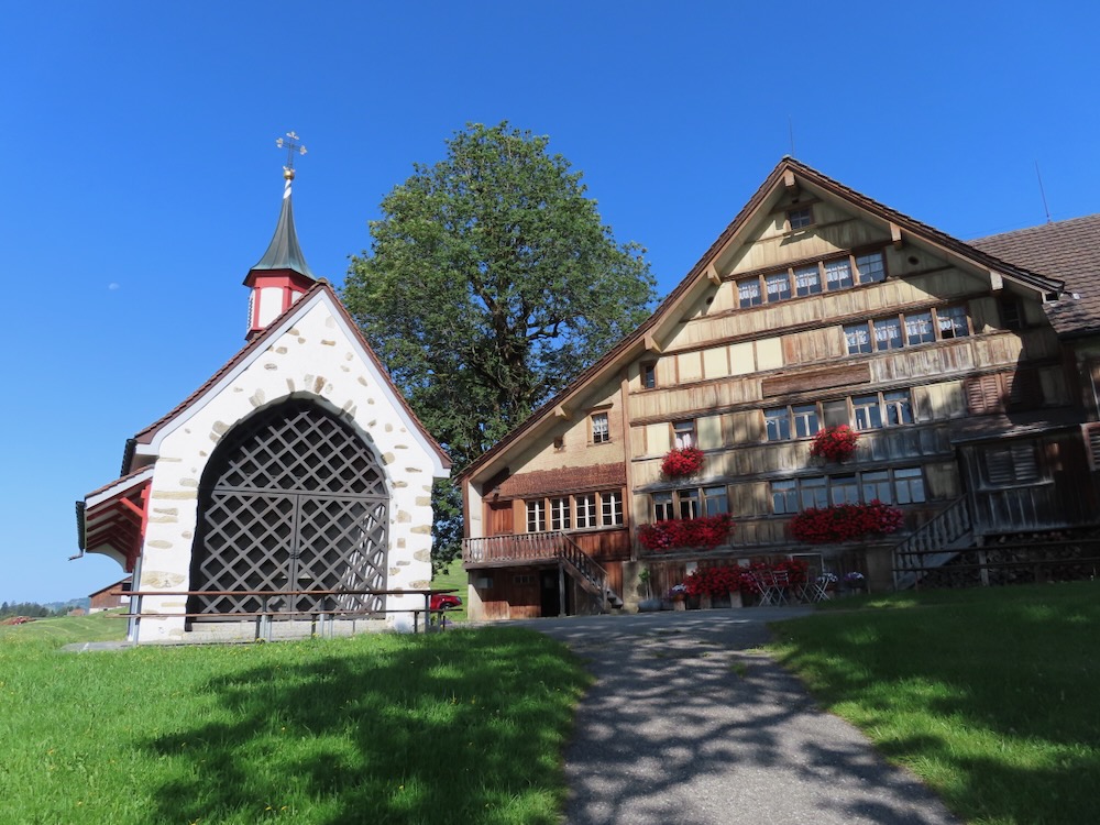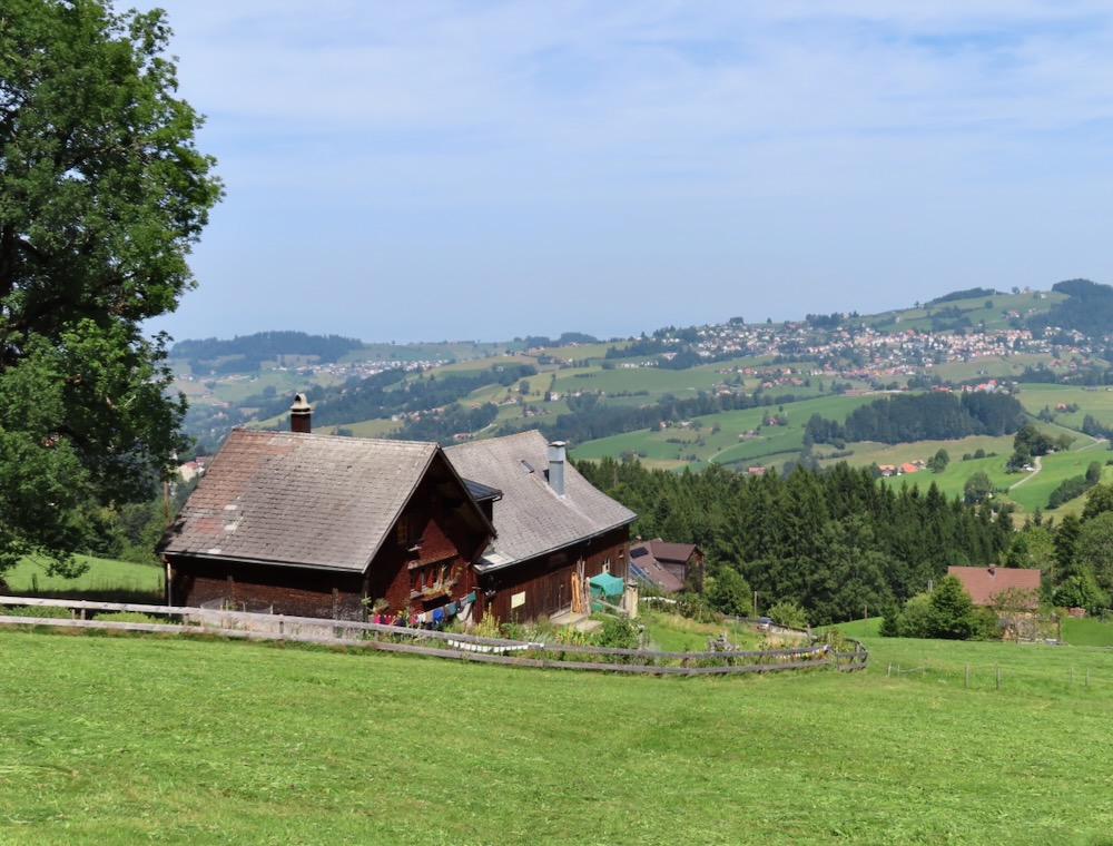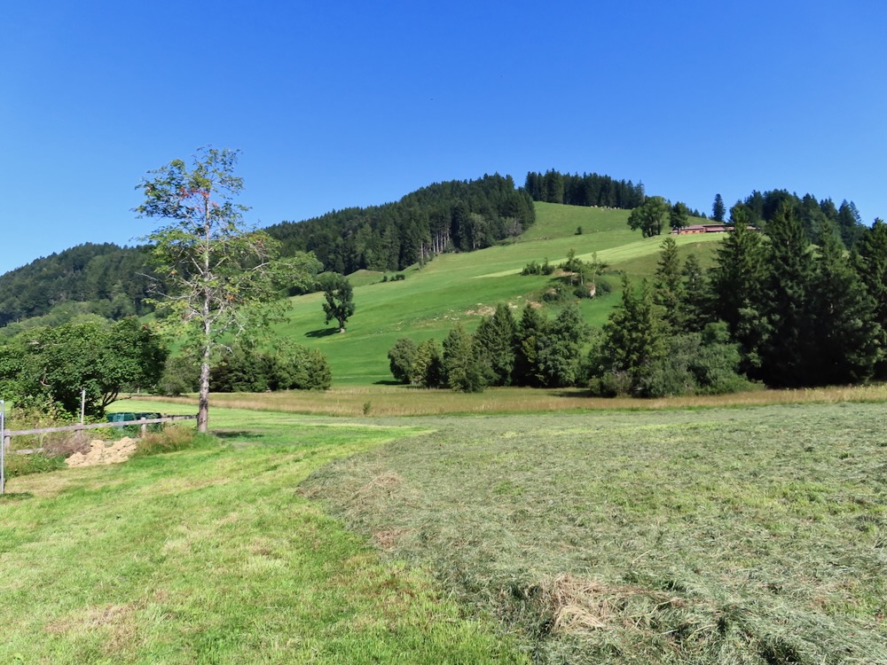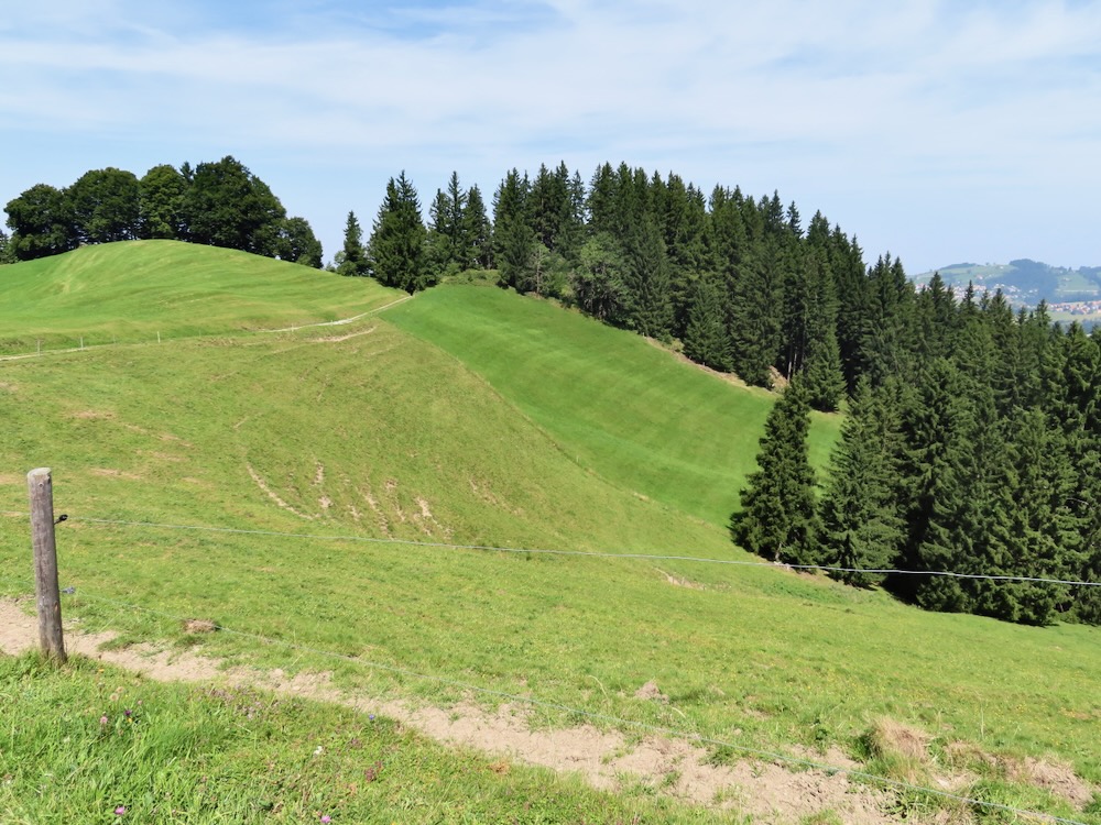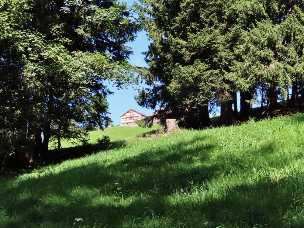 Ich steige ( fälschlicherweise) bereits an der Haltestelle Stoos auf und wandere von dort über steile Wiesenwege hinauf auf den Sommersberg 1173m. Dieser Aufstieg führt mich teilweise über steile Wiesen und ist recht anstrengend. Nach einer Stunde bin ich um 11h oben und wandere nun über den breiten Grat ( auf Hartbelag) zum Unteren Sommersberg und von dort hinunter in ein einsames, kleines Tal. Über die kurze Talsohle geht es hinüber zum Weglein in Richtung Schwäbrig. Dies ist ein sehr schöner Ort, kein Wunder, dass es hier ein Ferienheim gab. Auf der Strasse steige ich etwas auf bis zur Abzweigung zum schönen Gäbrisseelein, wo ich im Schatten meine Mittagsrast halte. Weiter geht es – wieder auf der Strasse in Richtung Oberer Gäbris. Es ist recht heiss und so beschliesse ich, mich an den Abstieg nach Trogen zu machen. Diese abwechslungsreiche Route kenne ich, aber sie ist immer wieder schön. Da ich mich noch in Trogen nach einem Restaurant umschauen möchte nehme ich in Trogen die Bergstrasse und gelange so auf den Landsgemeindeplatz. Für die Wanderung am Dienstag käme das Restaurant Lämmli infrage.