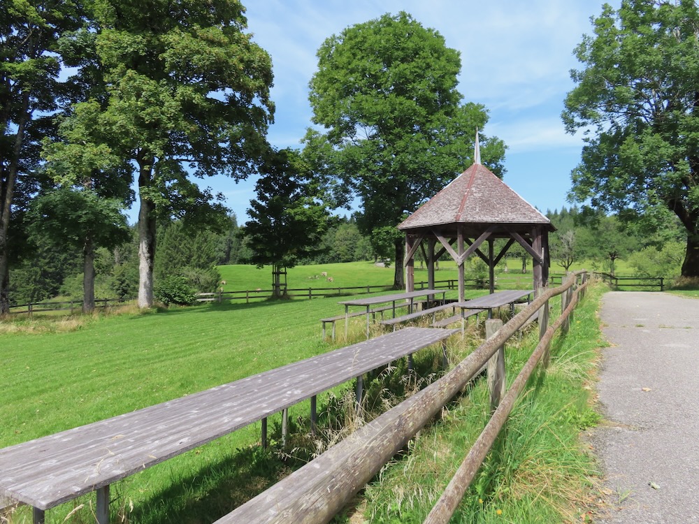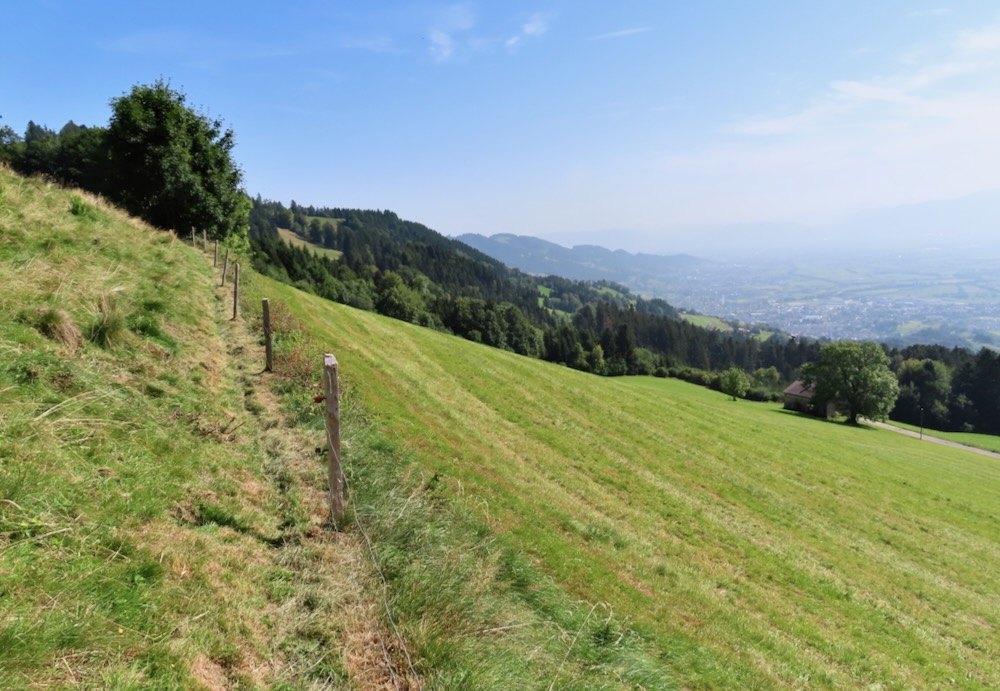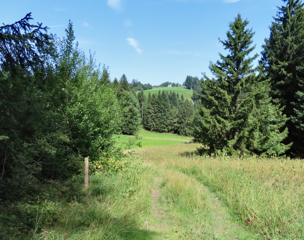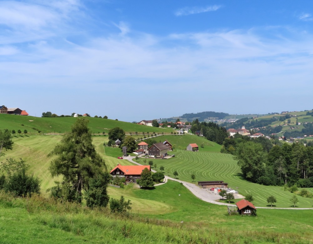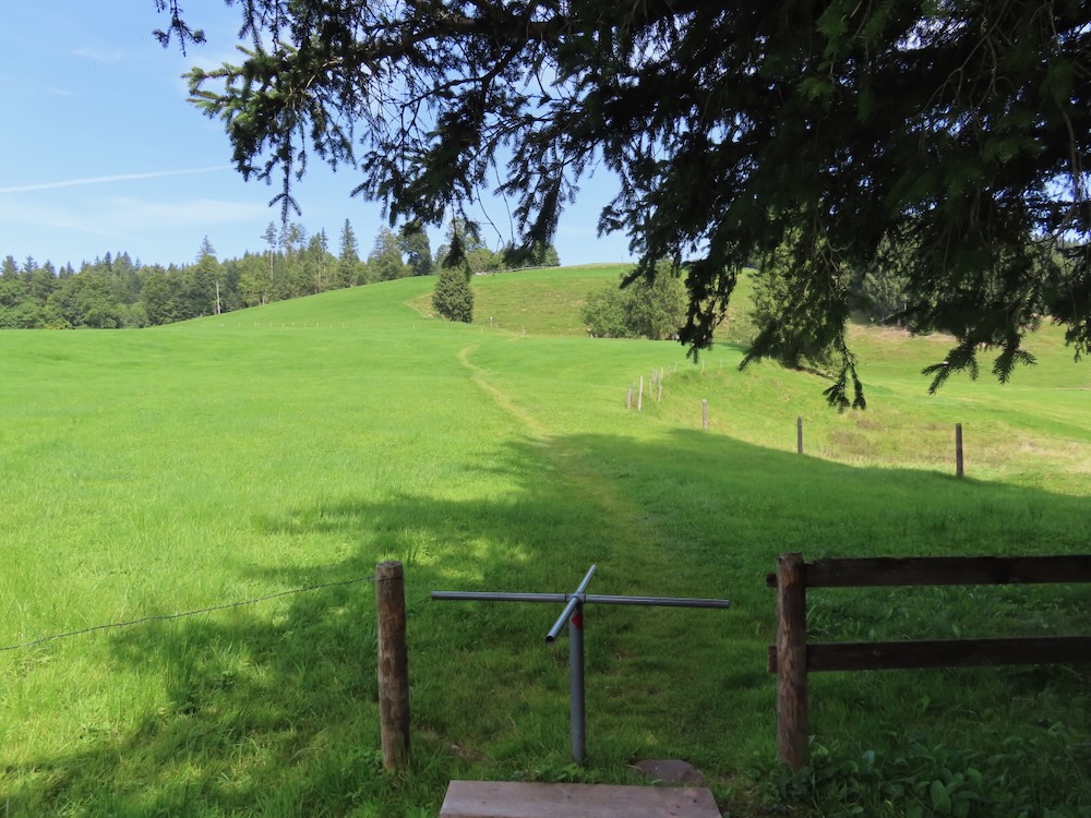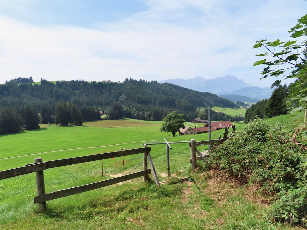 Ich steige ( fälschlicherweise) bereits an der Haltestelle Stoos auf und wandere von dort über steile Wiesenwege hinauf auf den Sommersberg 1173m. Dieser Aufstieg führt mich teilweise über steile Wiesen und ist recht anstrengend. Nach einer Stunde bin ich um 11h oben und wandere nun über den breiten Grat ( auf Hartbelag) zum Unteren Sommersberg und von dort hinunter in ein einsames, kleines Tal. Über die kurze Talsohle geht es hinüber zum Weglein in Richtung Schwäbrig. Dies ist ein sehr schöner Ort, kein Wunder, dass es hier ein Ferienheim gab. Auf der Strasse steige ich etwas auf bis zur Abzweigung zum schönen Gäbrisseelein, wo ich im Schatten meine Mittagsrast halte. Weiter geht es – wieder auf der Strasse in Richtung Oberer Gäbris. Es ist recht heiss und so beschliesse ich, mich an den Abstieg nach Trogen zu machen. Diese abwechslungsreiche Route kenne ich, aber sie ist immer wieder schön. Da ich mich noch in Trogen nach einem Restaurant umschauen möchte nehme ich in Trogen die Bergstrasse und gelange so auf den Landsgemeindeplatz. Für die Wanderung am Dienstag käme das Restaurant Lämmli infrage.