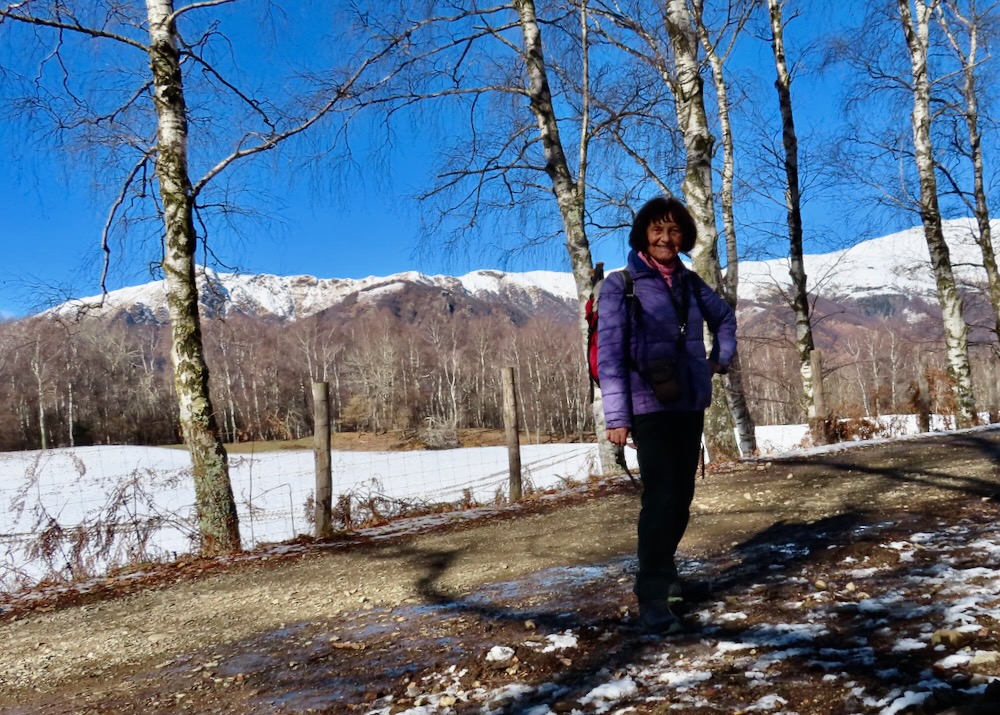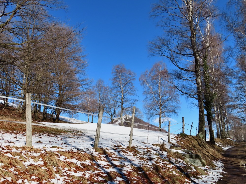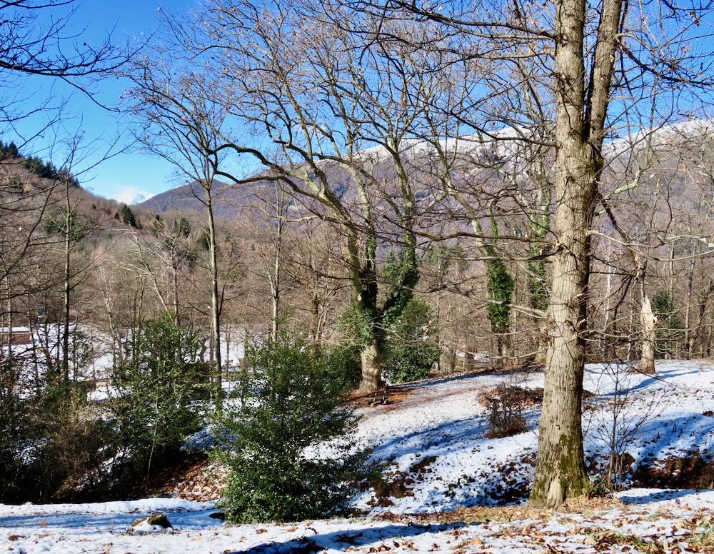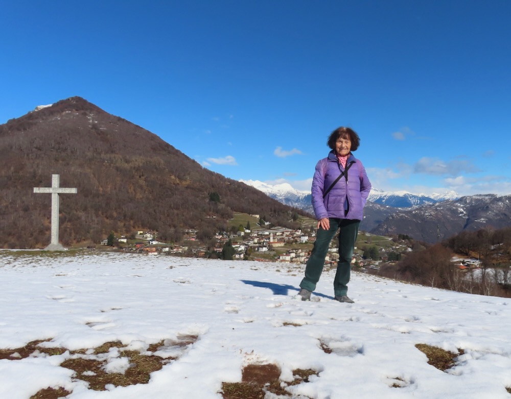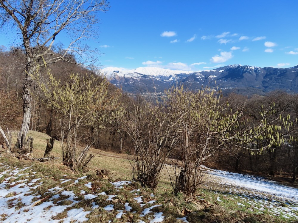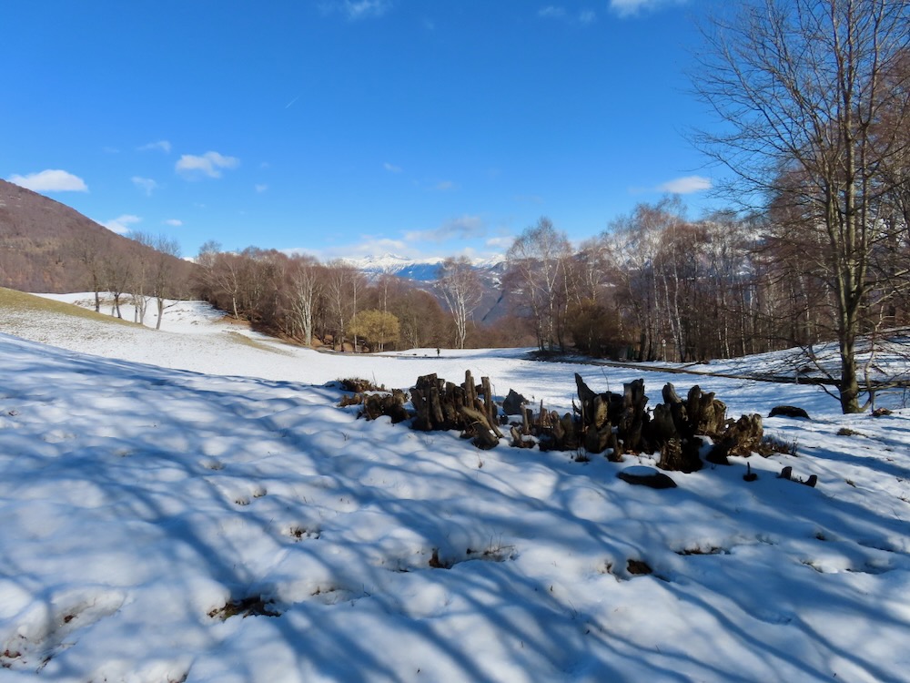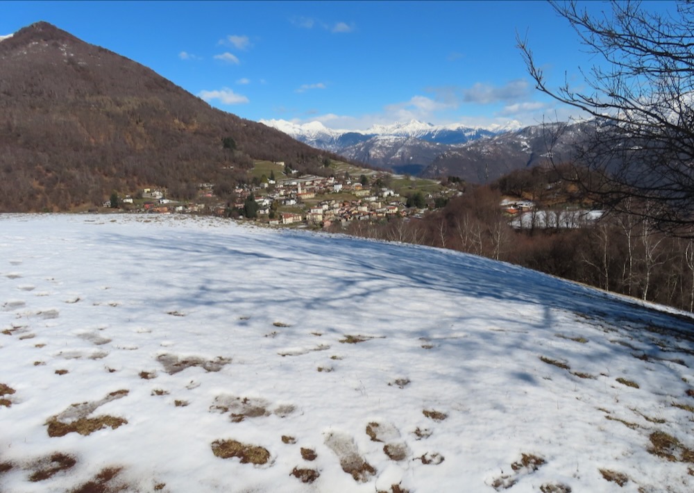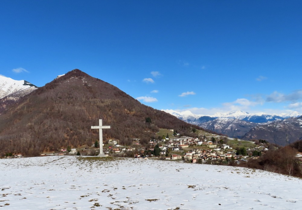 Ich wandere weiter und weiche etwas vom Wege ab und steige die Hügel hinaufkam eine bessere Sicht zu haben. Ich sehe in der Ferne das Dorf Arosio, woi ch schon mehrmals war. Ich gehe auf den Schnee hinüber zu einem Aussichtspunkt mit Kreuz. Hier habe ich eine prächtige Sicht auf Arosio und die dahinter liegenden Berge. Auf einem schmalen Strässchen erreiche ich wieder den Wanderweg, der mich in eine Talsenke mit einem Grotto führt. Bei einem Wegweser beschliesse ich spontan, nicht nach Arosio sondern hinunter nach Bosco Luganese zu steigen. Der schmale Pfad führt in Kehren durch den steilen Bergwald. Hier brauche ich meine Stöcke.