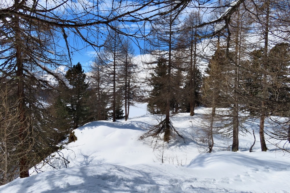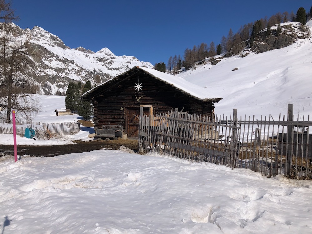 Heute fahre ich nach Sils Maria und steige auf dem nun noch winterlichen Schluchtweg hinauf auf Fex Platta und von dort auf Fex Crasta. Weiter geht es auf dem Winterwanderweg hinein ins Fextal, vorbei am Haus la Motta. Ich kehre dann wieder um und wandere auf die anderen Seite des Fextalgebiets zum Aussichtspunkt Turba, der tief verschneit ist. Ich muss auf der Bank den Schnee räumen, um nun zum ersten Mal eine Pause zu machen. Dann wandere ich durch die tiefverschneite Gegend hinunter nach Sils Maria.