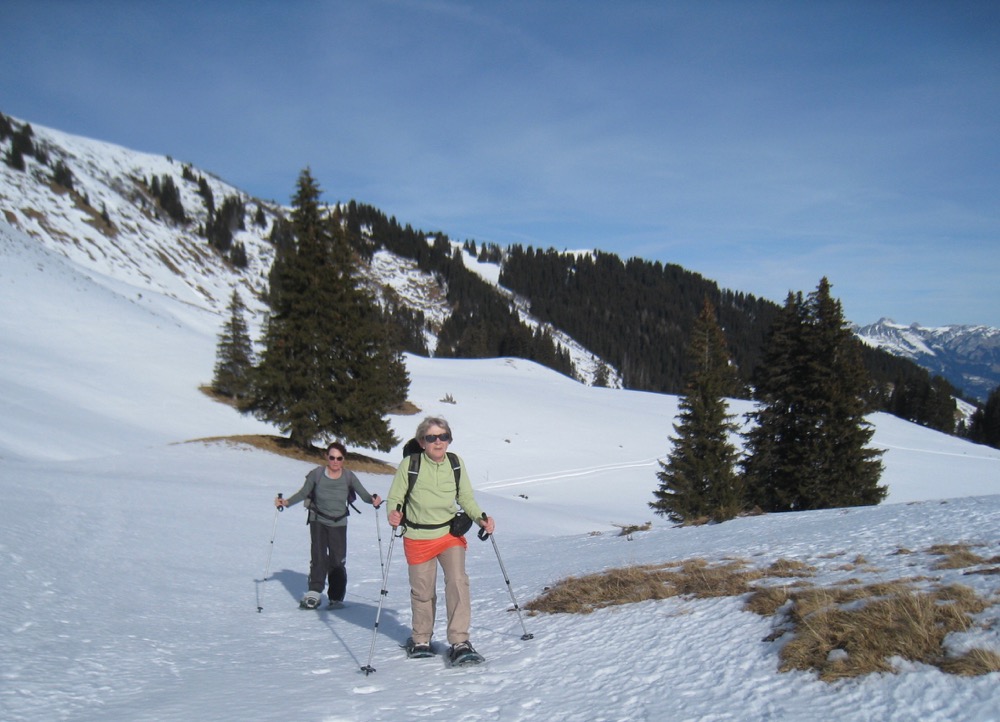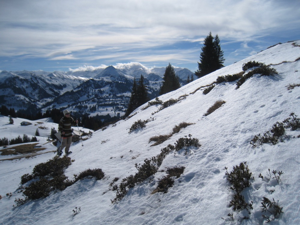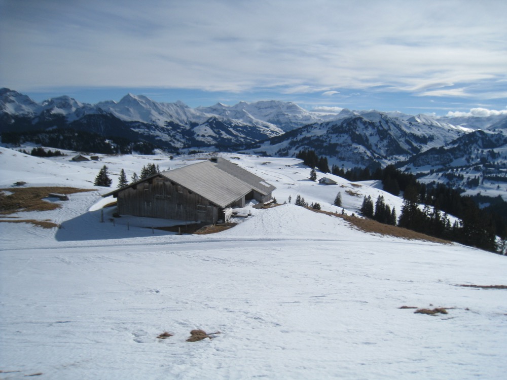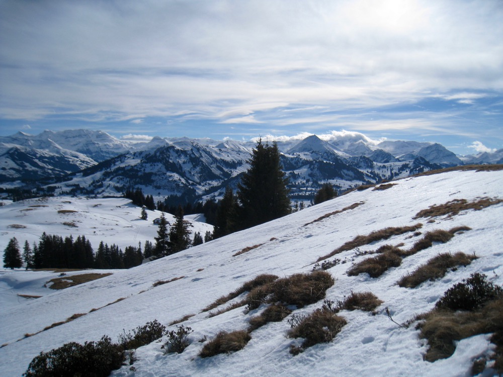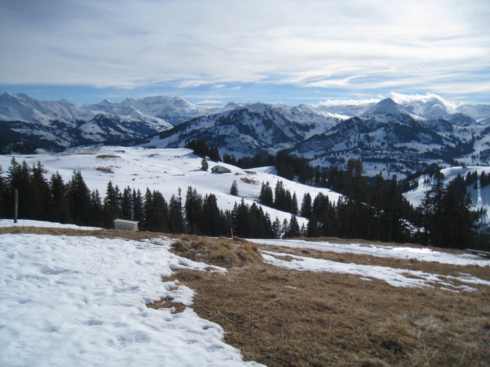 Wir fahren nach Zweisimmen und dann mit dem Bus hinauf aufs Sparenmoos, wo ich eine Schneeschuhrundwanderung geplant habe. Das Wetter ist ziemlich gut es hat aber viele weisse Schlieren am Himmel. Der Schnee ist eher nass.