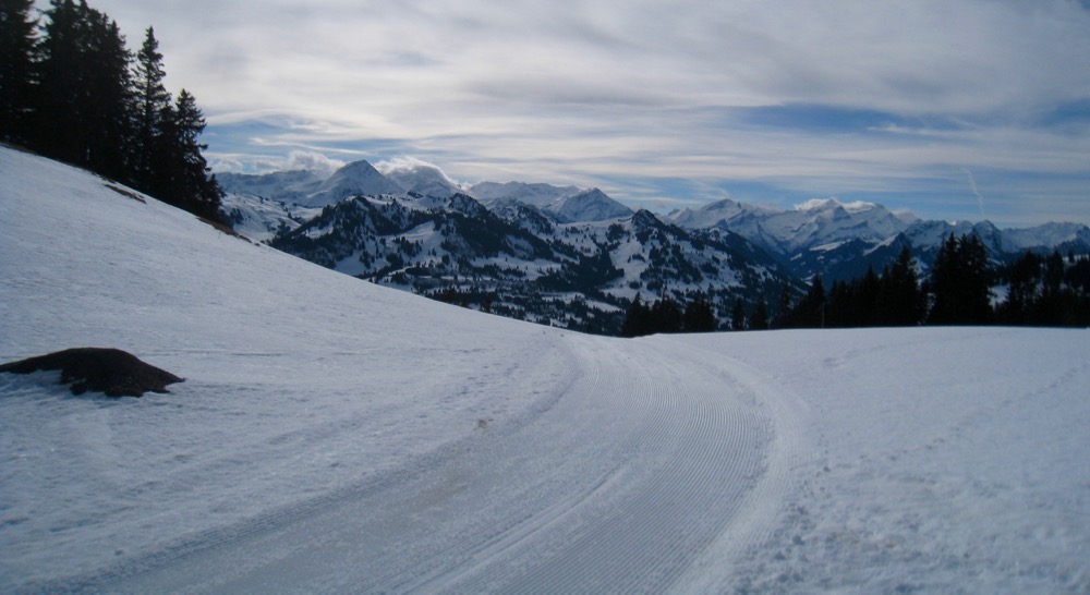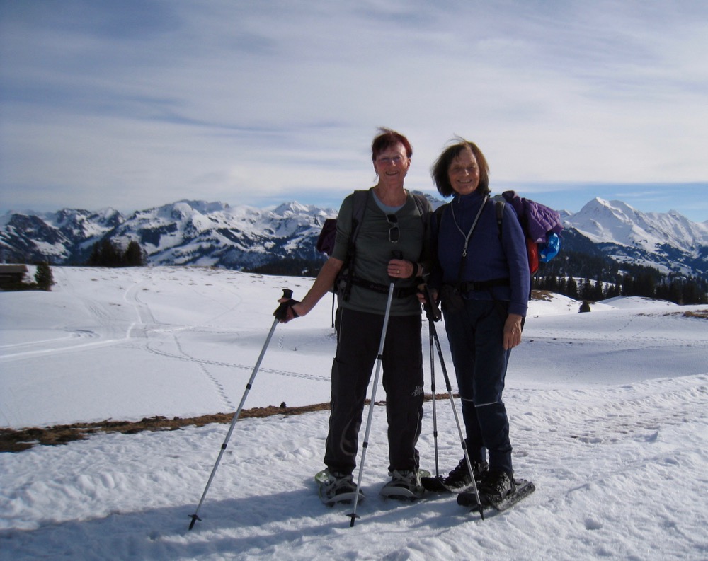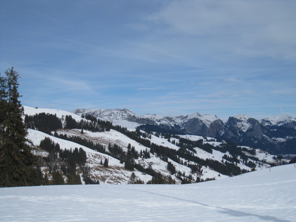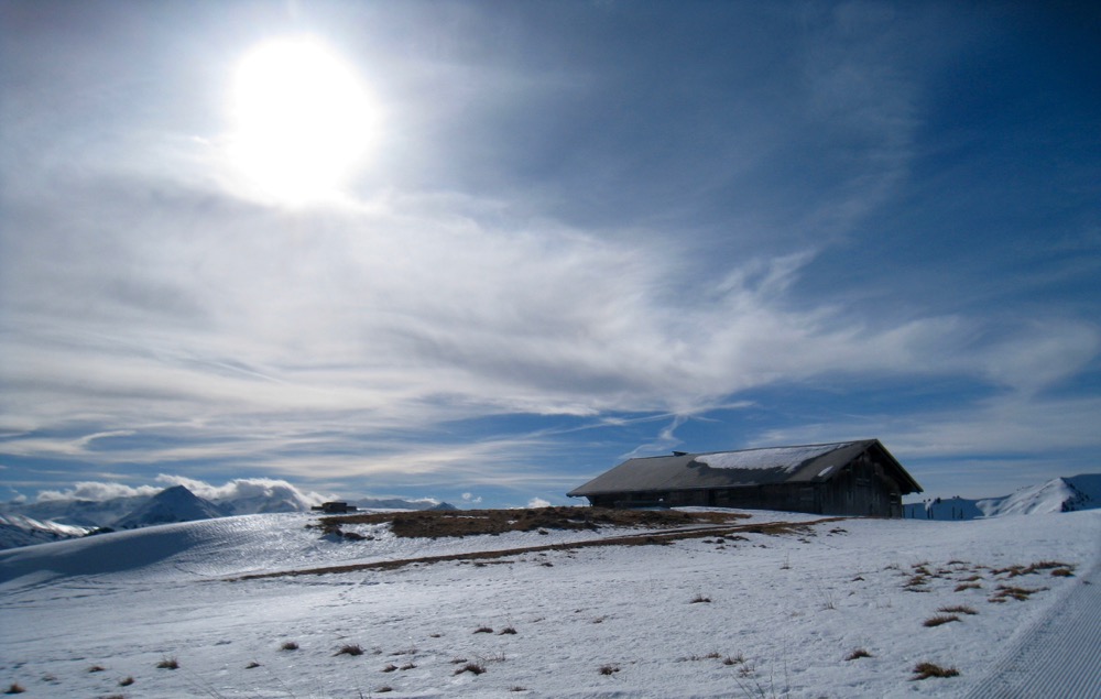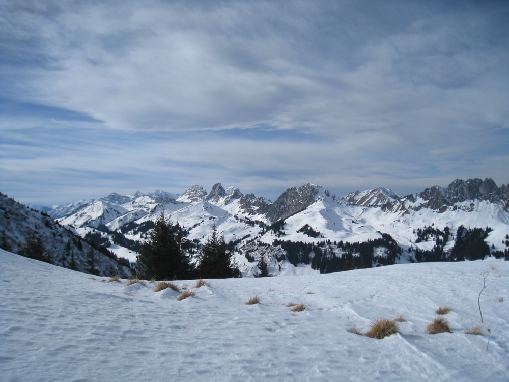 Wir fahren nach Zweisimmen und dann mit dem Bus hinauf aufs Sparenmoos, wo ich eine Schneeschuhrundwanderung geplant habe. Das Wetter ist ziemlich gut es hat aber viele weisse Schlieren am Himmel. Der Schnee ist eher nass.