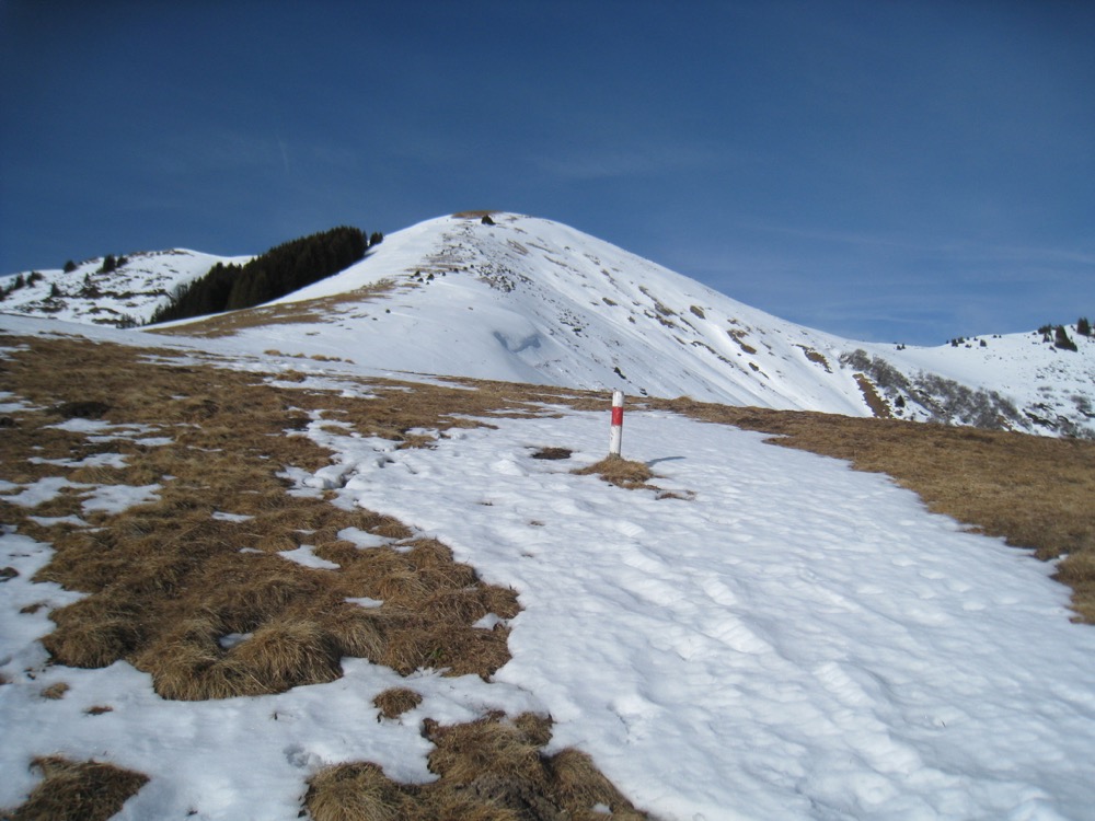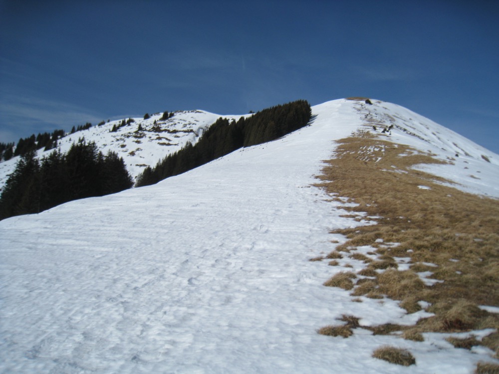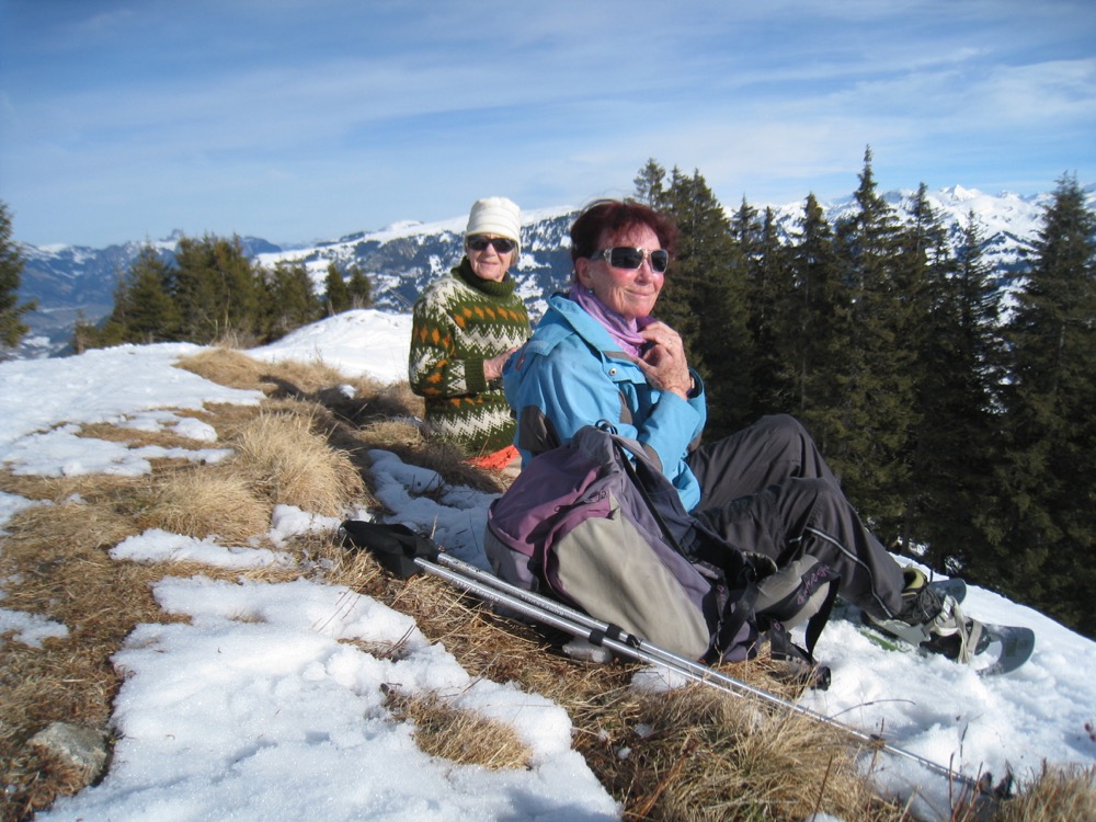 Wie wir sehen, können wir nicht dem Wanderweg in der steilen Flanke des Hundsrügg nehmen, sondern wir müssen den steilen Weg über die Schiltenegg hinauf einschlagen, was knapp 300 Höhenmeter ausmacht. Da es nicht sehr viel Schnee hat und es sogar apere Stellen gibt, können wir diesen Weg gut nehmen. So steigen wir also hinauf und schalten zwischendurch eine Pause ein.