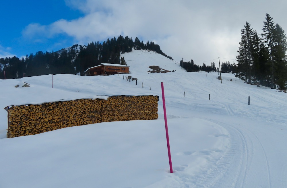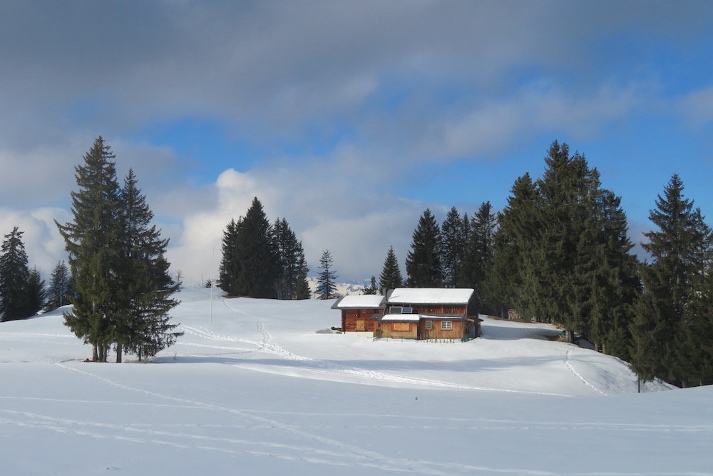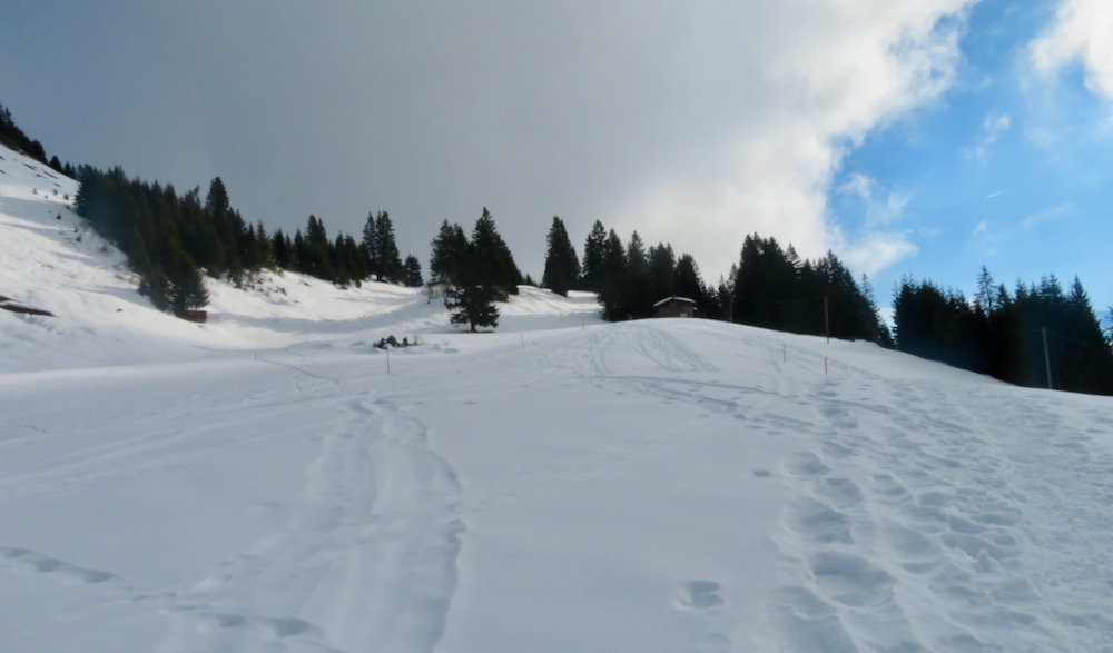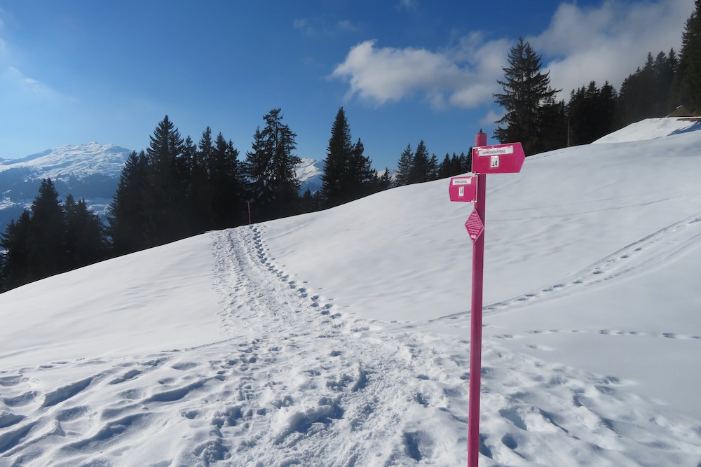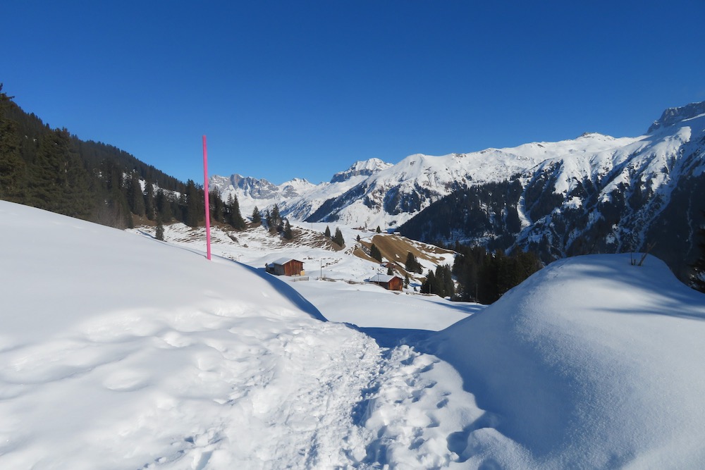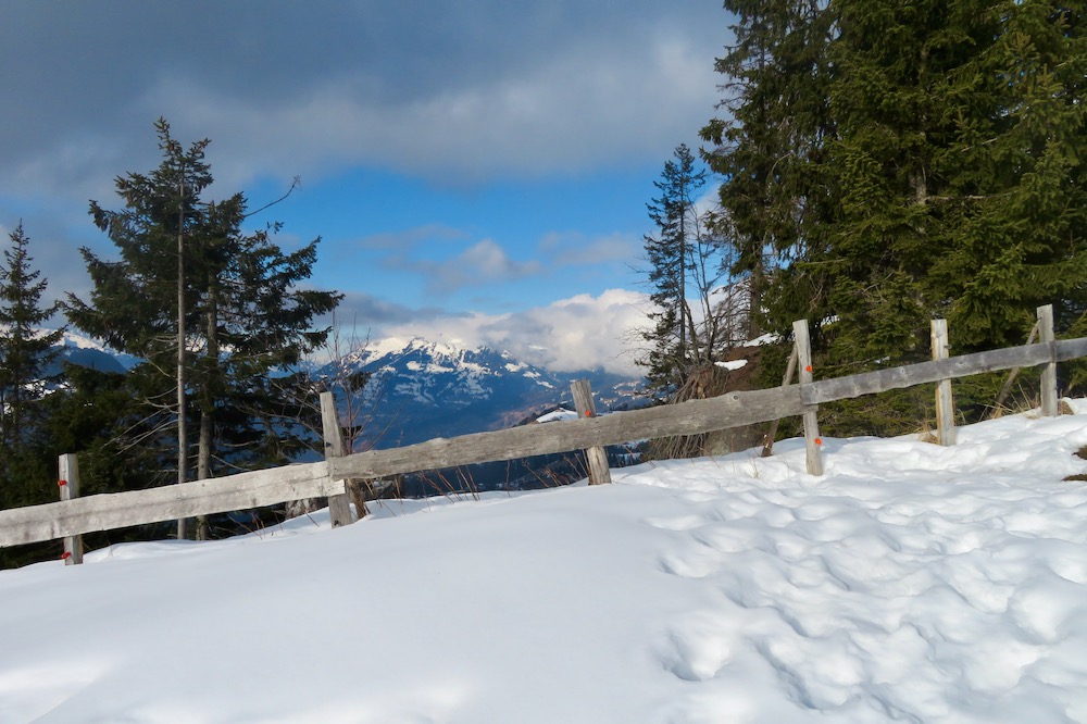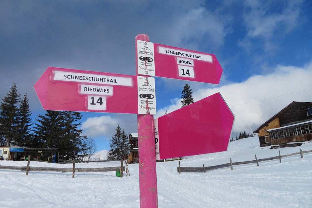 So aber gelange ich ohne Mühe in den Schnee. Bei Geisswis 1477m folge ich dem Fahrweg, der nun ein Winterwanderweg ist, bis zur Abzweigung der Schneeschuhroute no 14 hinauf nach Tratza. Ich ziehe bald die Schneeschuhe an und wandere über einige Waldlichtungen hinauf gegen Tratza, wobei ich einige Male die Langlaufloipe quere. Leider ist es immer noch stark bewölkl, sodass ich die schöne Landschaft nicht im besten Lichte sehen kann. Nach einer knappen Stunde bin ich bei der Alpsiedlung Tratza 1641m, wo es nur sehr wenig Leute hat. Tratza liegt auf einer Art Terrasse oberhalb des Tal und man hat von hier normalerweise ein schönes Panoarama Richtung Vilan,Sassauna, Schesaplana. Heute ist das nicht unbedingt der Fall. Ich steige weiter hinauf und folge den rosa Stecken.Ich befinde mich nun unterhalb des Alpbüel. Die Route führt in einem leichten Auf und Ab quer durch das Gebiet Chalehhalde und Galondis. Der Trail ist sehr gut ausgeschildert und verläuft durch eine sehr schöne Winterlandschaft. Bei der Abzweigung zum Skilift wähle ich die obere Route hinüber zum Boden, wobei es da noch einige kurze Steigungen gibt. Aber dann lasse ich den Bergwald hinter mir und habe den Blick frei auf die Schijenfluh, den Schollberg und die Rätschenflue. Dies ist die Gegend, die ich schon von der Panoramawanderung St. Antönien – Pany kenne, und die mir sehr gut gefällt. Beim Boden finde ich eine Bank vor einer Hütte und kann nun endlich eine späte Mittagspause machen. Dann geht es weiter hinunter zur Strasse, welche von St.Antönien her kommt und die die Winterwanderroute ist. Auf dieser gehe ich nun hinunter bis zur Abzweigung zum Schneeschuhtrail. Hier steige ich im immer spärlicher vorhandenen Schnee hinunter, was eine schlechte Entscheidung war. Ich sinke teils tief in Schnneeöcher ein und muss teils über apere, glitschige Wiesen gehen! Immerhin komme ich dann endlich zu einem Weg, der mich hinunter ins Dorf Pany bringt. Natürlich habe ich nun dreckige Schneeschuhe! Ich wäre besser bis hinunter zum Skilift gleuafen!