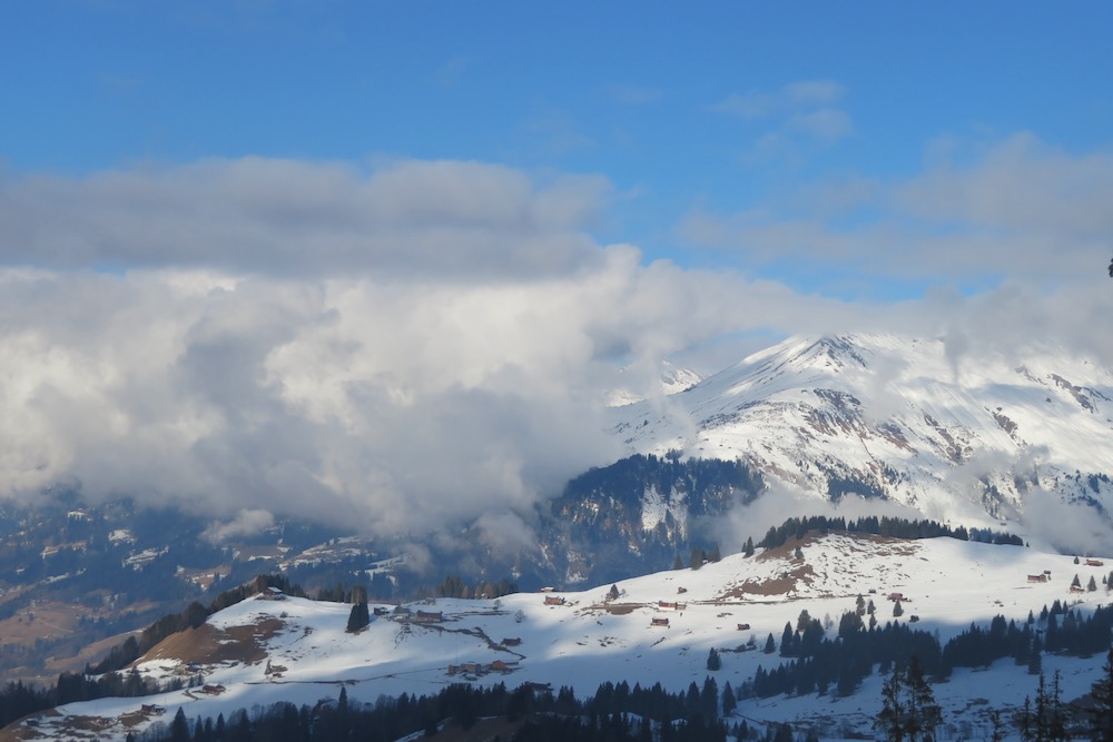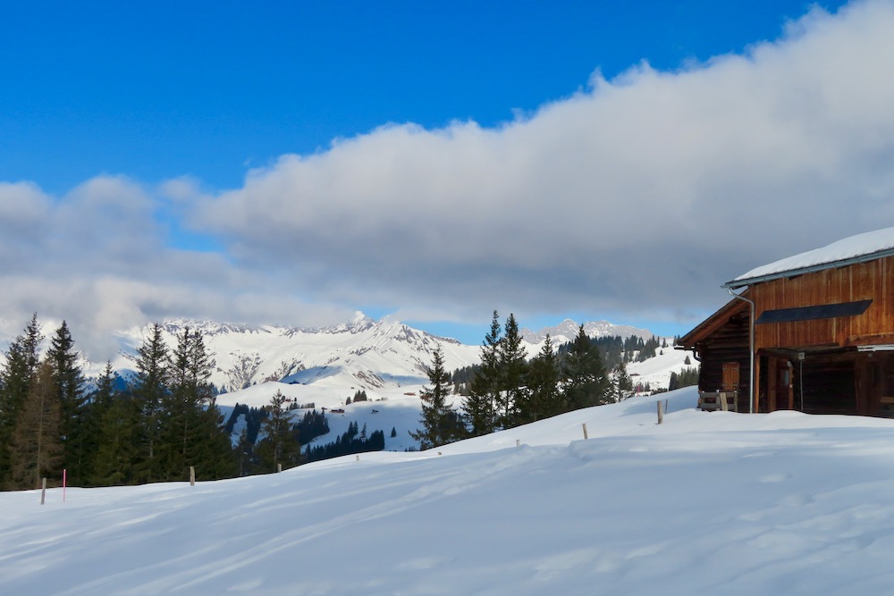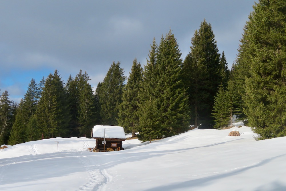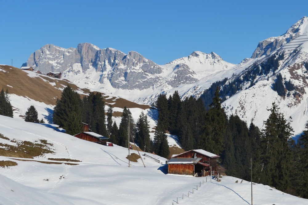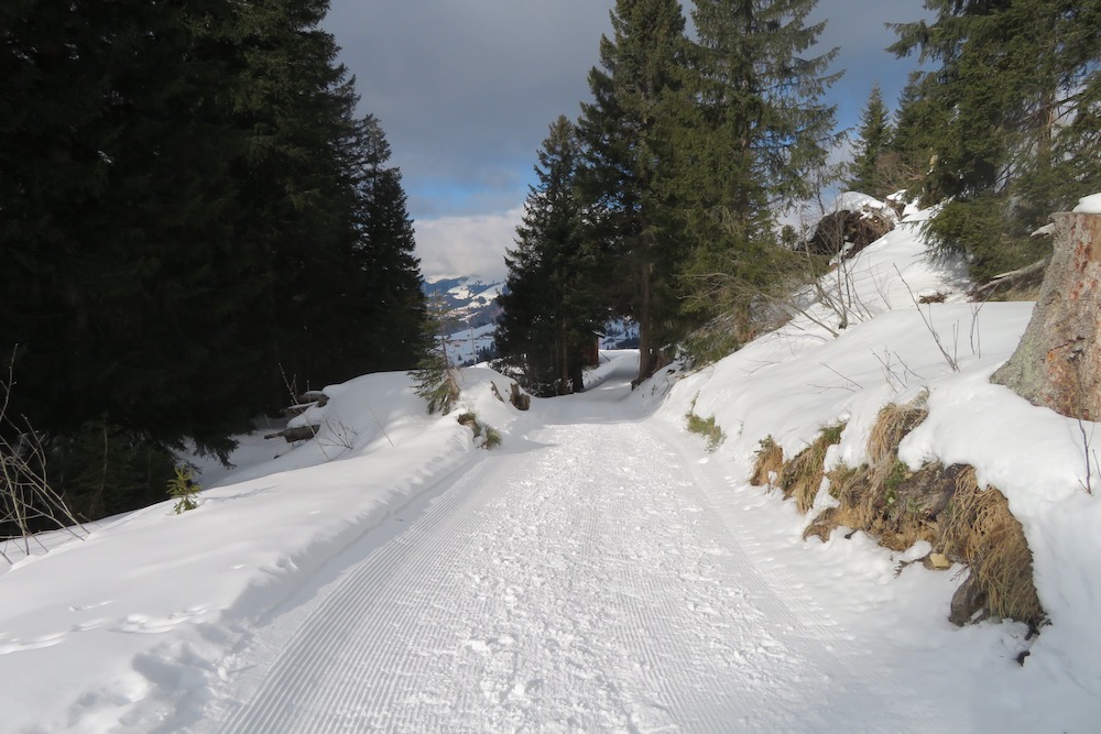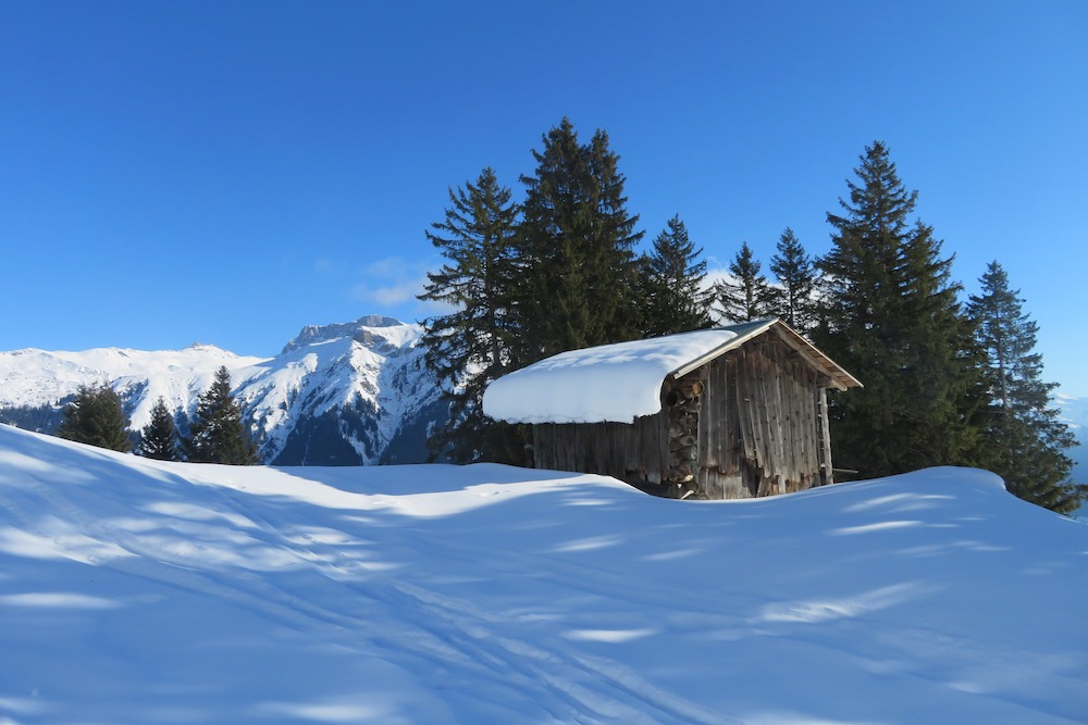 So aber gelange ich ohne Mühe in den Schnee. Bei Geisswis 1477m folge ich dem Fahrweg, der nun ein Winterwanderweg ist, bis zur Abzweigung der Schneeschuhroute no 14 hinauf nach Tratza. Ich ziehe bald die Schneeschuhe an und wandere über einige Waldlichtungen hinauf gegen Tratza, wobei ich einige Male die Langlaufloipe quere. Leider ist es immer noch stark bewölkl, sodass ich die schöne Landschaft nicht im besten Lichte sehen kann. Nach einer knappen Stunde bin ich bei der Alpsiedlung Tratza 1641m, wo es nur sehr wenig Leute hat. Tratza liegt auf einer Art Terrasse oberhalb des Tal und man hat von hier normalerweise ein schönes Panoarama Richtung Vilan,Sassauna, Schesaplana. Heute ist das nicht unbedingt der Fall. Ich steige weiter hinauf und folge den rosa Stecken.Ich befinde mich nun unterhalb des Alpbüel. Die Route führt in einem leichten Auf und Ab quer durch das Gebiet Chalehhalde und Galondis. Der Trail ist sehr gut ausgeschildert und verläuft durch eine sehr schöne Winterlandschaft. Bei der Abzweigung zum Skilift wähle ich die obere Route hinüber zum Boden, wobei es da noch einige kurze Steigungen gibt. Aber dann lasse ich den Bergwald hinter mir und habe den Blick frei auf die Schijenfluh, den Schollberg und die Rätschenflue. Dies ist die Gegend, die ich schon von der Panoramawanderung St. Antönien – Pany kenne, und die mir sehr gut gefällt. Beim Boden finde ich eine Bank vor einer Hütte und kann nun endlich eine späte Mittagspause machen. Dann geht es weiter hinunter zur Strasse, welche von St.Antönien her kommt und die die Winterwanderroute ist. Auf dieser gehe ich nun hinunter bis zur Abzweigung zum Schneeschuhtrail. Hier steige ich im immer spärlicher vorhandenen Schnee hinunter, was eine schlechte Entscheidung war. Ich sinke teils tief in Schnneeöcher ein und muss teils über apere, glitschige Wiesen gehen! Immerhin komme ich dann endlich zu einem Weg, der mich hinunter ins Dorf Pany bringt. Natürlich habe ich nun dreckige Schneeschuhe! Ich wäre besser bis hinunter zum Skilift gleuafen!