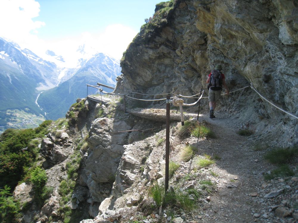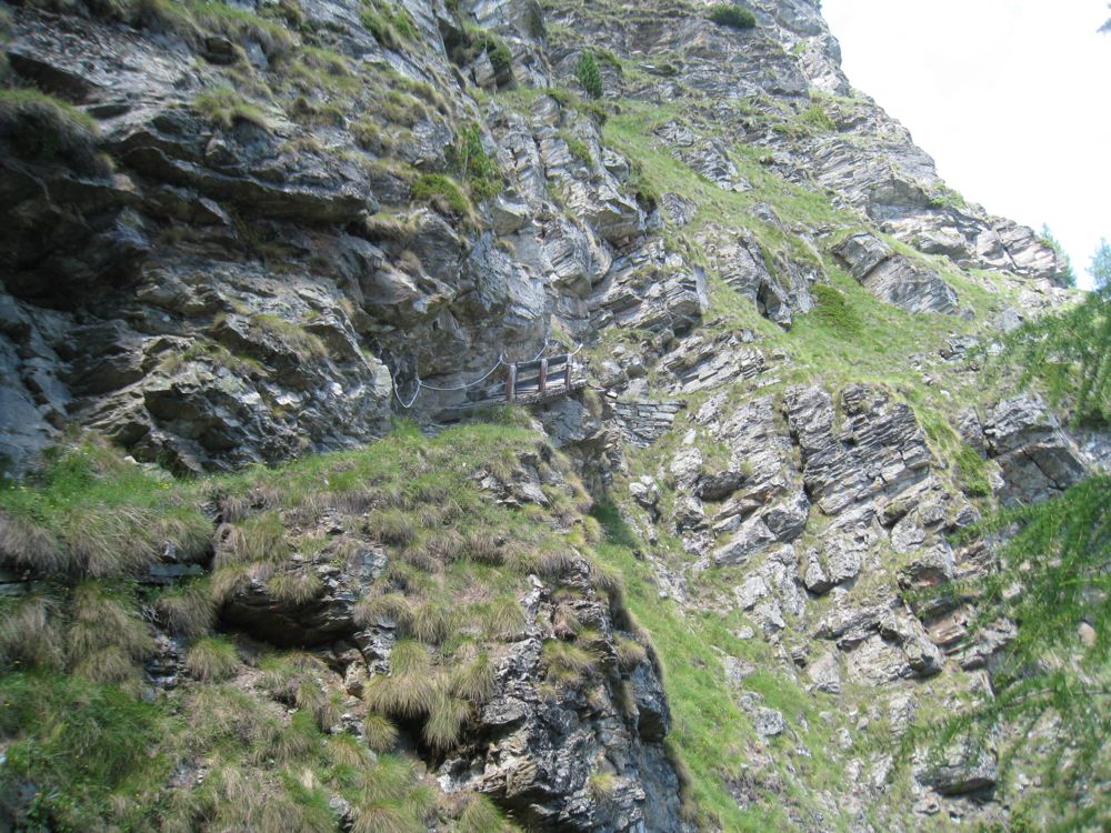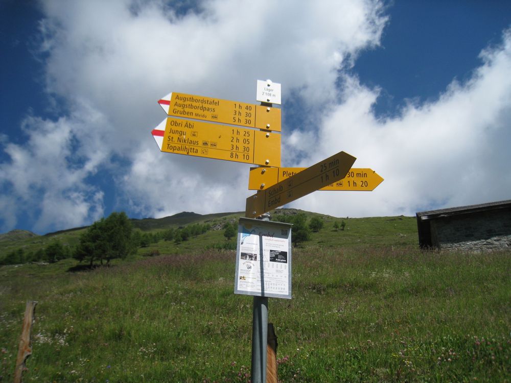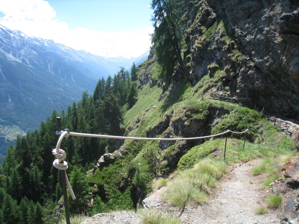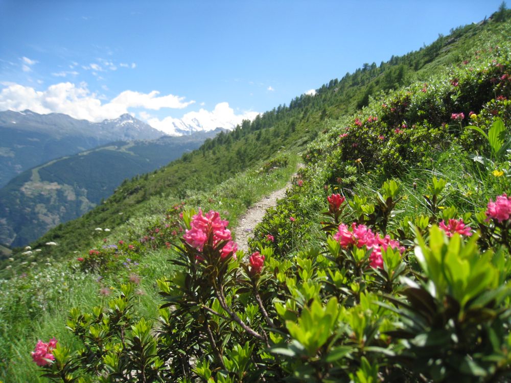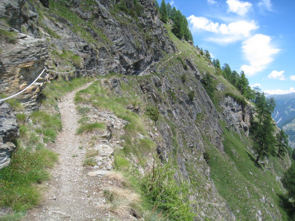 Im Tobel des Ischongbachs müssen wir durch einen Stollen gehen ( die Halter des Handlaufes sind weiss und man kann diese immer sehen auch wenn es dunkel ist). Später folgt nochmals ein kurzes Stollen. Wir kommen nach Läger 2099 mit seinem Alpgebäude. Von hier aus könnte man nochmals nach Embd hinabsteigen. Wir aber bleiben auf dem Höhenweg, der nun hinunter ins Tobel eines weiteren Bergbaches führt. Es folgt eine Partie am steilen Berghang. Der nächste Bach, den wir queren ist der Embdbach. Wir sind nun in einem kleinen Tal und sehen weiter oben die Hütten des Augstbordstaffels 2257m. Nun steigen wir in einem mit vielen Alpenrosenbüschen bewachsenen Hang hinauf zum Pkt Oberäbi 2190 mundund weiter zum Pkt.Wolftole 2180m.