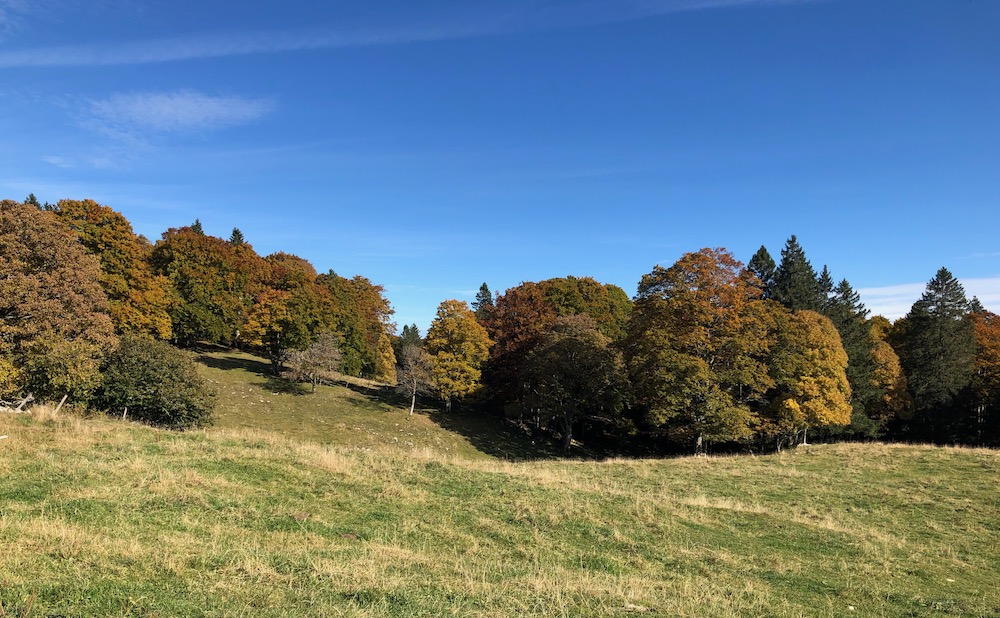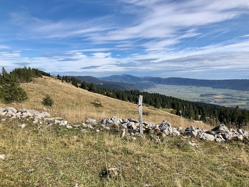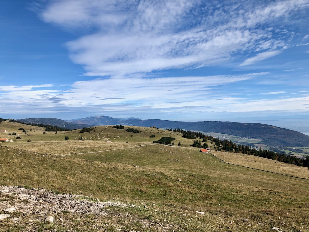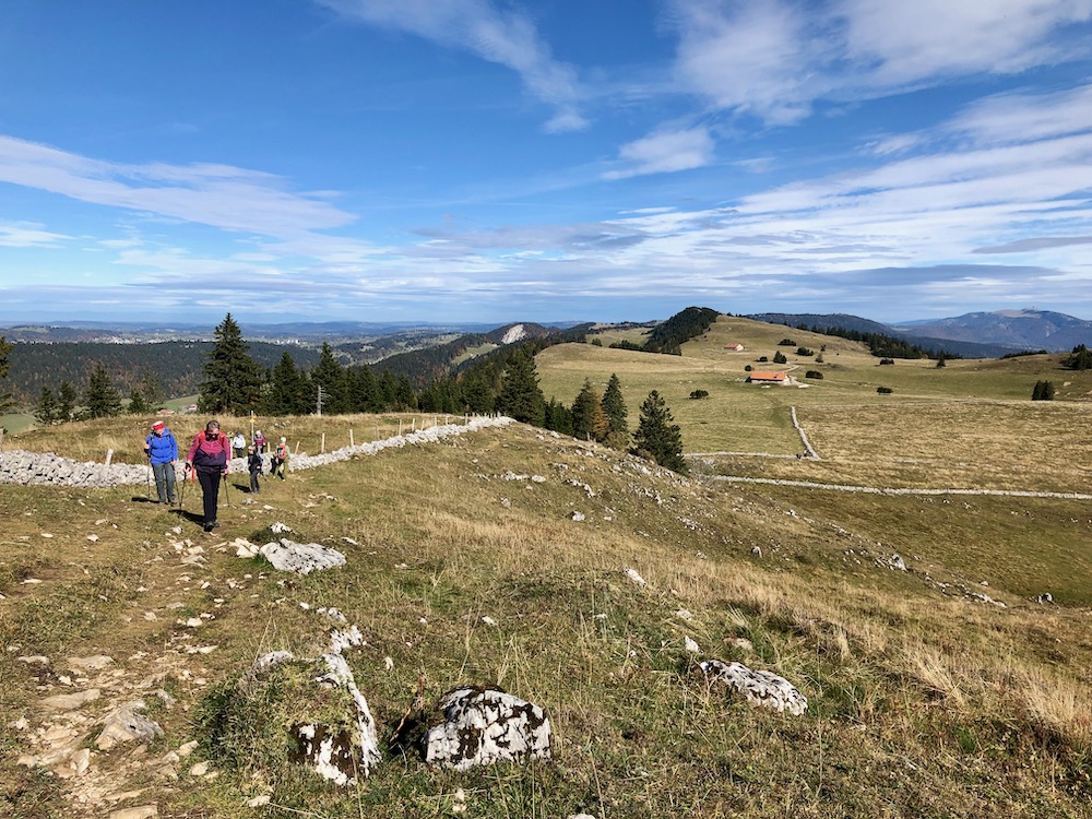 Wir wandern weiter auf dem Juraweg und steigen gegen Norden hinunter nach Grande Sagneule 1313m. Von dort gehen wir auf der Strasse und zweigen später auf einen Feldweg ab, der hinauf auf eine Anhöhe führt. Von dort gelangen wir zur Métairie du Grand Coeurie 1333m.