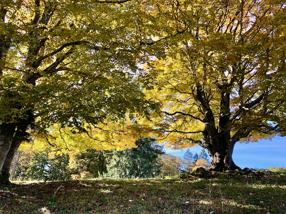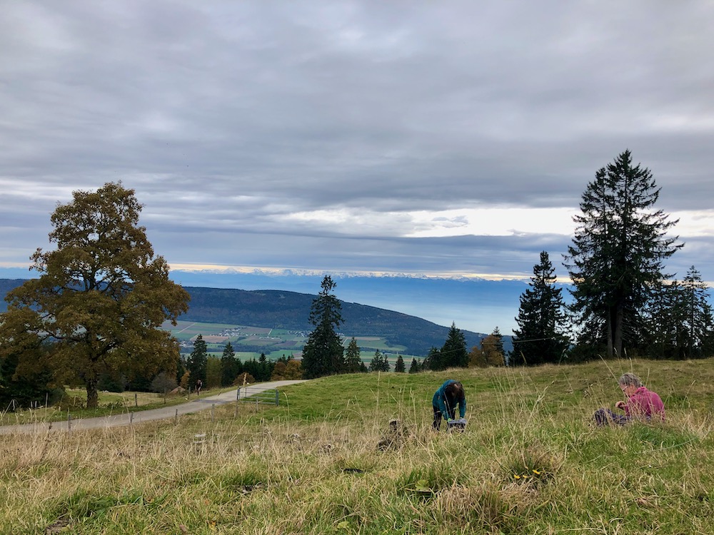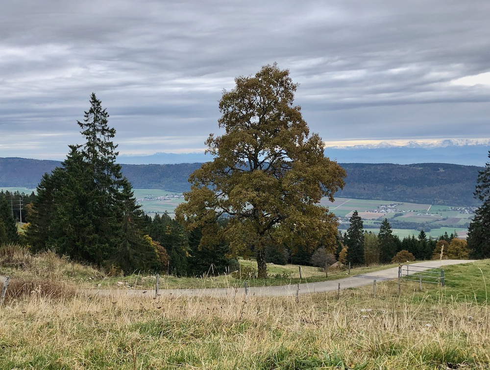 Wir fahren über Neuenburg nach Les Hauts – Geneveys, von wo wir über die Weiden und durch den Wald hinaufsteigen zum Restaurant unterhalb dem Tête de Ran, den wir aber nicht besteigen. Wir machen hier oben einen Stundenhalt und begeben uns dann auf den Jura Höhenweg, der uns über den langen Höhenzug hinüber in die Senke von les Grandes Pradières 1315m bringt. Das Wetter wrid immer besser, besonders im Norden sehen wir blauen Himmel und unversehens wandern wir im Sonnenschein !