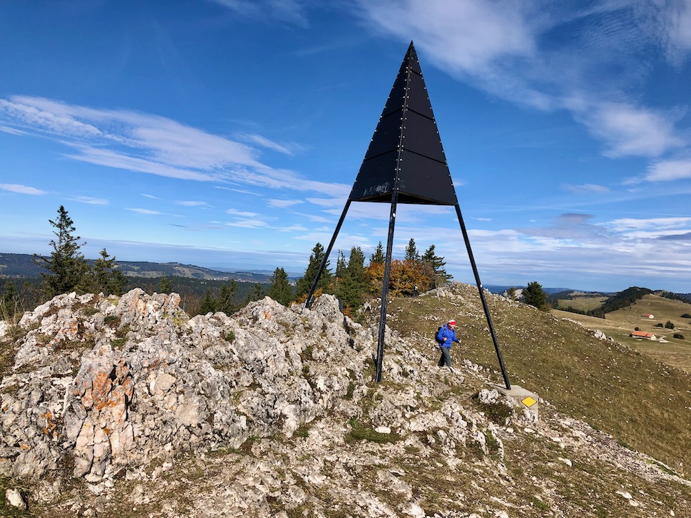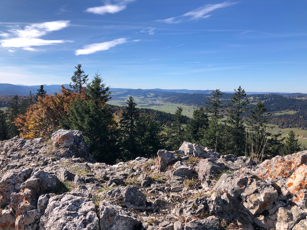 Vor dem leichten Abstieg in die Senke erblicken wir den Mont Racine, unser Tagesziel. Es gibt dort hinauf nochmals einen Anstieg durch felsiges Terrain und dann erreichen wir den Triangulationspunkt des besagten Berges. Hier halten wir unsere Mitagspause. Jeder sucht sicn einen Rastplatz aus. Wir geniessen den Sonnenschein und die Sicht auf den Neuenburgersee sowie auf die Alpen, die aber im Dunst undeutlich zu erkennen sind.
