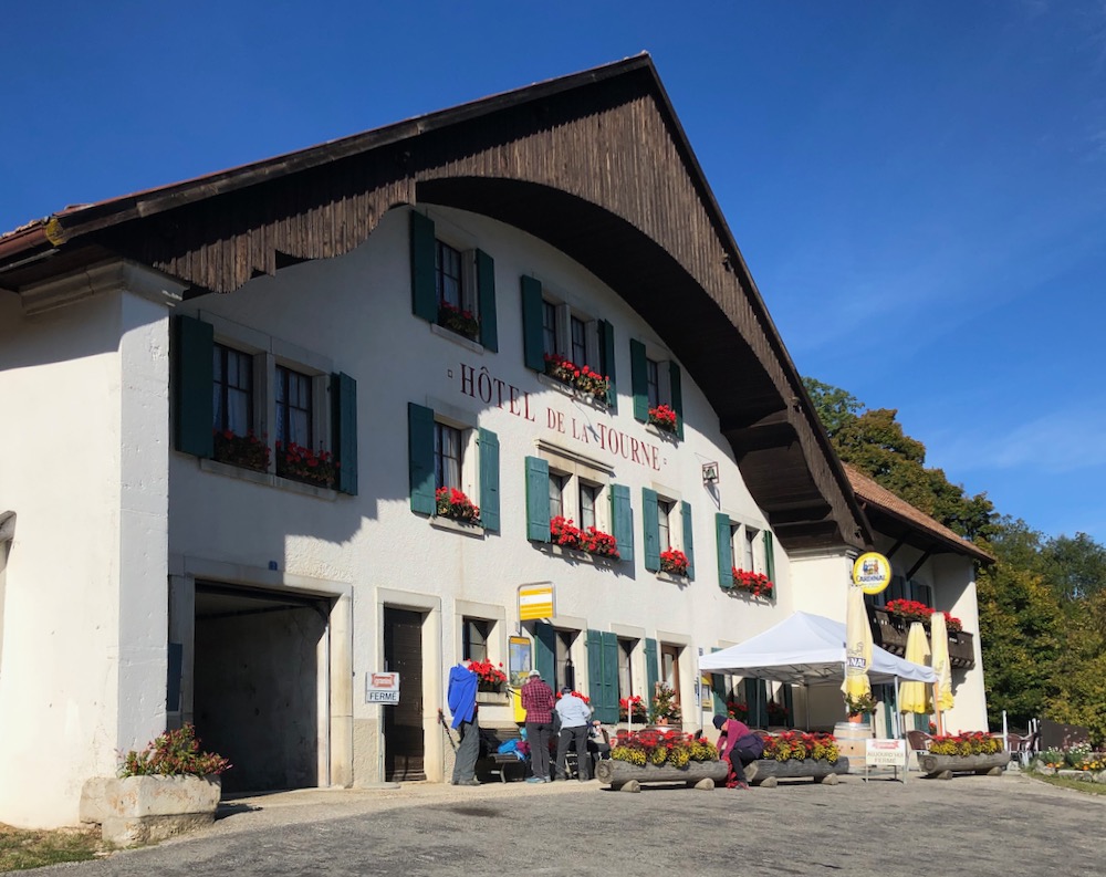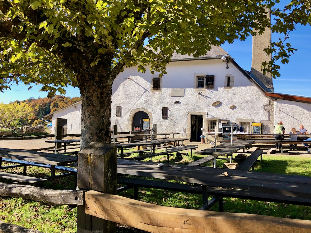 Von dort wandern wir hinüber zum Hof Petit Coeurie 1263m. Nun senkt sich der Weg und wir steigen durch den Wald hinunter zur Bushaltestelle Col de la Tourne. Leider ist das Restaurant geschlossen.