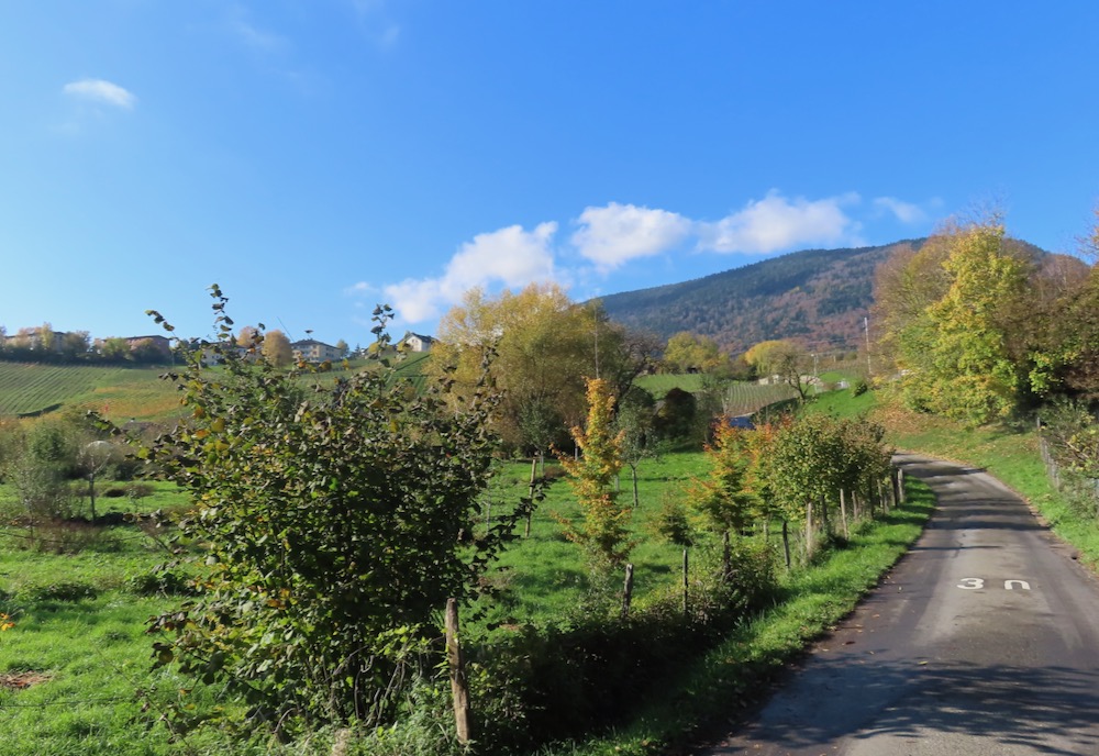 nach der Pause gehe ich wieder auf der Strasse und dann gibt es einen kleinen rutschigen Pfad im Walde, der später über einen Acker zur Ferme Prise Cornu führt.