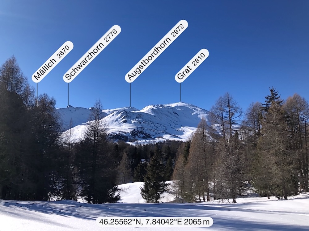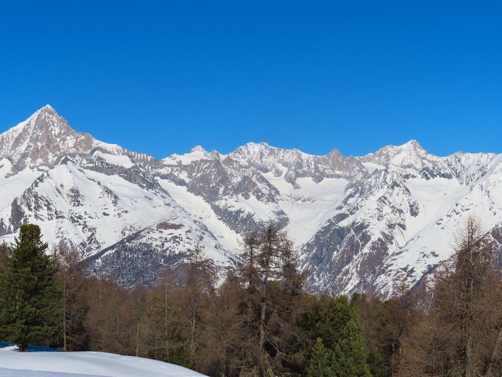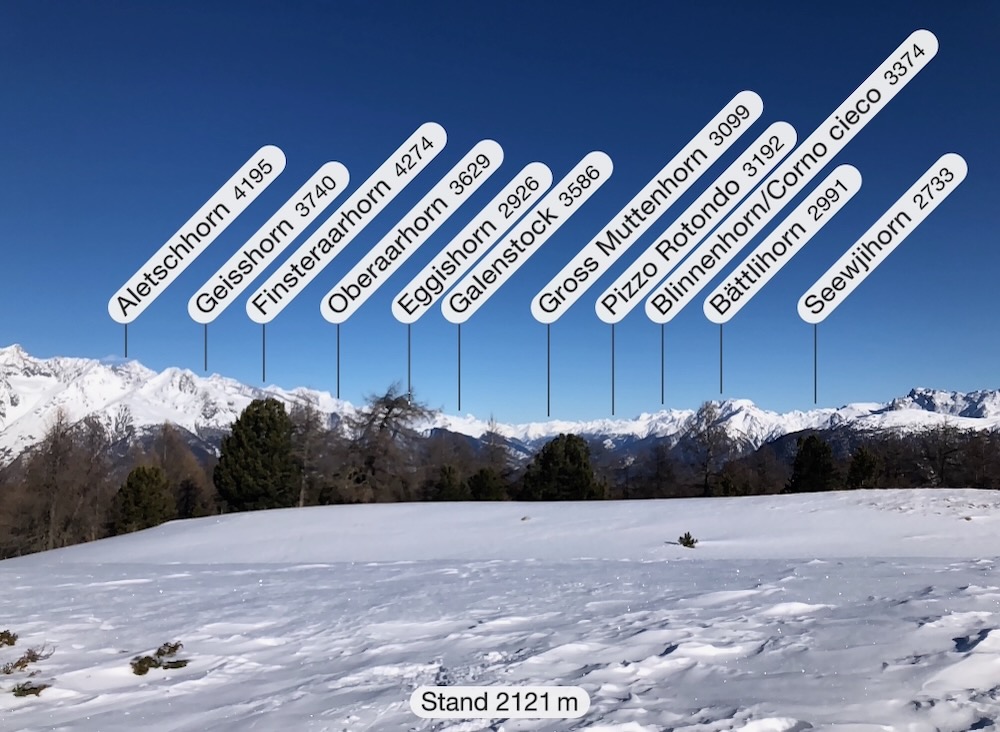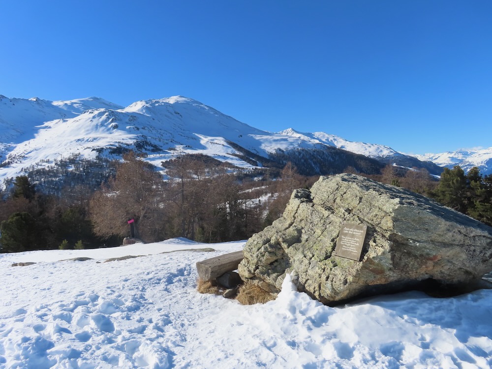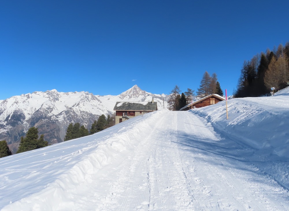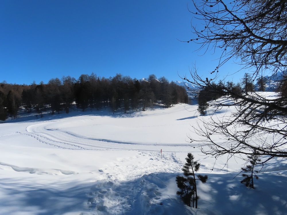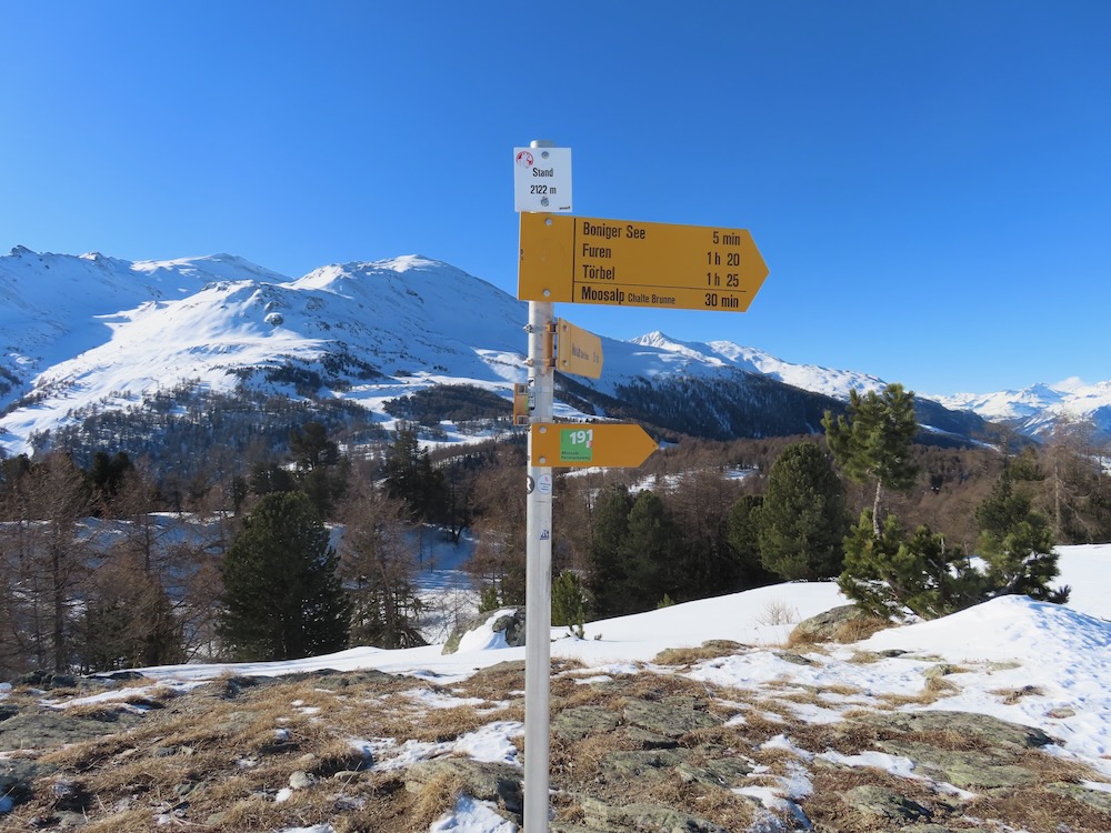 Die Gegend ist mir bekannt und ich weiss genau, wo ich mich befinde. Ich gehe spontan in die richtige Richtung und finde dann im Wald wieder einen Wegweiser. Nun steigt der Trail etwas an. Ich mache noch einen Abstecher zum Bonigersee, den ich noch nie im Winter gesehen habe, um dann in einem Bogen hinauf auf den Stand 2121m zu gelangen. Von hier aus hat man auf alle Seiten ein grossartiges Panorama. Allzulange kann ich nicht hier oben bleiben, denn ich habe noch einen langen Rückweg, der mich nun auf dem Sommerwanderweg zur Moosalp bringt. Zum Einkehren habe ich keine Zeit. Ich wandere weiter hinüber zur Bürchneralp und beschliesse dann, auf dem Sommerwanderqweg hinunter nach Bürchen zu steigen. Dieser Weg ist sogar als Schneeschuhtrail bezeichnet So gelange ich hinunter nach Bürchen, wo ich Restaurant Bärghüsli noch Zeit habe, eine heisse Ovo zu trinken, bevor den Bus hinunter nach Visp fährt.