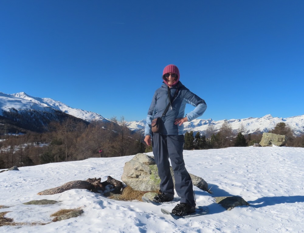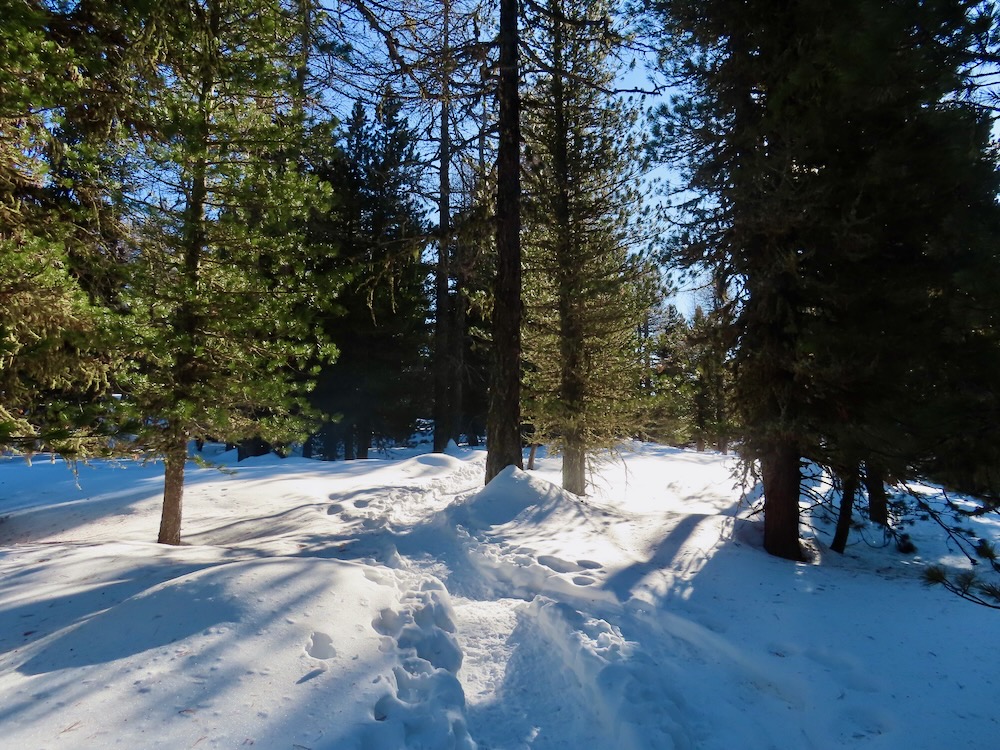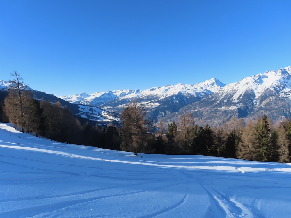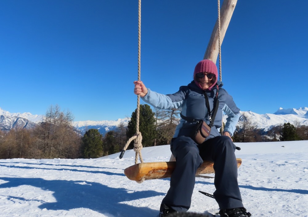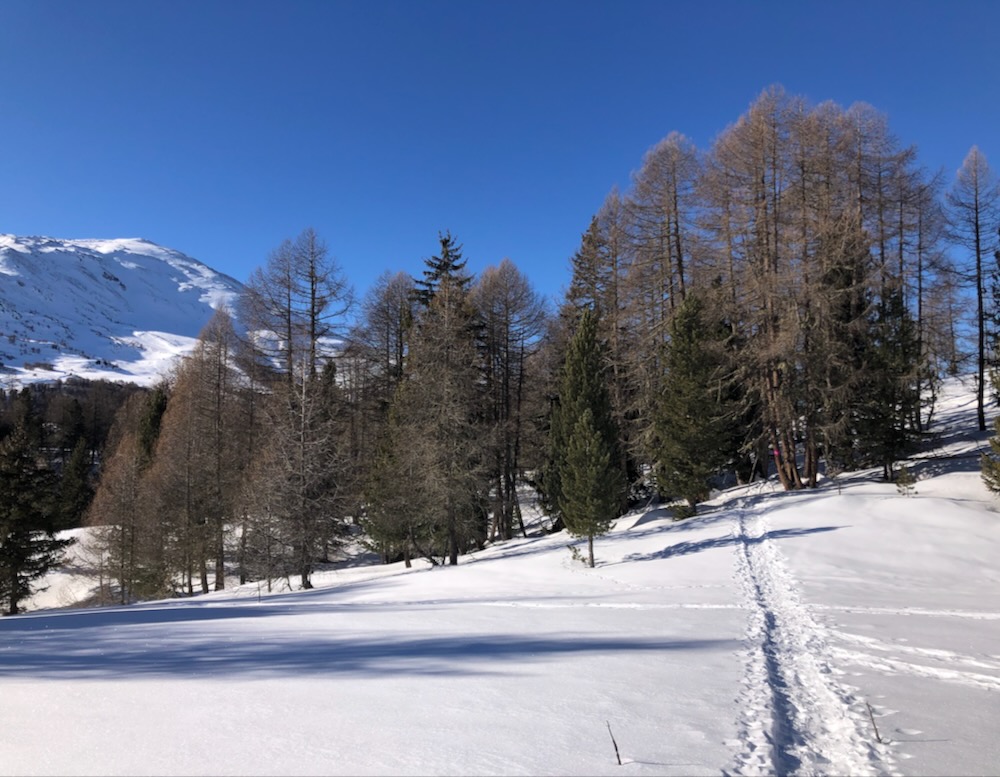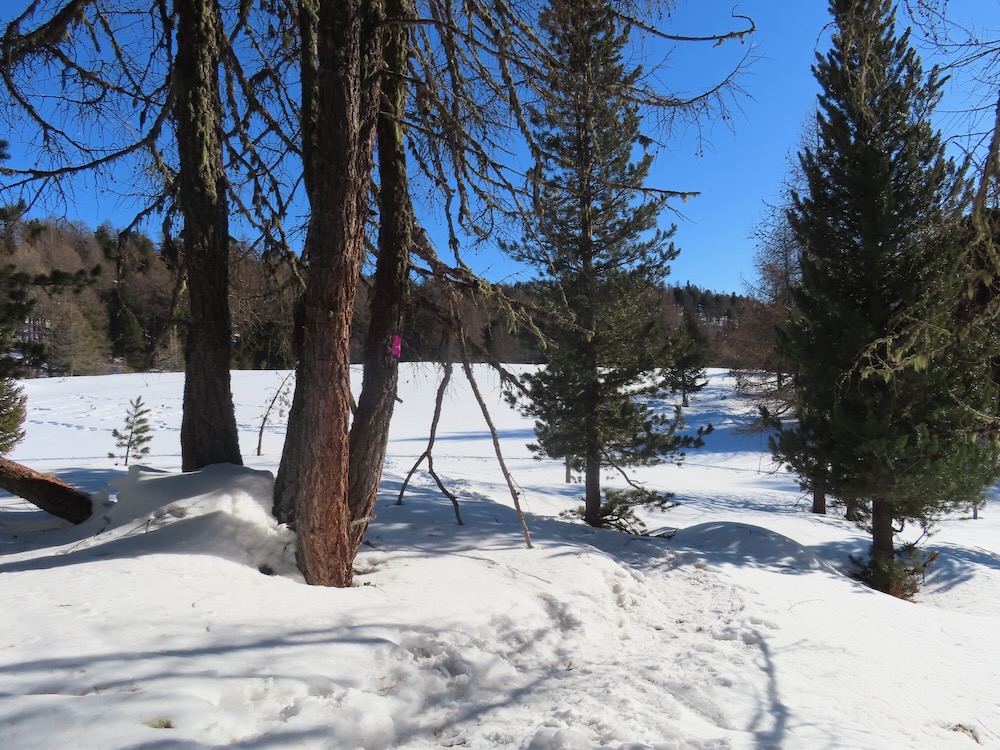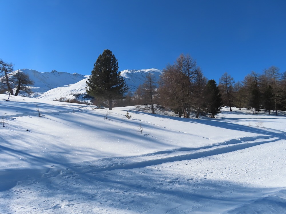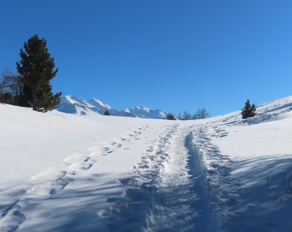 Heute möchte ich die Schneeschuhtour auf der Moosalp machen. Ich gelange mit dem Sessellift hinauf zum Ausgangspunkt der Wanderung. Zuerst geht es hinauf zur Bürchneralp, wo sich der Einstieg in den Trail befindet. Gleich bin ich im lichten Bergwald und folge der Spur. Wunderschön ist es hier. Ich bin ganz allein. Als ich wieder auf die offenen Fläche von Bieltini komme verliere ich die Spur. Es hat keine Wegweiser mehr.