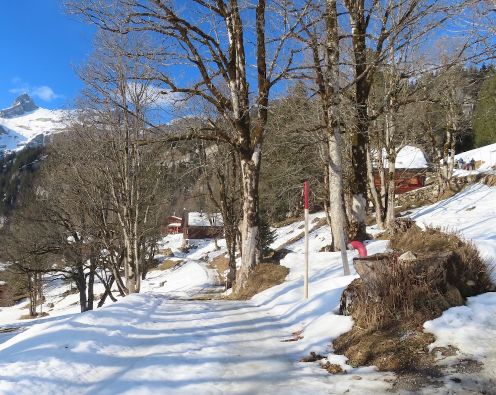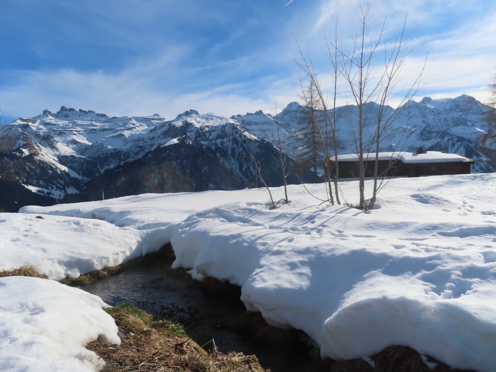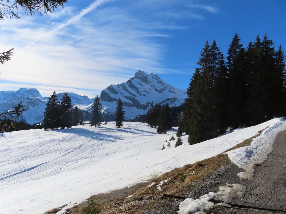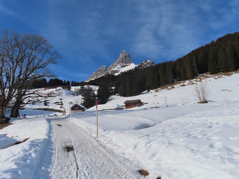 auch bewahrheitet. Um 10.30h bin ich am Ziel und beginne meine Wanderung hinauf nach Hüttberg, wo ich rechts auf den Wanderweg abzweige. Es ist nicht das erste Mal, dass ich diesen Wanderung mache. Teils ist die Naturstrasse aper und teils schneebedeckt. Die Sich hinüber zum Ortstock und die Eggstöcke ist immer wieder beeindruckend. So gelange ich in etlichen Kehren hinauf zu einer fast ebenen Fläche, von wo aus die Sicht auf die Berge besonders schön ist. Hier schalte ich einen kurzen Halt ein. Der Weg führt in seinem grossen Bogen weiter durch den Wald und hinauf zum Grotzenbüel 1581m, wo viel Betrieb herrscht. Schnell gehe ich weiter hinauf bis zur Abzweigung hinunter zum Unteren Stafel. Auf einer Bank mache meine Mittagspause bevor ich gemächlich weiter hinunter nach Braunwald wandere.