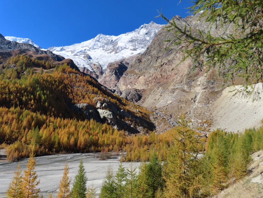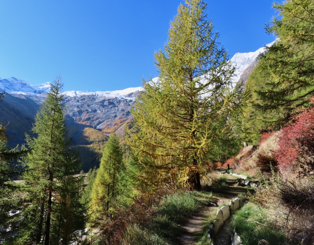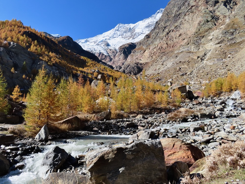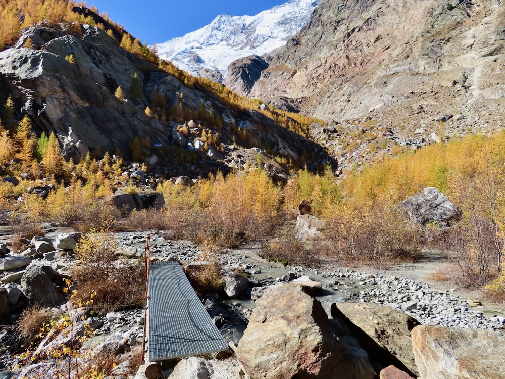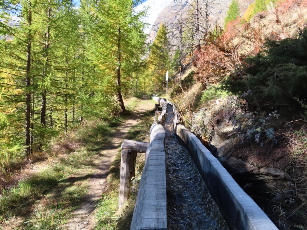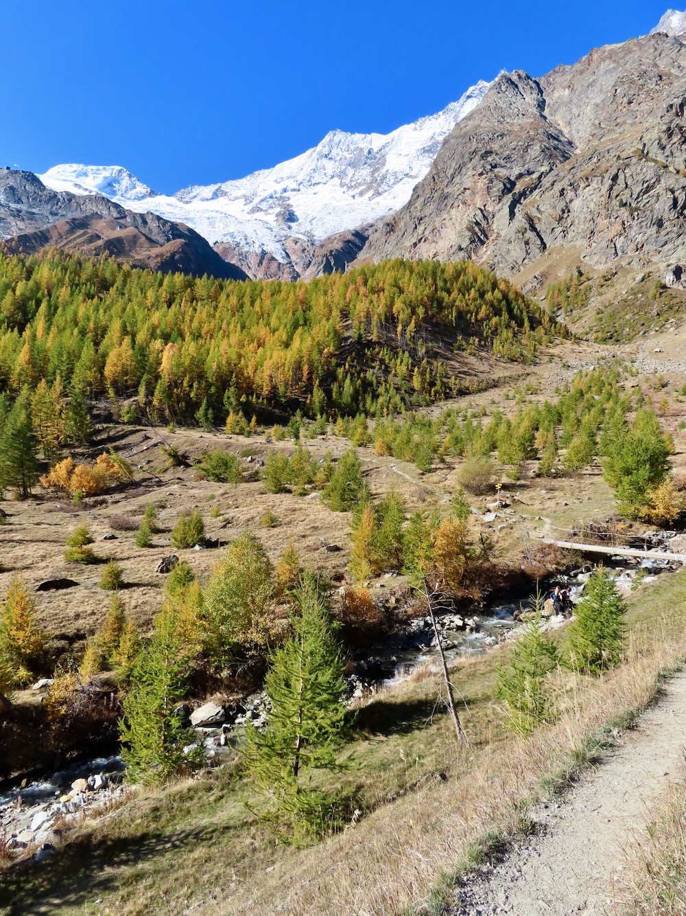 Die Ankunft in Saas Fee ist wegen der Bergsicht immer wieder überwältigend. Ich mache mich gleich auf den Weg zur Hannigbahn und wandere dann der Suone Unnerwasser entlang in den Talgrund hinein. Wunderschön ist es, hier zu gehen! Die Lärchen hier sind teils noch etwas grün. Der Wanderweg führt in das offene Gelände und dann hinauf auf den künstlichen Damm des Triftbaches, hinunter über die Brücke und dann in den Wald Gand. Hier steige ich durch den schon recht gelben Bergwald