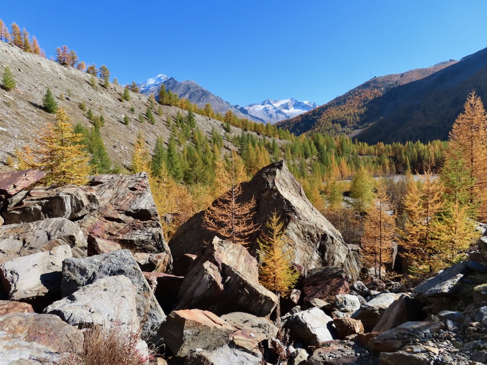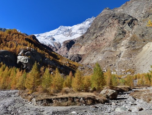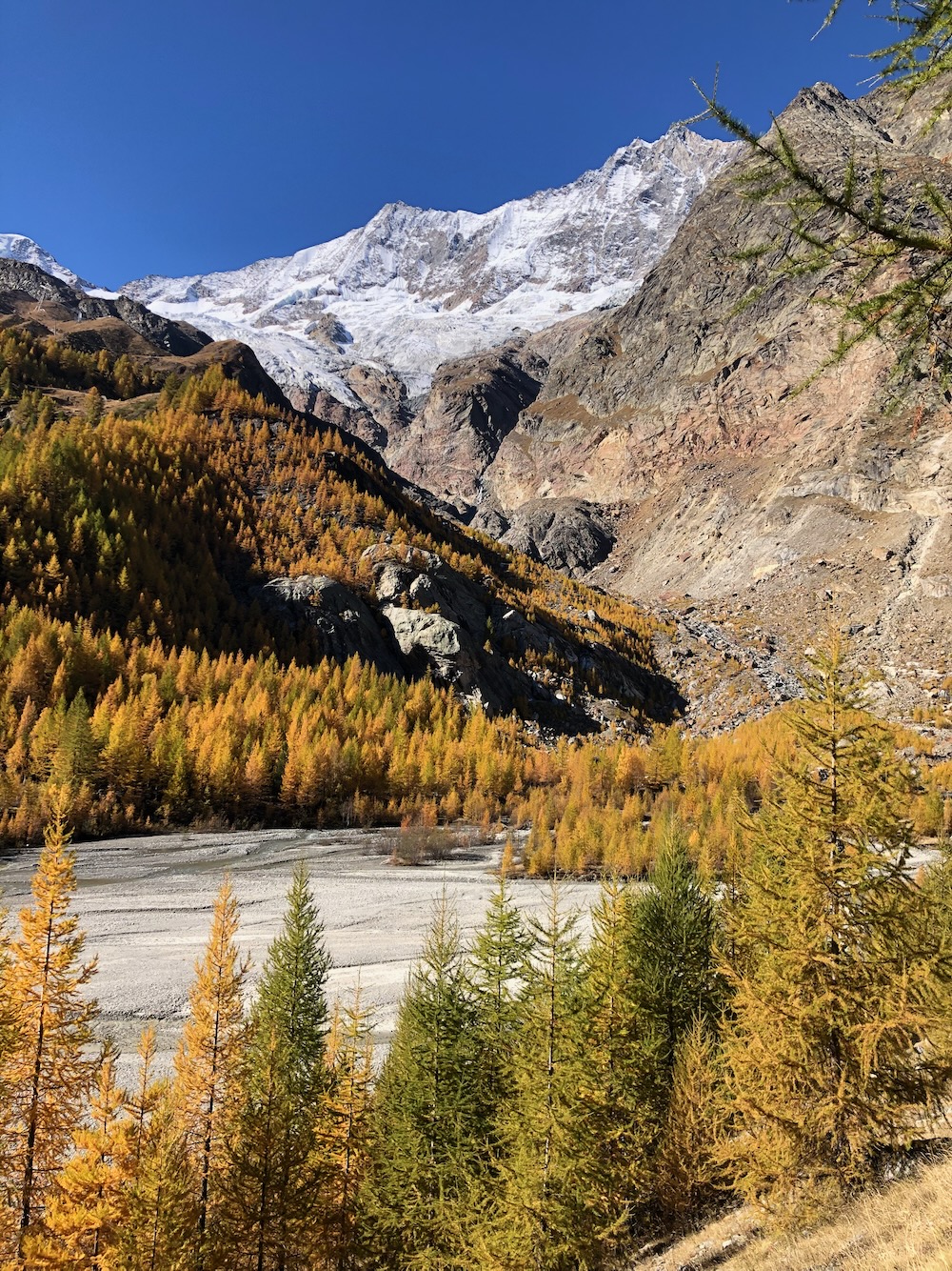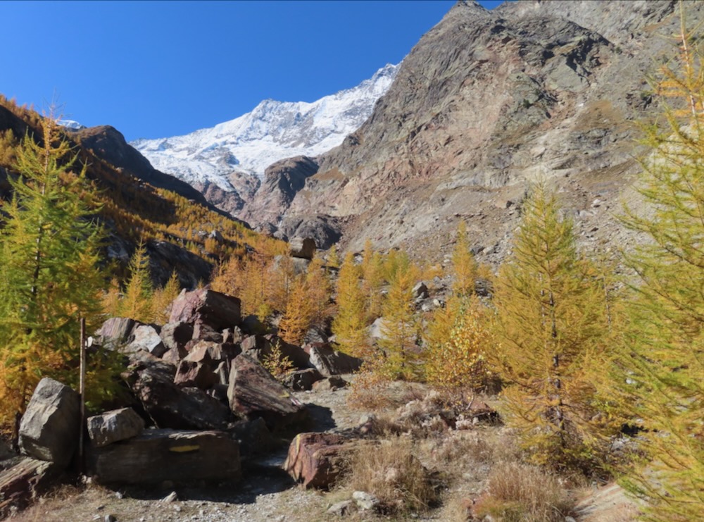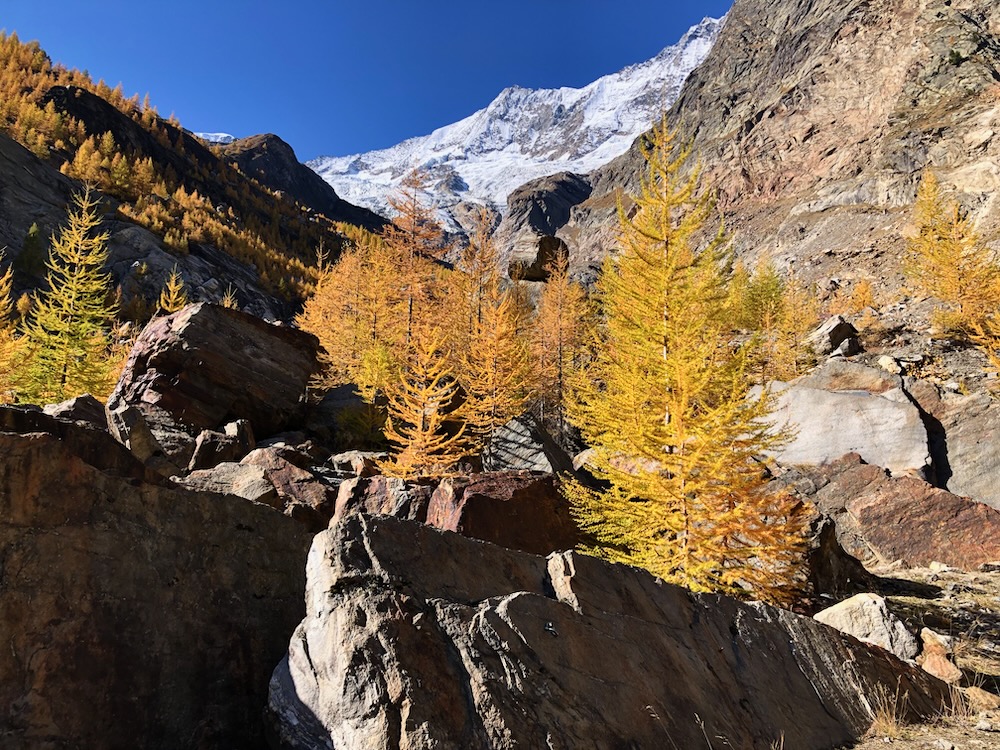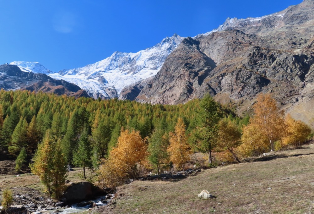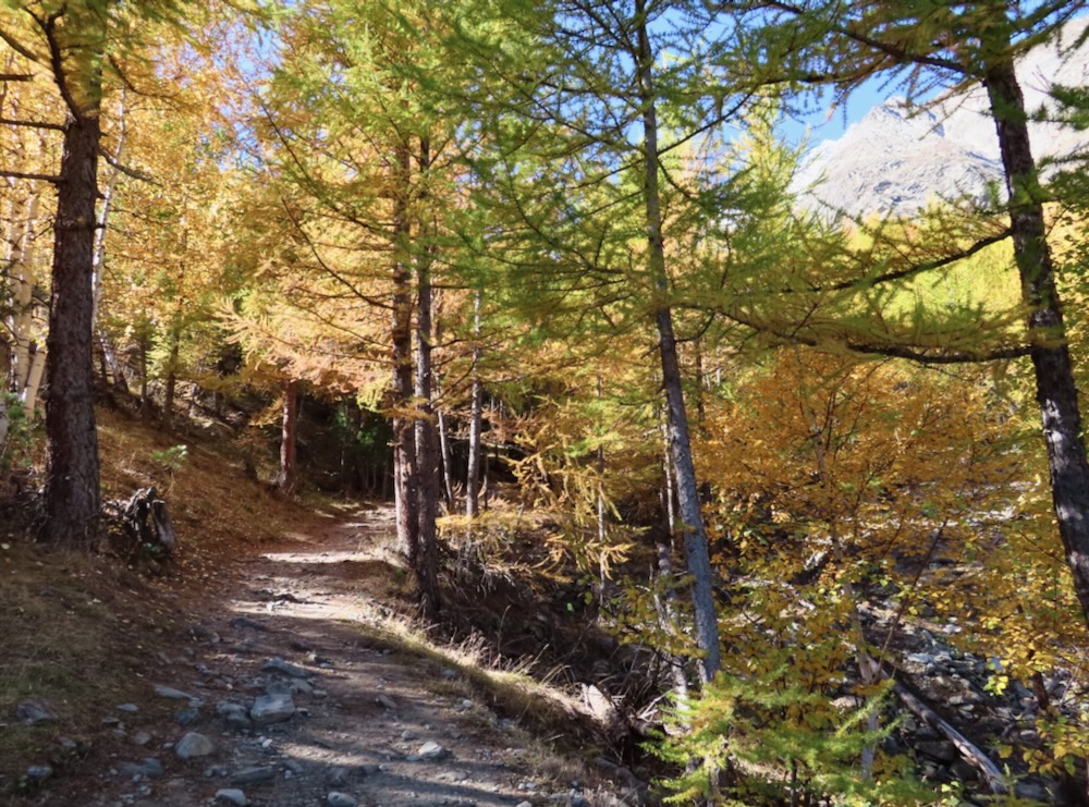Die Ankunft in Saas Fee ist wegen der Bergsicht immer wieder überwältigend. Ich mache mich gleich auf den Weg zur Hannigbahn und wandere dann der Suone Unnerwasser entlang in den Talgrund hinein. Wunderschön ist es, hier zu gehen! Die Lärchen hier sind teils noch etwas grün. Der Wanderweg führt in das offene Gelände und dann hinauf auf den künstlichen Damm des Triftbaches, hinunter über die Brücke und dann in den Wald Gand. Hier steige ich durch den schon recht gelben Bergwald
