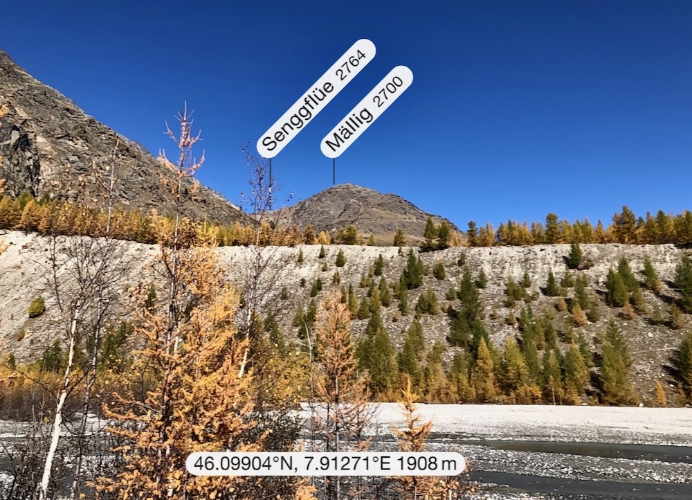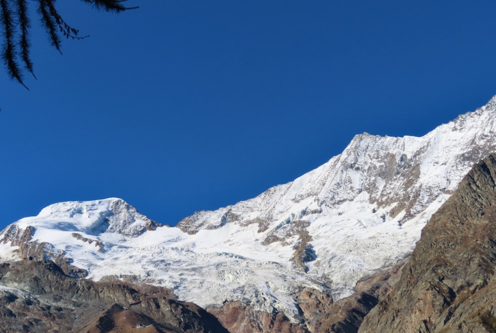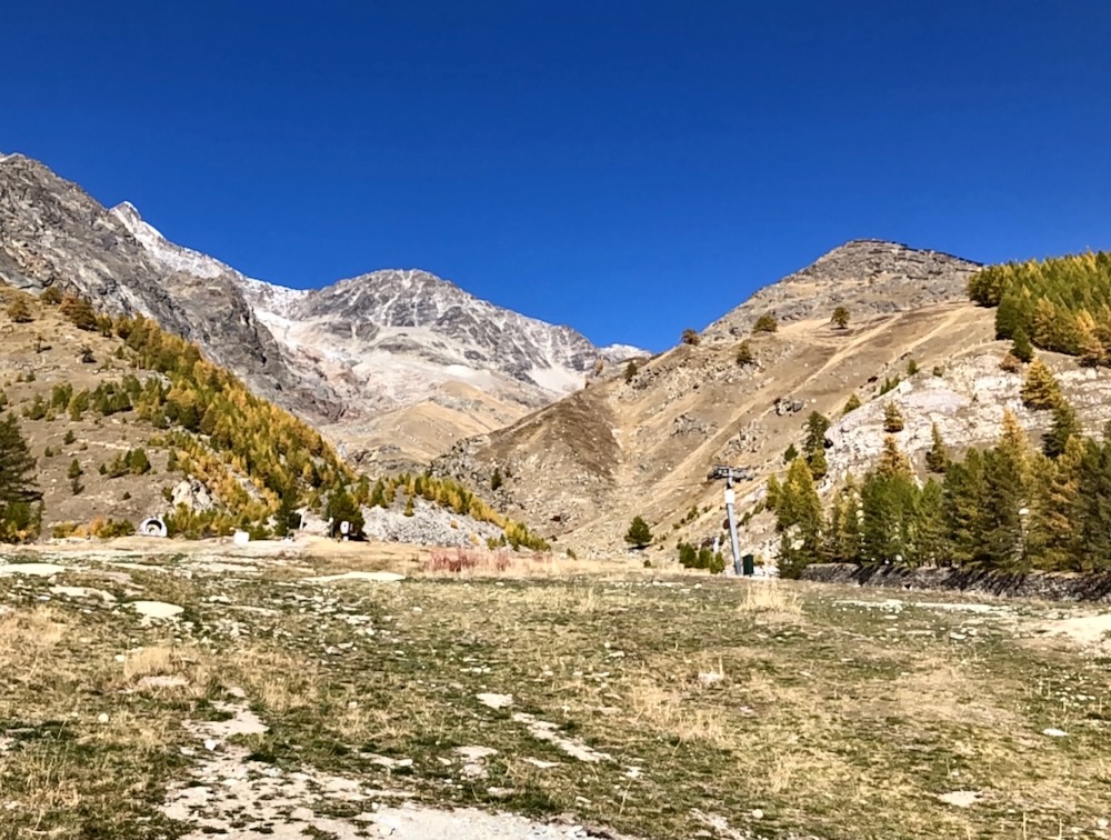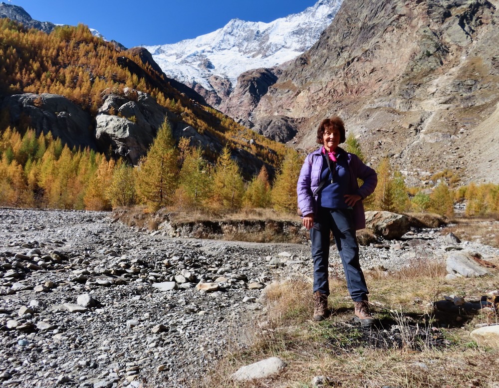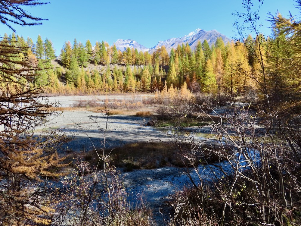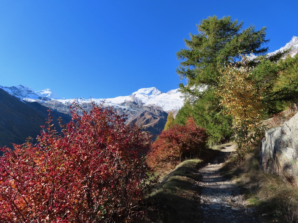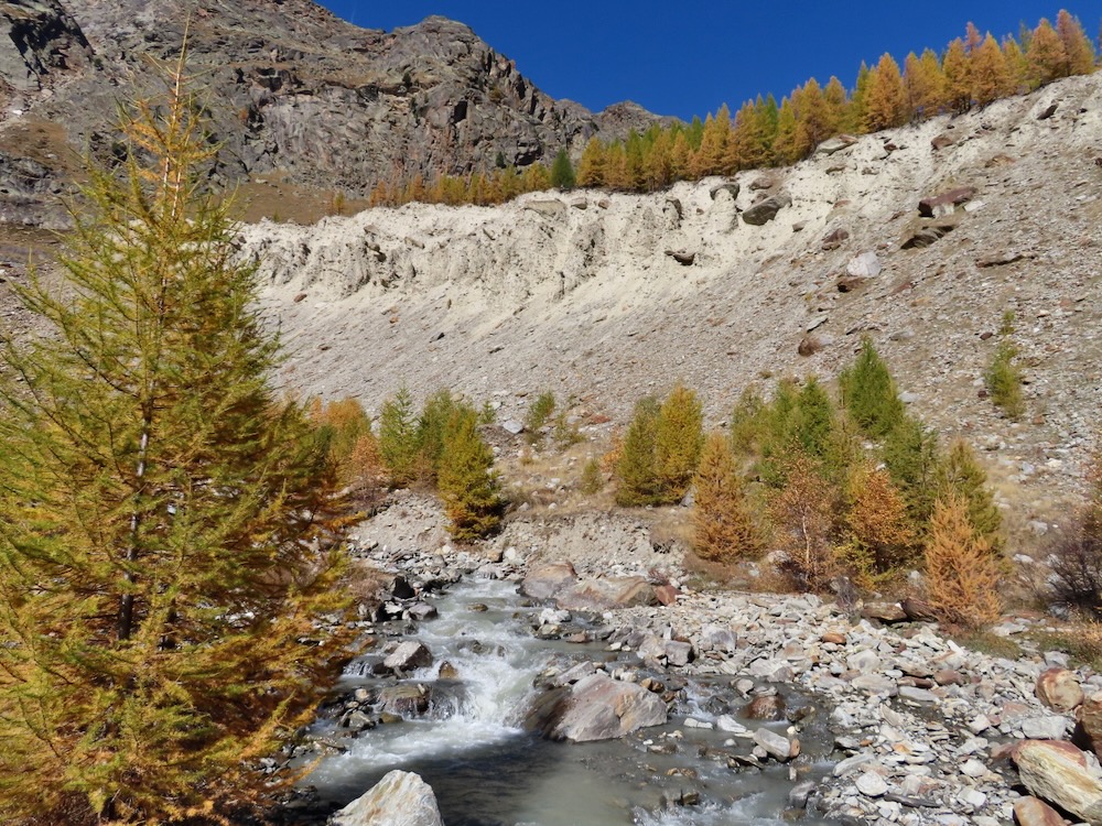 Die Ankunft in Saas Fee ist wegen der Bergsicht immer wieder überwältigend. Ich mache mich gleich auf den Weg zur Hannigbahn und wandere dann der Suone Unnerwasser entlang in den Talgrund hinein. Wunderschön ist es, hier zu gehen! Die Lärchen hier sind teils noch etwas grün. Der Wanderweg führt in das offene Gelände und dann hinauf auf den künstlichen Damm des Triftbaches, hinunter über die Brücke und dann in den Wald Gand. Hier steige ich durch den schon recht gelben Bergwald
