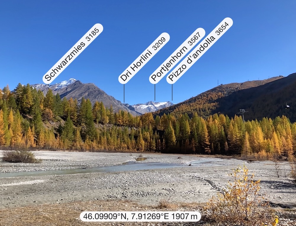 Ich steige auf dem schmalen Weg hinunter zum sog.Gletschersee, der gar nicht existiert. Hier unten fliesst die Feeruvispa durch ein breites Gletschervorfeld. Die Gegend hier ist sehr malerisch und lädt ein zum fotografieren! Ich lasse mir Zeit, die Gegend zu erkunden und wandere dann auf der anderen Talseite in der Nähe der Schwemmebene hinunter. Bei der Brücke im Wald halte ich meine Mittagsrast. Über mir gleiten die Gondeln der Spielbodenbahn ! Ich wandere durch den Wald zurück und über den P. 1807m. Der Weg zur Busstation zieht sich in die Länge.