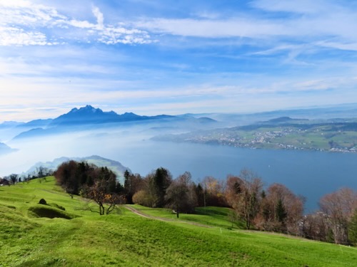 Heute sind wir zu dritt unterwegs auf die Rigi. Wir benutzen das Schiff von Luzern nach Weggis und die Seilbahn,um hinauf nach Rigi Kaltbad zu gelangen. Nun befinden wir uns über dem Nebelmeer und und können bald auf einer Bank unseren Mittagshalt machen und die eindrucksvolle Sicht geniessen.
