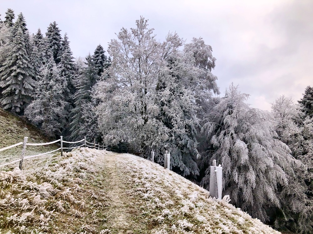 Heute bin ich trotz des schlechten Wetters unterwegs. Ich möchte wegen des tiefligenden Nebels den Raureif erleben. Ich habe einen Ort gesucht, der nicht allzu weit von Basel entfernt ist. Da mir die Gegend des Eigenthals nicht so bekannt ist, wollte ich dort etwas ausprobieren. Ich bin auf dem Netz auf die Gemeinde Schwarzenberg gestossen und habe mir die Rundwanderung „Grosse Welt“ ausgesucht.