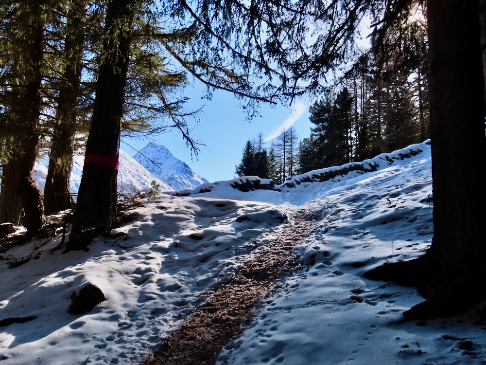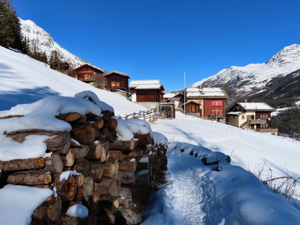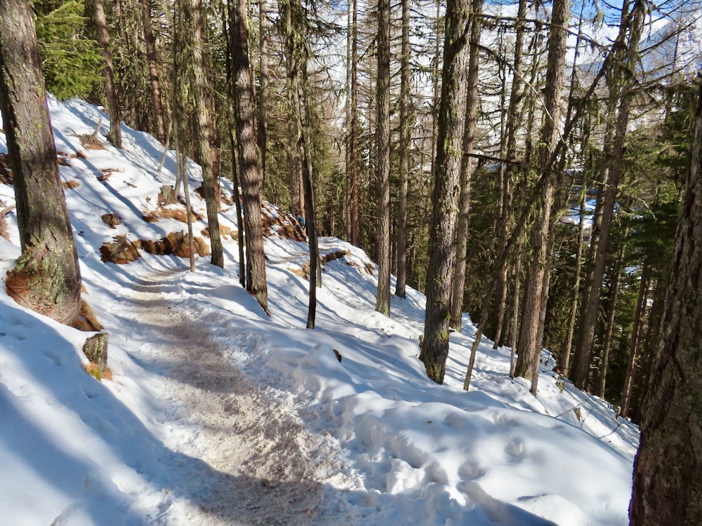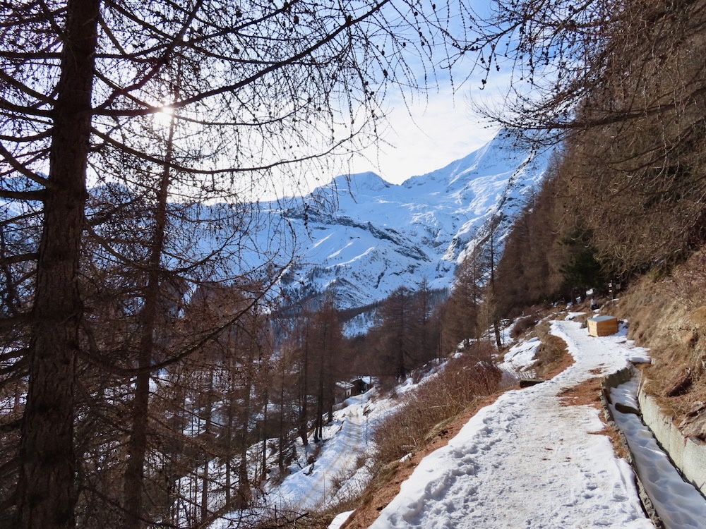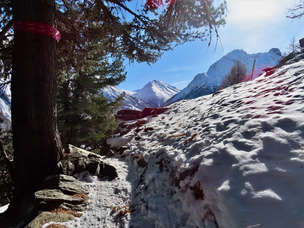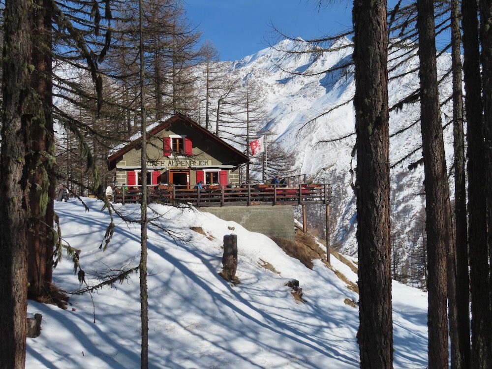 Auf der Suche nach Schnee fahre ich heute hoch hinauf nach Saas Fee. Auch hier gibt es an den Südhängen einige apere Stellen ! Ich wandere zuerst auf demSuonenweg gegen den Dorfteil Wildi und dann auf dem Waldweg zum Restaurant und Waldhotel Fletschhorn. Ab diesem Punkt kann ich auf den Sommerwanderweg oder nun Schneeschuhtrail wechseln. Bei diesen Verhältnissen brauche ich dazu keine Schneeschuhe ! Ich gehe nicht das erste Mal auf diesem Pfad. Nach dem Austritt aus dem Wald hat man eine schöne Sicht auf den sonnenbeschienen Weiler Sengg 1798m. Hier halte ich auf einer Bank vor einer Alphütte meine Mittagsrast und geniesse die Ruhe und die Aussicht. Ich steige dann über ein Schneefeld hinauf zum Waldrand und folge dem Pfad. Es gibt zwei etwas schwierige Stellen, die ich aber dank den Stöcken bewältigen kann. Um 11.55h erreiche ich den Punkt Unner Senggbodu 1875m. Von hier aus geht es weiter auf der schmalen Spur durch den Bergwald bis zu einer Kurve, wo ein Gebäude steht. Hier bin ich auch schon auf dem Weg hinauf zum Hannig vorbeigekommen. Ich beschliesse, in Richtung Restaurant Alpenblick zu gehen.