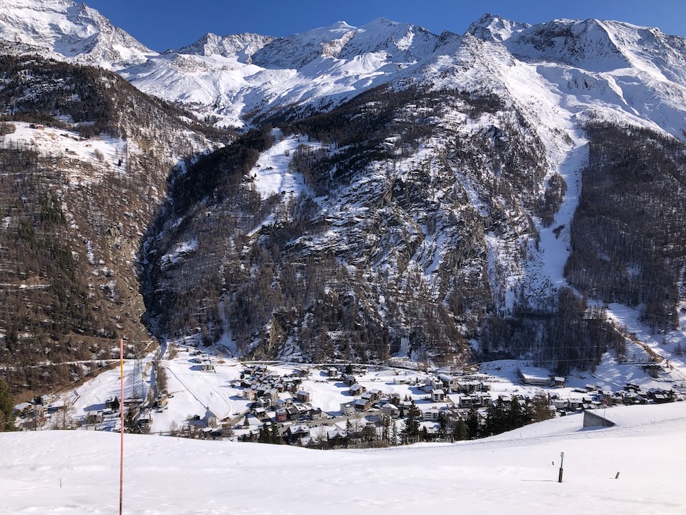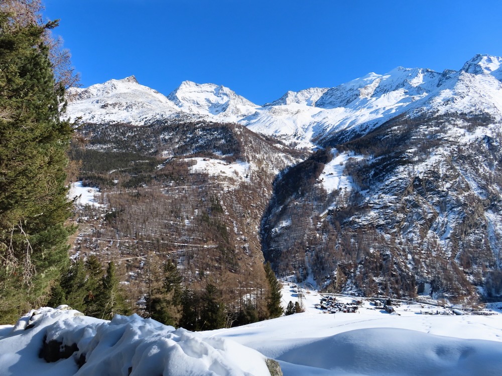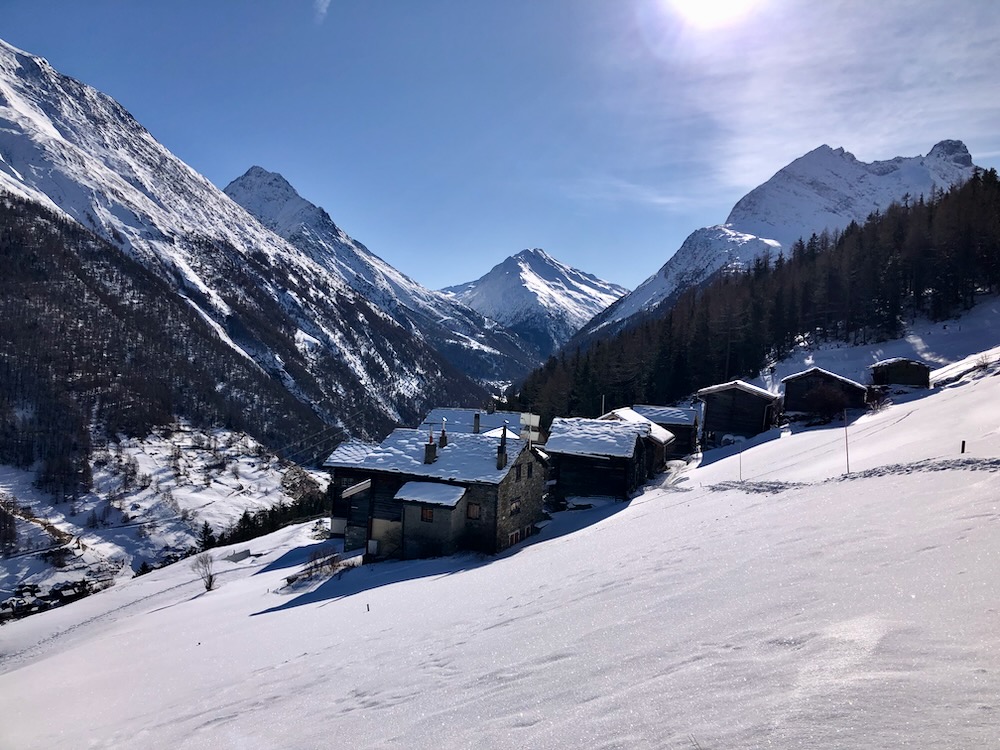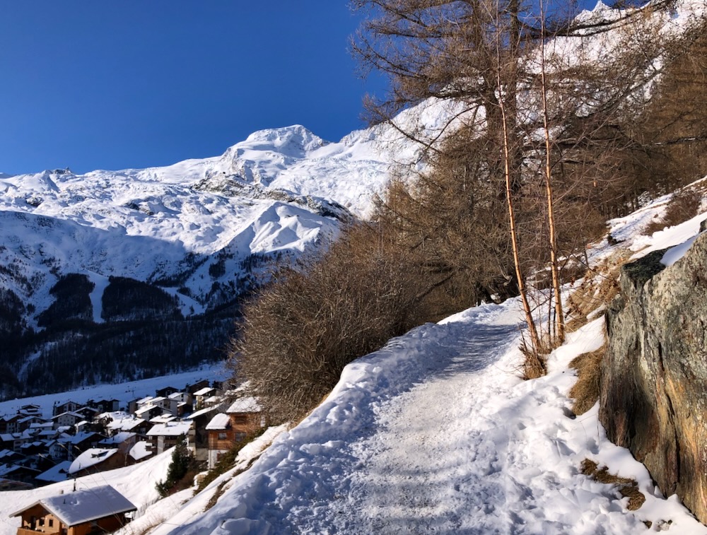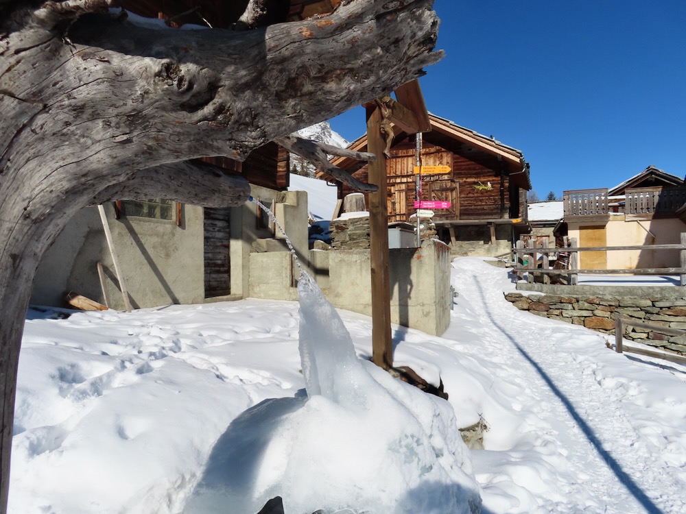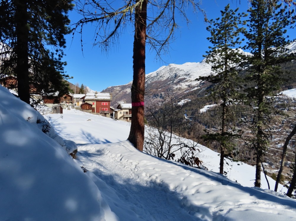 Auf der Suche nach Schnee fahre ich heute hoch hinauf nach Saas Fee. Auch hier gibt es an den Südhängen einige apere Stellen ! Ich wandere zuerst auf demSuonenweg gegen den Dorfteil Wildi und dann auf dem Waldweg zum Restaurant und Waldhotel Fletschhorn. Ab diesem Punkt kann ich auf den Sommerwanderweg oder nun Schneeschuhtrail wechseln. Bei diesen Verhältnissen brauche ich dazu keine Schneeschuhe ! Ich gehe nicht das erste Mal auf diesem Pfad. Nach dem Austritt aus dem Wald hat man eine schöne Sicht auf den sonnenbeschienen Weiler Sengg 1798m. Hier halte ich auf einer Bank vor einer Alphütte meine Mittagsrast und geniesse die Ruhe und die Aussicht. Ich steige dann über ein Schneefeld hinauf zum Waldrand und folge dem Pfad. Es gibt zwei etwas schwierige Stellen, die ich aber dank den Stöcken bewältigen kann. Um 11.55h erreiche ich den Punkt Unner Senggbodu 1875m. Von hier aus geht es weiter auf der schmalen Spur durch den Bergwald bis zu einer Kurve, wo ein Gebäude steht. Hier bin ich auch schon auf dem Weg hinauf zum Hannig vorbeigekommen. Ich beschliesse, in Richtung Restaurant Alpenblick zu gehen.
