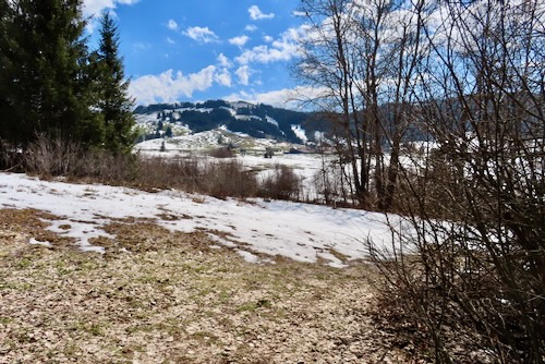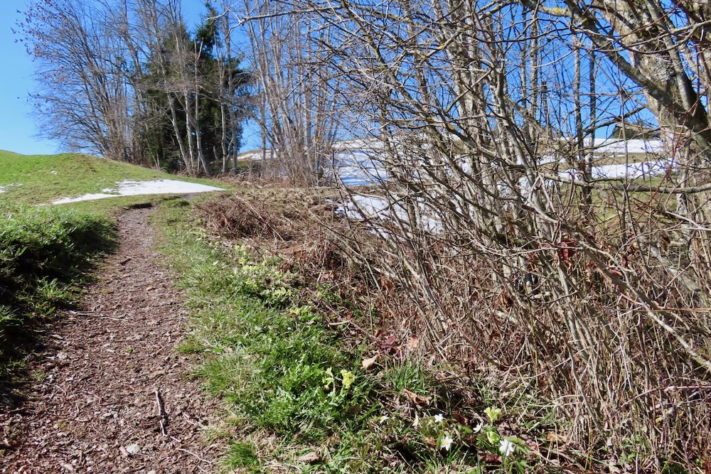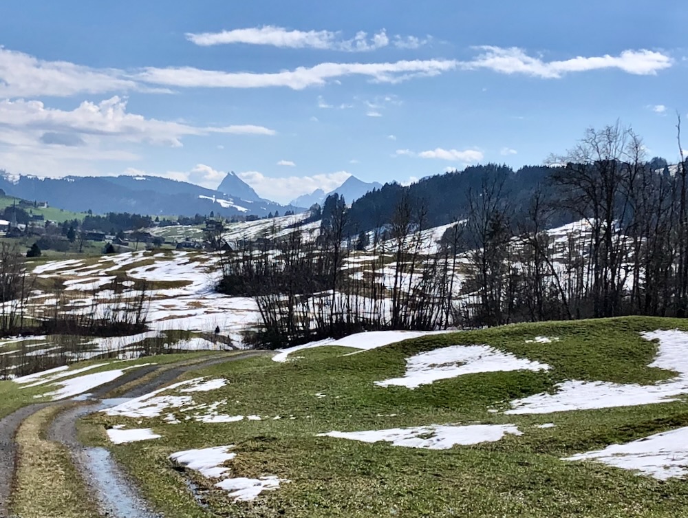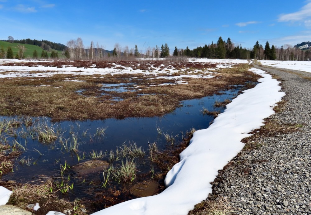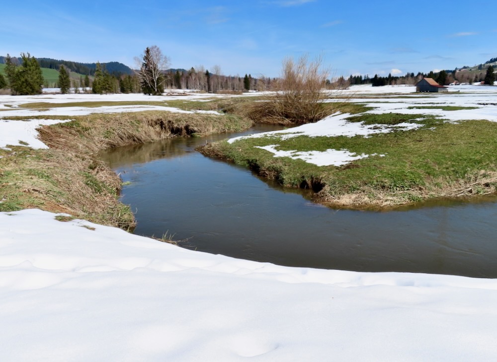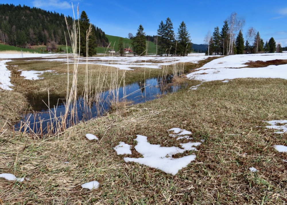 Aber ich gehe fast immer auf Naturwegen, was leider oft nicht mehr der Fall ist. Die Gegend entlang des Baches Biber ist leicht hügelig und daher recht abwechslungsreich. Anfangs der Wanderung sehe ich von Biberbrugg aus das Panorama hinter Einsiedeln gegen Ende sehe ich die Mythen und rechts den Morgartenweg, wo ich vor vielen Jahren zwei Schneeschuhtouren gemacht habe. Beim Bibersteg muss ich wählen: soll ich geradeaus weiter nach Rotenthurm laufen oder nach Raten hinaufsteigen. Eigentlich habe ich genug und ich beschliesse, nun ein Stück auf Hartbelag gegen Steinstoss zu gehen. Ich kenne das Rotenthurmermoor von einer Schneeschuhtour und vom Sommer. Aber im Frühling war ich noch nie da. Das ist ein spezielles Erlebnis mit den offenen Flächen teils weiss vom Schnee teils braun vom Ried und den vielen gurgelnden Wasserläufen.