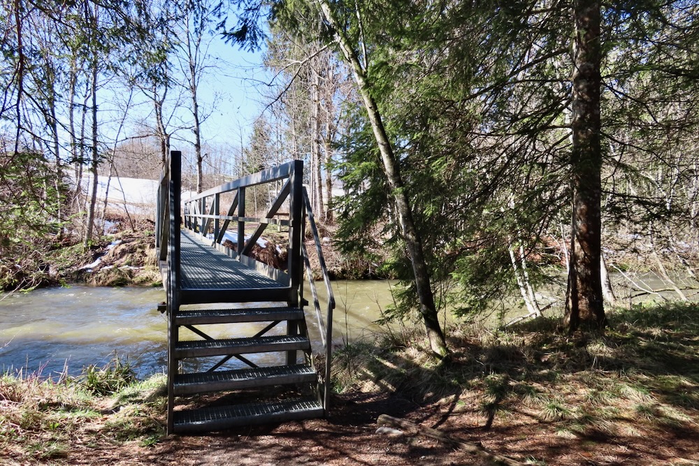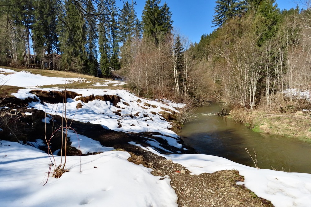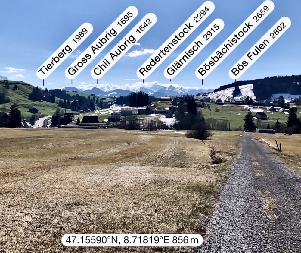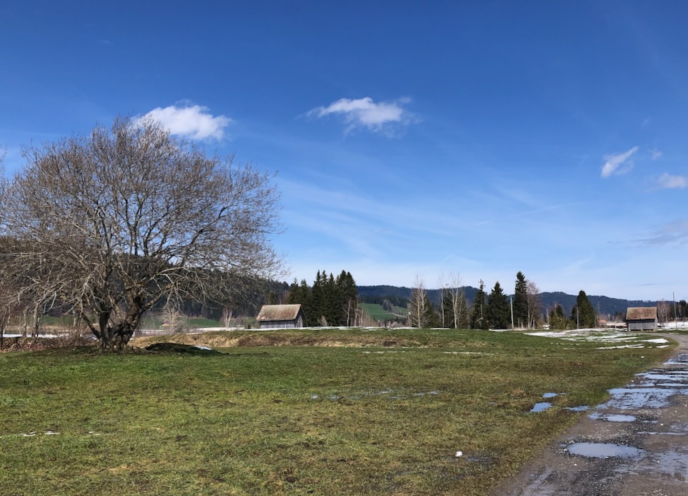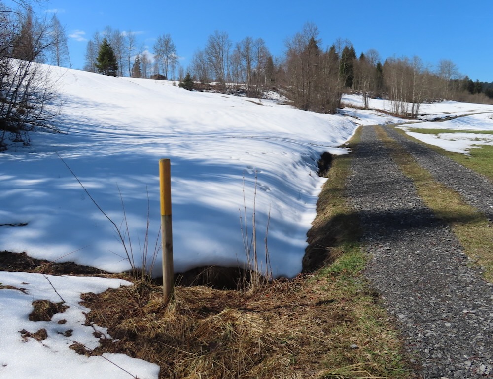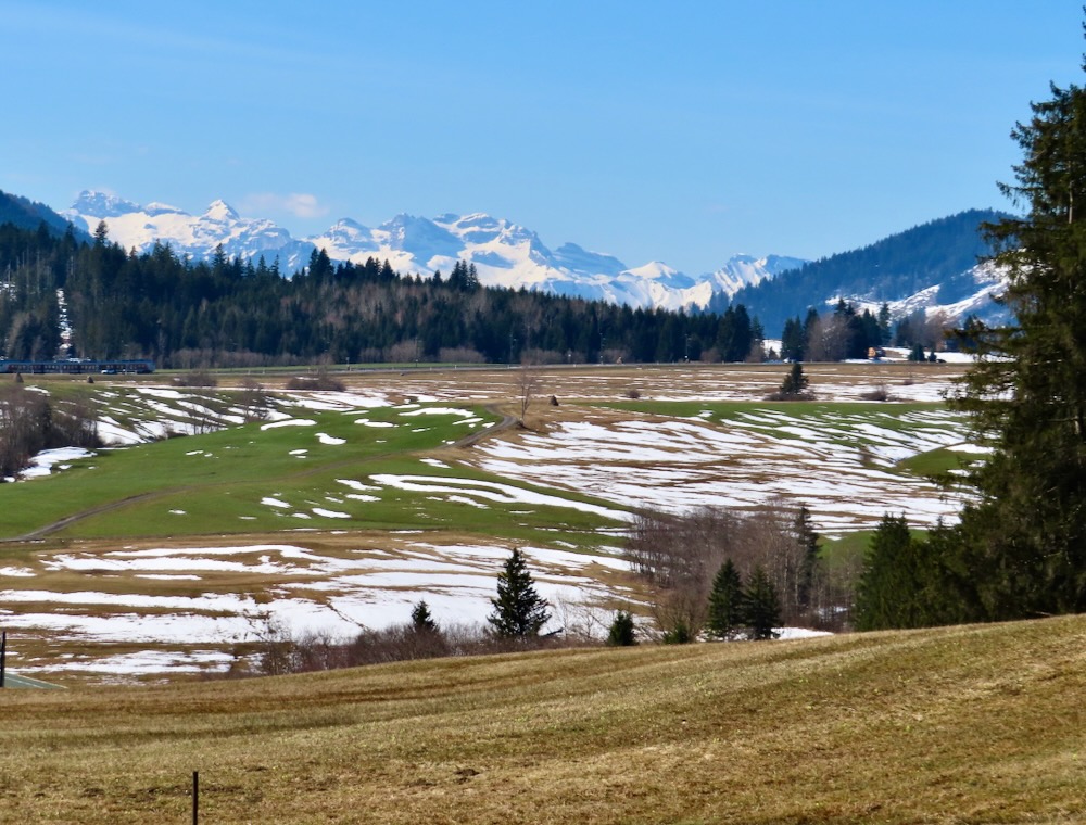 Aber ich gehe fast immer auf Naturwegen, was leider oft nicht mehr der Fall ist. Die Gegend entlang des Baches Biber ist leicht hügelig und daher recht abwechslungsreich. Anfangs der Wanderung sehe ich von Biberbrugg aus das Panorama hinter Einsiedeln gegen Ende sehe ich die Mythen und rechts den Morgartenweg, wo ich vor vielen Jahren zwei Schneeschuhtouren gemacht habe. Beim Bibersteg muss ich wählen: soll ich geradeaus weiter nach Rotenthurm laufen oder nach Raten hinaufsteigen. Eigentlich habe ich genug und ich beschliesse, nun ein Stück auf Hartbelag gegen Steinstoss zu gehen. Ich kenne das Rotenthurmermoor von einer Schneeschuhtour und vom Sommer. Aber im Frühling war ich noch nie da. Das ist ein spezielles Erlebnis mit den offenen Flächen teils weiss vom Schnee teils braun vom Ried und den vielen gurgelnden Wasserläufen.