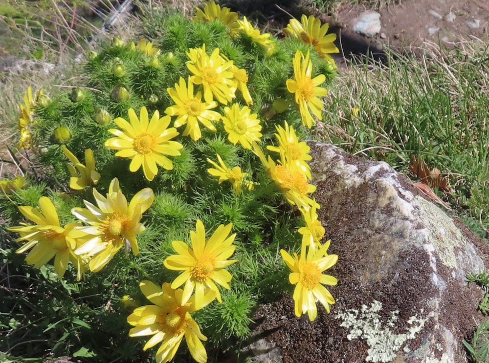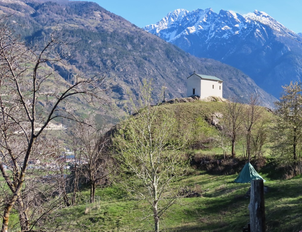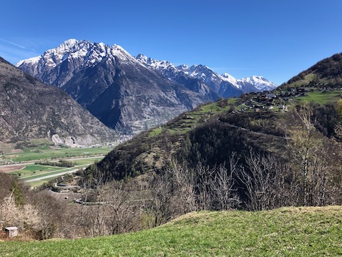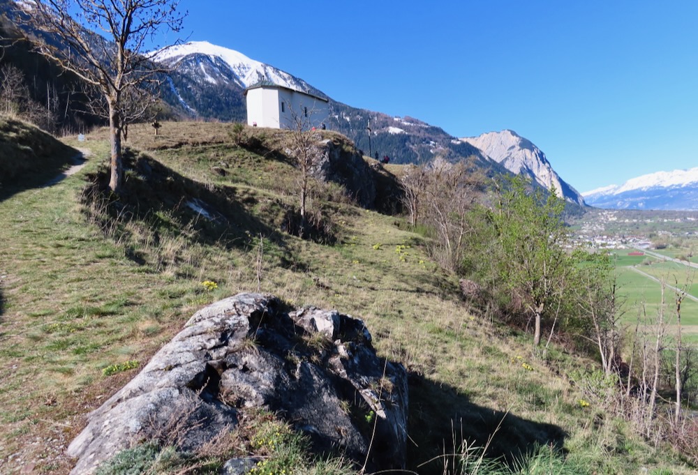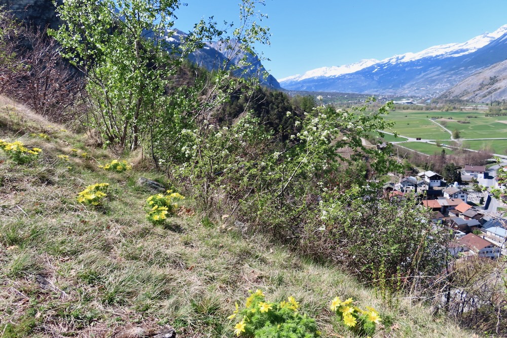 Um 9.24h bin ich am Bahnhof Turtmann und gelange über den Talboden zum Dorf Turtmann. Um 9.44h befinde ich mich auf dem Wanderweg zur Chastelen Kapelle, wo ich zu meiner Überraschung eine sehr grosse Wandergruppe aus dem Unterwallis antreffe ! Ich nehme dann extra einen anderen Weg in Richtung Unterems als die Gruppe aber ich treffe später nochmals auf sie, was eher unangenehm ist auf einem schmalen Pfad ! So bleibe ich auf einer Wiese, wo die Adonisröschen blühen zurück und mache eine Pause, damit ich später in Ruhe nach Unterems zu steigen. kann. Ausserhalb und oberhalb des Ortes halte ich am Wiesenborfd meine Mittagspause und geniesse die Aussicht und die Ruhe. Auf dem Wanderweg taleinwärts treffe ich diese Gruppe nochmals an, die am Hang eine Pause macht. Ich steige rasch weiter hinunter ins Tal und wandere auf der schönen und abwechslungsreichen Route hinter nach Turtmann.
